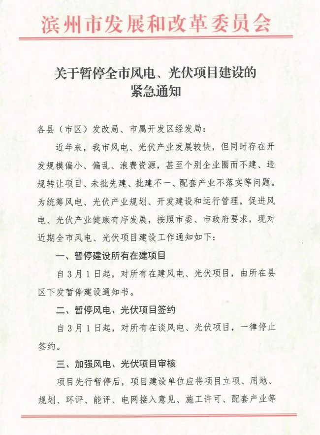 事件:3月1日山東省濱州市發(fā)改委下發(fā)《關(guān)于暫停全市風(fēng)電、光伏項(xiàng)目建設(shè)的緊急通知》,提出:從3月1日起,濱州全市對(duì)所有的在建項(xiàng)目下發(fā)暫停建設(shè)通知書;所有簽約項(xiàng)目,一律停止簽約! 全文具體如下: 關(guān)于暫停全市風(fēng)電、光伏項(xiàng)目建設(shè)的緊急通知 各縣(市區(qū))發(fā)改局、市屬開(kāi)發(fā)區(qū)經(jīng)發(fā)局∶ 近年來(lái),我市風(fēng)電、光伏產(chǎn)業(yè)發(fā)展較快,但同時(shí)存在開(kāi)發(fā)規(guī)模偏小、偏亂、浪費(fèi)資源,甚至個(gè)別企業(yè)圈而不建、違規(guī)轉(zhuǎn)讓項(xiàng)目、未批先建、批建不一、配套產(chǎn)業(yè)不落實(shí)等問(wèn)題。為統(tǒng)籌風(fēng)電、光伏產(chǎn)業(yè)規(guī)劃、開(kāi)發(fā)建設(shè)和運(yùn)行管理,促進(jìn)風(fēng)電、光伏產(chǎn)業(yè)健康有序發(fā)展,按照市委、市政府要求,現(xiàn)對(duì)近期全市風(fēng)電、光伏項(xiàng)目建設(shè)工作通知如下∶ 一、暫停建設(shè)所有在建項(xiàng)目 自3 月1日起,對(duì)所有在建風(fēng)電、光伏項(xiàng)目,由所在縣區(qū)下發(fā)暫停建設(shè)通知書。 二、暫停風(fēng)電、光伏項(xiàng)目簽約 自3 月1日起,對(duì)所有在談風(fēng)電、光伏項(xiàng)目,一律停止簽約。 三、加強(qiáng)風(fēng)電、光伏項(xiàng)目審核 項(xiàng)目先行暫停后,項(xiàng)目建設(shè)單位應(yīng)將項(xiàng)目立項(xiàng)、用地、規(guī)劃、環(huán)評(píng)、能評(píng)、電網(wǎng)接入意見(jiàn)、施工許可、配套產(chǎn)業(yè)等 資料報(bào)縣區(qū)發(fā)改部門初審,初審?fù)ㄟ^(guò)的,由縣區(qū)發(fā)改部門報(bào)市發(fā)改委審核。市發(fā)改委將根據(jù)市委、市政府新的風(fēng)電、光伏產(chǎn)業(yè)政策予以審核,作出準(zhǔn)予建設(shè)或不予建設(shè)的決定。 政府文件: