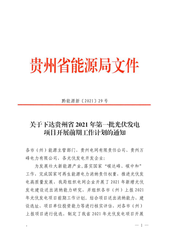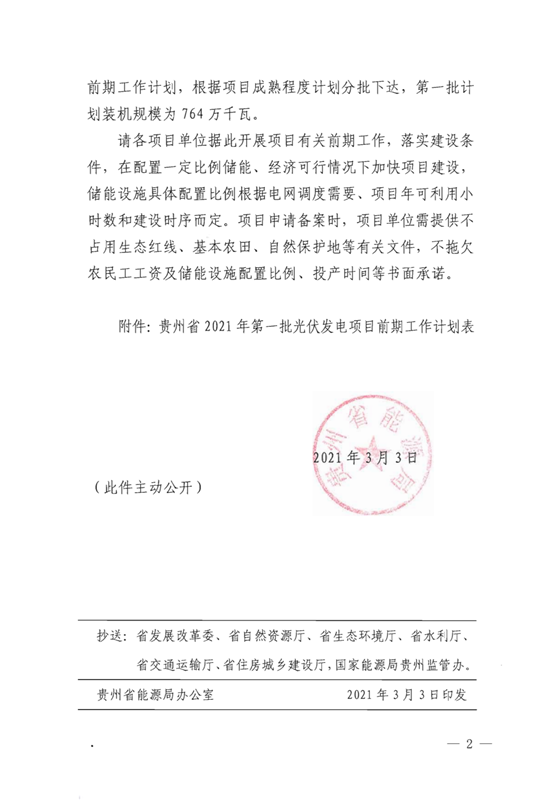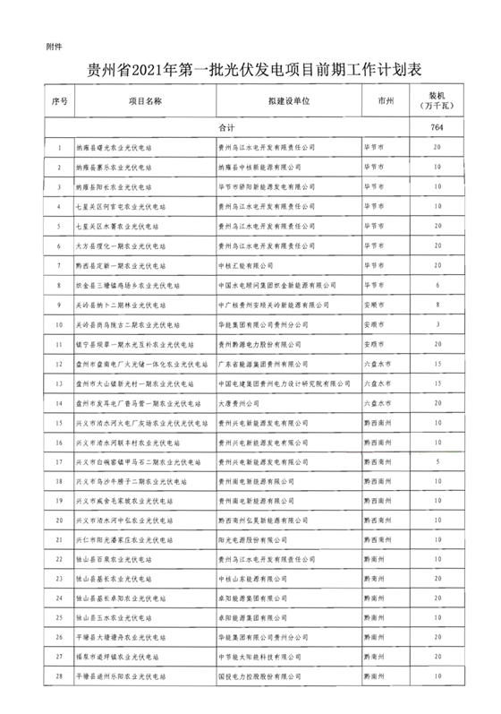 2021年3月3日,貴州省能源局發(fā)布了《關于下達貴州省2021年第一批光伏發(fā)電項目開展前期工作計劃的通知》,計劃裝機規(guī)模為7.64GW。 文件強調(diào),各項目單位在配置一定比例儲能、經(jīng)濟可行情況下加快項目建設,儲能設施具體配置比例根據(jù)電網(wǎng)調(diào)度需要、項目年可利用小時數(shù)和建設時序而定。項目申請備案時,項目單位需提供不占用生態(tài)紅線、基本農(nóng)田、自然保護地等有關文件,不拖欠農(nóng)民工工資及儲能設施配置比例、投產(chǎn)時間等書面承諾。