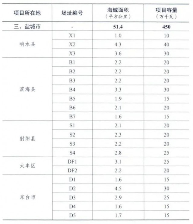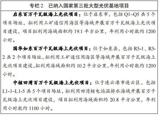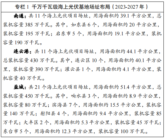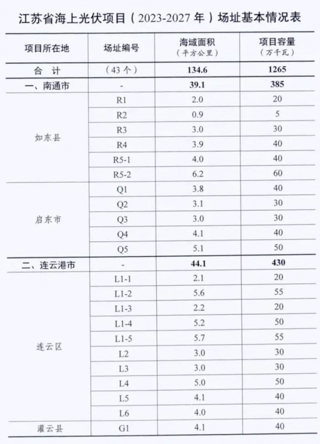 5月26日,江蘇省發(fā)展改革委(能源局)發(fā)布《江蘇省海上光伏開(kāi)發(fā)建設(shè)實(shí)施方案(2023—2027年)》(簡(jiǎn)稱(chēng)《方案》),《方案》明確了未來(lái)5年重點(diǎn)開(kāi)發(fā)的43個(gè)海上光伏項(xiàng)目,總規(guī)模為12.65GW,具體如下表所示。 根據(jù)方案,到2025年,海上光伏集約化開(kāi)發(fā)邁出堅(jiān)實(shí)步伐,全省海上光伏累計(jì)并網(wǎng)規(guī)模力爭(zhēng)達(dá)到500萬(wàn)千瓦左右,沿海新型電力系統(tǒng)建設(shè)加快推進(jìn),綠色低碳轉(zhuǎn)型取得成效;到2027年,建成千萬(wàn)千瓦級(jí)海上光伏基地,全省海上光伏累計(jì)并網(wǎng)規(guī)模達(dá)到1000萬(wàn)千瓦左右,沿海新型電力系統(tǒng)初步構(gòu)建,綠色低碳發(fā)展水平顯著提升。 為打造千萬(wàn)千瓦級(jí)海上光伏基地,《方案》要求,綜合考慮海洋主體功能區(qū)規(guī)劃、國(guó)土空間規(guī)劃、養(yǎng)殖水域?yàn)┩恳?guī)劃、生態(tài)保護(hù)紅線(xiàn)、濕地保護(hù)、自然保護(hù)地、世界自然遺產(chǎn)以及接網(wǎng)消納條件等因素,重點(diǎn)開(kāi)展43個(gè)固定樁基式海上光伏項(xiàng)目場(chǎng)址建設(shè)工作,用海面積約134.6平方公里,裝機(jī)容量1265萬(wàn)千瓦。