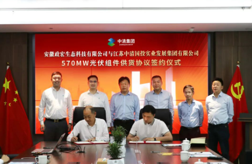 02、簽訂570MW光伏組件供貨協(xié)議 安徽政宏生態(tài)科技有限公司總經(jīng)理夏帆與中清集團(tuán)執(zhí)行總裁李家康簽約570MW光伏組件供貨協(xié)議,進(jìn)一步締結(jié)長(zhǎng)期友好、合作互助的戰(zhàn)略合作關(guān)系。