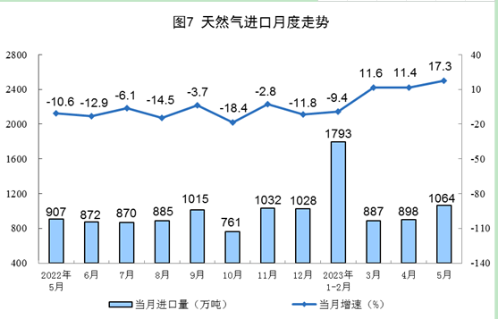 天然氣生產(chǎn)穩(wěn)步增長,進(jìn)口增速加快。5月份,生產(chǎn)天然氣190億立方米,同比增長7.2%,增速比4月份加快0.2個(gè)百分點(diǎn),日均產(chǎn)量6.1億立方米。進(jìn)口天然氣1064萬噸,同比增長17.3%,增速比4月份加快5.9個(gè)百分點(diǎn)。 1—5月份,生產(chǎn)天然氣973億立方米,同比增長5.3%。進(jìn)口天然氣4629萬噸,同比增長3.3%。