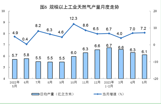 附注 1.指標(biāo)解釋 日均產(chǎn)品產(chǎn)量:是以當(dāng)月公布的規(guī)模以上工業(yè)企業(yè)總產(chǎn)量除以該月日歷天數(shù)計(jì)算得到。 2.統(tǒng)計(jì)范圍 報(bào)告中的產(chǎn)量數(shù)據(jù)統(tǒng)計(jì)口徑均為規(guī)模以上工業(yè),其統(tǒng)計(jì)范圍為年主營業(yè)務(wù)收入2000萬元及以上的工業(yè)企業(yè)。 由于規(guī)模以上工業(yè)企業(yè)范圍每年發(fā)生變化,為保證本年數(shù)據(jù)與上年可比,計(jì)算產(chǎn)品產(chǎn)量等各項(xiàng)指標(biāo)同比增長速度所采用的同期數(shù)與本期的企業(yè)統(tǒng)計(jì)范圍相一致,和上年公布的數(shù)據(jù)存在口徑差異。 3.數(shù)據(jù)來源 進(jìn)口數(shù)據(jù)來源于海關(guān)總署,其中2023年5月份數(shù)據(jù)為快訊數(shù)據(jù)。 4.天然氣單位換算關(guān)系:1噸約等于1380立方米。