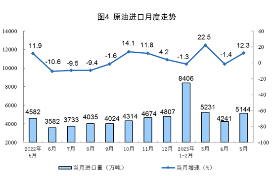 原油生產(chǎn)有所加快,進(jìn)口由降轉(zhuǎn)增。5月份,生產(chǎn)原油1807萬噸,同比增長2.7%,增速比4月份加快1.3個(gè)百分點(diǎn),日均產(chǎn)量58.3萬噸。進(jìn)口原油5144萬噸,同比增長12.3%,4月份為下降1.4%。 1—5月份,生產(chǎn)原油8771萬噸,同比增長2.1%。進(jìn)口原油23021萬噸,同比增長6.2%。 原油加工保持較快增長,增速有所回落。5月份,加工原油6200萬噸,同比增長15.4%,增速比4月份回落3.5個(gè)百分點(diǎn),日均加工原油200.0萬噸。1—5月份,加工原油30263萬噸,同比增長9.8%。