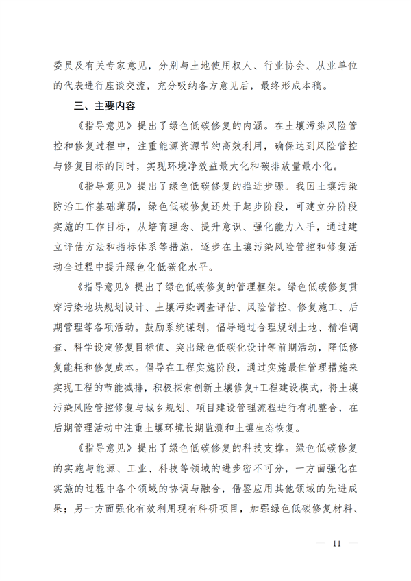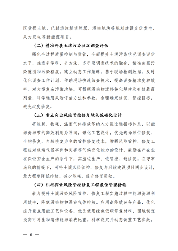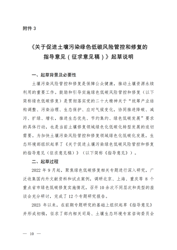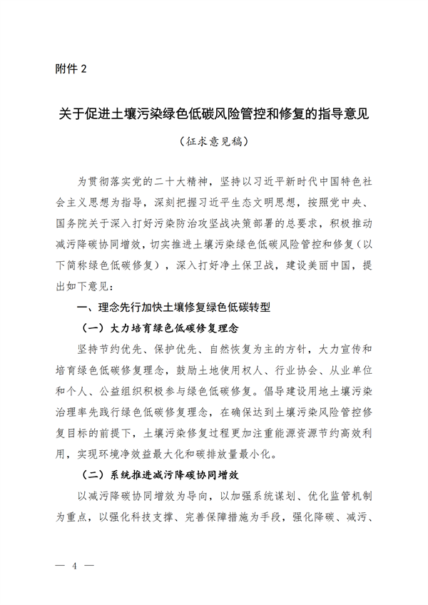 6月26日,生態(tài)環(huán)境部就《關(guān)于促進(jìn)土壤污染綠色低碳風(fēng)險(xiǎn)管控和修復(fù)的指導(dǎo)意見(征求意見稿)》公開征求意見。征求意見稿提出,合理規(guī)劃受污染土地用途。因勢(shì)利導(dǎo)研究利用廢棄礦山、采煤沉陷區(qū)受損土地、已封場(chǎng)垃圾填埋場(chǎng)、污染地塊等規(guī)劃建設(shè)光伏發(fā)電、風(fēng)力發(fā)電等新能源項(xiàng)目。 積極探索風(fēng)險(xiǎn)管控修復(fù)工程最佳管理措施。應(yīng)用高能效裝備產(chǎn)品,優(yōu)化提升重點(diǎn)用能工藝和設(shè)備,優(yōu)先使用綠色低碳修復(fù)材料,因地制宜提高可再生和清潔能源消費(fèi)比重。 攻關(guān)關(guān)鍵技術(shù)材料和裝備研發(fā)。研發(fā)推廣低排放、低能耗的新型修復(fù)裝備,提高裝備數(shù)字化、可視化、智能化水平。對(duì)未達(dá)到能耗標(biāo)準(zhǔn)的傳統(tǒng)修復(fù)設(shè)施進(jìn)行清潔能源替代和升級(jí)改造,鼓勵(lì)將綠色低碳修復(fù)相關(guān)內(nèi)容納入國(guó)家重點(diǎn)推廣的低碳技術(shù)目錄。 全文如下: 關(guān)于公開征求《關(guān)于促進(jìn)土壤污染綠色低碳風(fēng)險(xiǎn)管控和修復(fù)的指導(dǎo)意見(征求意見稿)》意見的通知 為貫徹落實(shí)黨的二十大精神,加快土壤污染風(fēng)險(xiǎn)管控和修復(fù)領(lǐng)域綠色化低碳化發(fā)展,按照《中華人民共和國(guó)土壤污染防治法》《“十四五”生態(tài)環(huán)境保護(hù)規(guī)劃》《減污降碳協(xié)同增效實(shí)施方案》要求,我部組織起草了《關(guān)于促進(jìn)土壤污染綠色低碳風(fēng)險(xiǎn)管控和修復(fù)的指導(dǎo)意見(征求意見稿)》,現(xiàn)公開征求意見。征求意見稿及其起草說明可登錄我部網(wǎng)站(.cn/)“意見征集”欄目檢索查閱。 各機(jī)關(guān)團(tuán)體、行業(yè)協(xié)會(huì)、企事業(yè)單位和個(gè)人均可提出意見和建議。有關(guān)意見和建議請(qǐng)書面反饋我部,電子文檔請(qǐng)同時(shí)發(fā)至聯(lián)系人郵箱。征求意見截止時(shí)間為2023年7月10日。 聯(lián)系人:生態(tài)環(huán)境部土壤生態(tài)環(huán)境司 任靜、常方方 電話:(010)65645698、65645693 傳真:(010)65645732 郵箱:wrdk@mee.gov.cn 地址:北京市東城區(qū)東長(zhǎng)安街12號(hào) 郵政編碼:100006 附件:1.征求意見單位名單 2.關(guān)于促進(jìn)土壤污染綠色低碳風(fēng)險(xiǎn)管控和修復(fù)的指導(dǎo)意見(征求意見稿) 3.《關(guān)于促進(jìn)土壤污染綠色低碳風(fēng)險(xiǎn)管控和修復(fù)的指導(dǎo)意見(征求意見稿)》起草說明 生態(tài)環(huán)境部辦公廳 2023年6月24日 (此件社會(huì)公開)