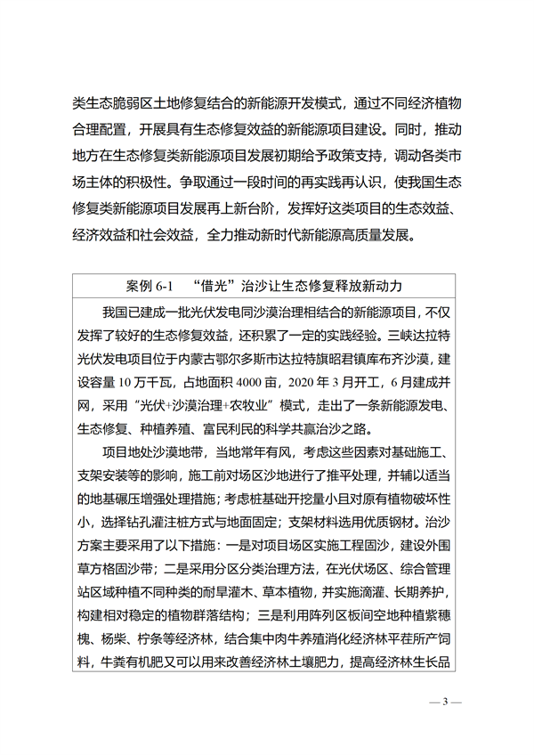 6月30日,國家能源局發(fā)布《<關(guān)于促進(jìn)新時(shí)代新能源高質(zhì)量發(fā)展的實(shí)施方案>案例解讀》第六、七章。 詳情如下: 《<關(guān)于促進(jìn)新時(shí)代新能源高質(zhì)量發(fā)展的實(shí)施方案>案例解讀》第六、七章發(fā)布 為指導(dǎo)各地更好地貫徹落實(shí)《關(guān)于促進(jìn)新時(shí)代新能源高質(zhì)量發(fā)展的實(shí)施方案》(國辦函〔2022〕39號),及時(shí)總結(jié)推動新能源高質(zhì)量發(fā)展的成功經(jīng)驗(yàn)和優(yōu)秀做法,我們組織國家發(fā)展改革委能源研究所、電力規(guī)劃設(shè)計(jì)總院、水電水利規(guī)劃設(shè)計(jì)總院、國家電投集團(tuán)、三峽集團(tuán)、中廣核集團(tuán)、光伏行業(yè)協(xié)會、風(fēng)能協(xié)會等單位開展了案例解讀編制工作,形成了《<關(guān)于促進(jìn)新時(shí)代新能源高質(zhì)量發(fā)展的實(shí)施方案>案例解讀》(以下簡稱《案例解讀》),擬按章節(jié)以連載方式陸續(xù)發(fā)布,供大家在推動可再生能源高質(zhì)量發(fā)展工作中參考。第一至第五章內(nèi)容已發(fā)布,現(xiàn)發(fā)布第六、七章內(nèi)容。至此,《案例解讀》已全部發(fā)布,如有意見和建議,請及時(shí)反饋。 聯(lián)系方式:010-81929522/81929525(傳真) 電子郵箱:xinny@nea.gov.cn 附件:《關(guān)于促進(jìn)新時(shí)代新能源高質(zhì)量發(fā)展的實(shí)施方案》案例解讀第六、七章 《<實(shí)施方案>案例解讀》編委會 2023年6月29日