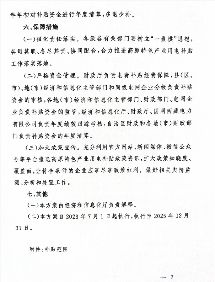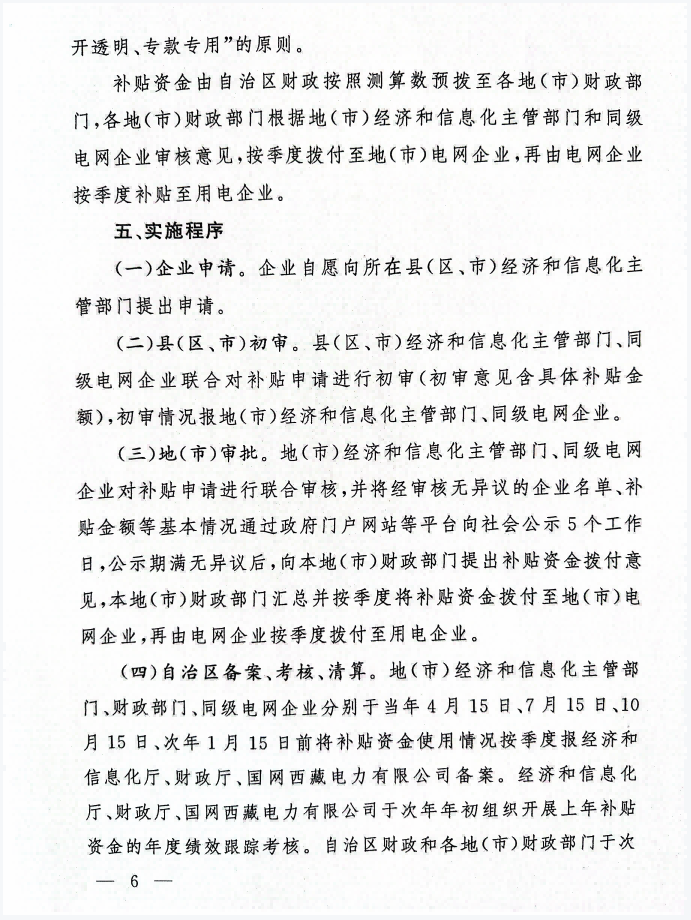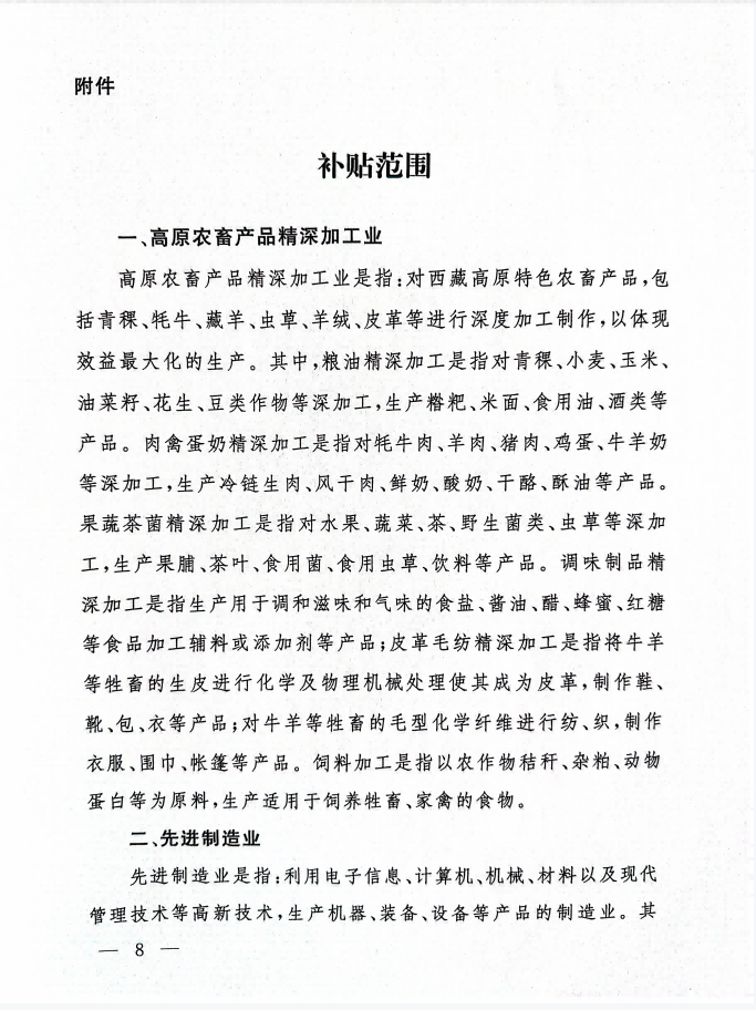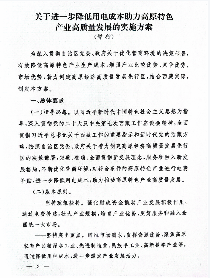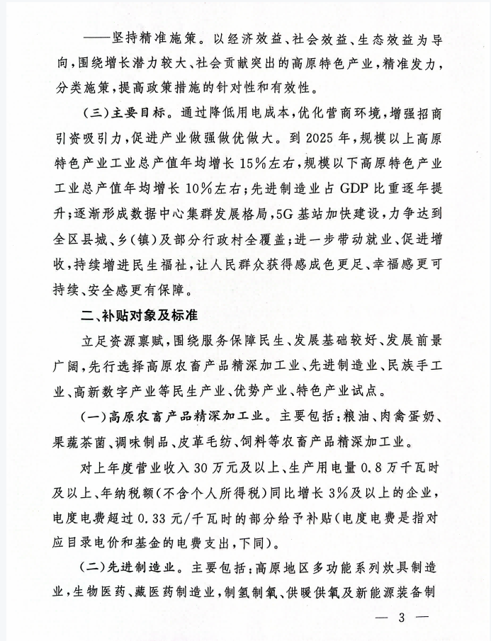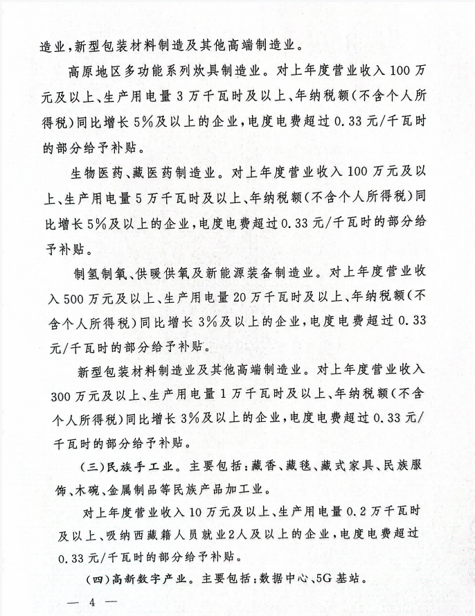 近日,西藏自治區(qū)人民政府印發(fā)《關(guān)于進(jìn)一步降低用電成本助力高原特色產(chǎn)業(yè)高質(zhì)量發(fā)展實施方案(暫行)》,《方案》提出,通過降低用電成本,優(yōu)化營商環(huán)境,增強(qiáng)招商引資吸引力,促進(jìn)產(chǎn)業(yè)做強(qiáng)做優(yōu)做大。先行選擇高原農(nóng)畜產(chǎn)品精深加工業(yè)、先進(jìn)制造業(yè)、民族手工業(yè)、高新數(shù)字產(chǎn)業(yè)等民生產(chǎn)業(yè)、優(yōu)勢產(chǎn)業(yè)、特色產(chǎn)業(yè)試點。 其中,先進(jìn)制造業(yè)主要包括:高原地區(qū)多功能系列炊具制造業(yè),生物醫(yī)藥、藏醫(yī)藥制造業(yè),制氫制氧、供暖供氧及新能源裝備制造業(yè),新型包裝材料制造及其他高端制造業(yè)。 制氫制氧、供暖供氧及新能源裝備制造業(yè)。對上年度營業(yè)收入500萬元及以上、生產(chǎn)用電量20萬千瓦時及以上、年納稅額(不含個人所得稅)同比增長3%及以上的企業(yè),電度電費超過0.33元/千瓦時的部分給予補(bǔ)貼。 新能源裝備制造業(yè)是指為太陽能、風(fēng)能、地?zé)崮馨l(fā)電提供組件產(chǎn)品的制造業(yè)。 詳情如下: