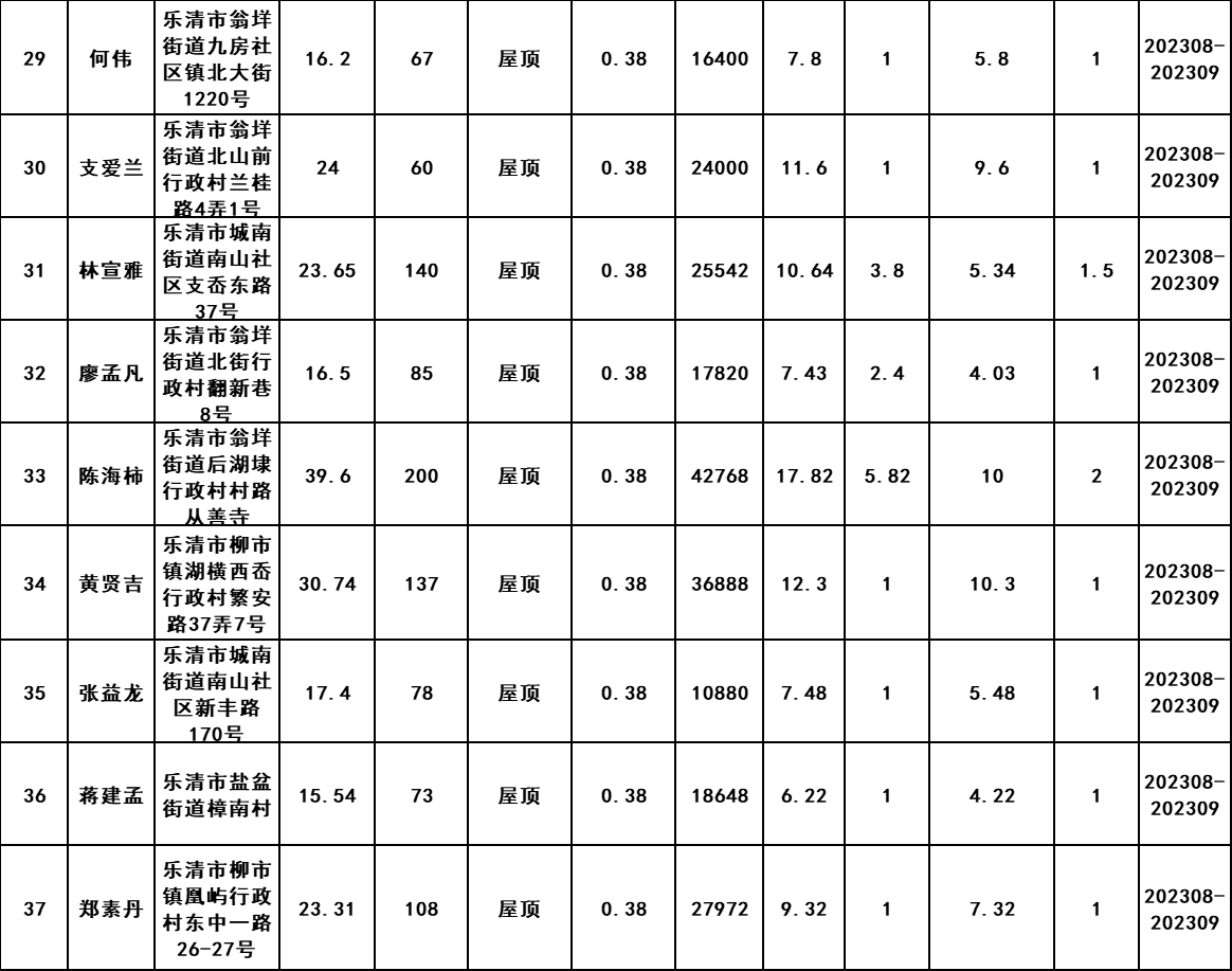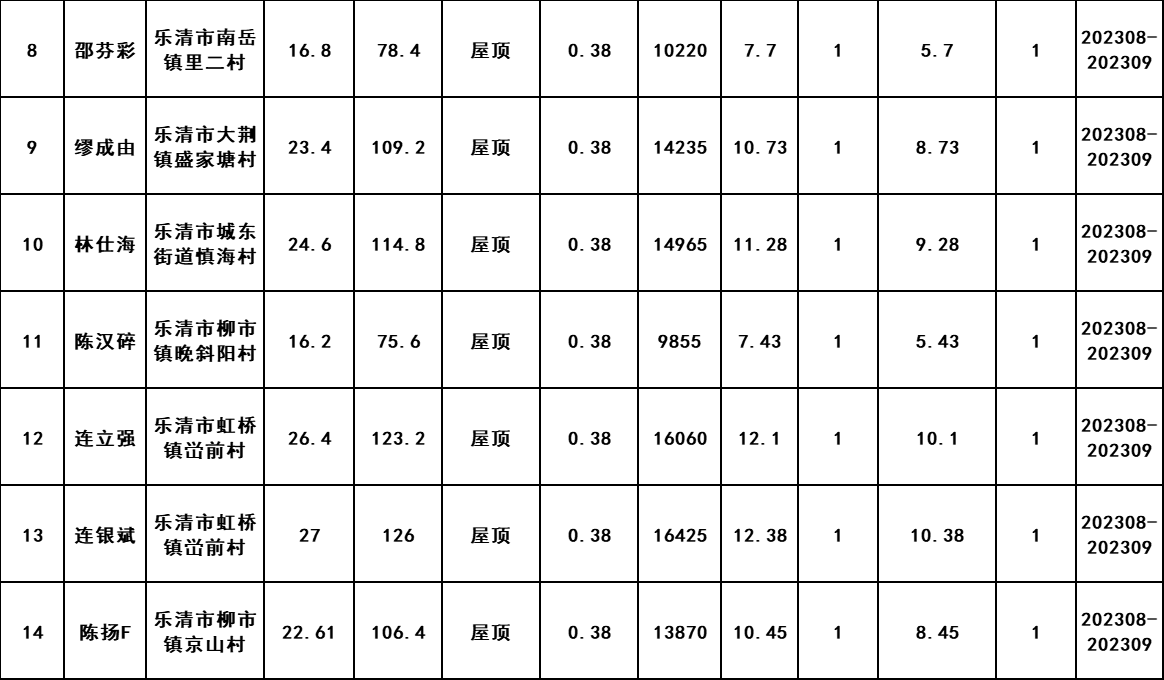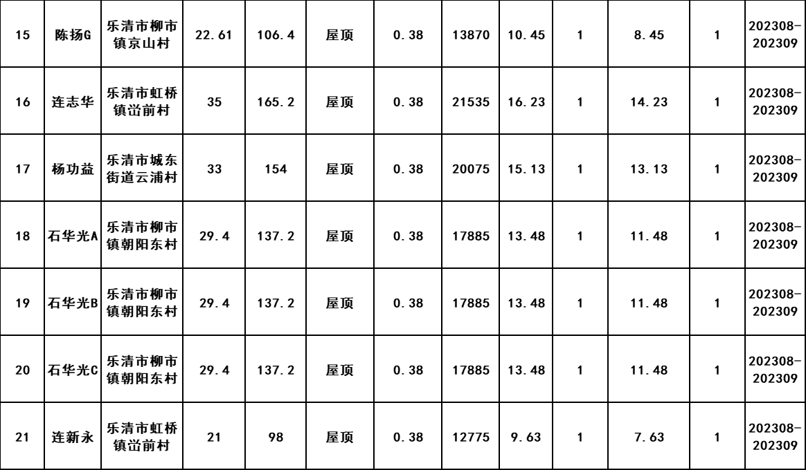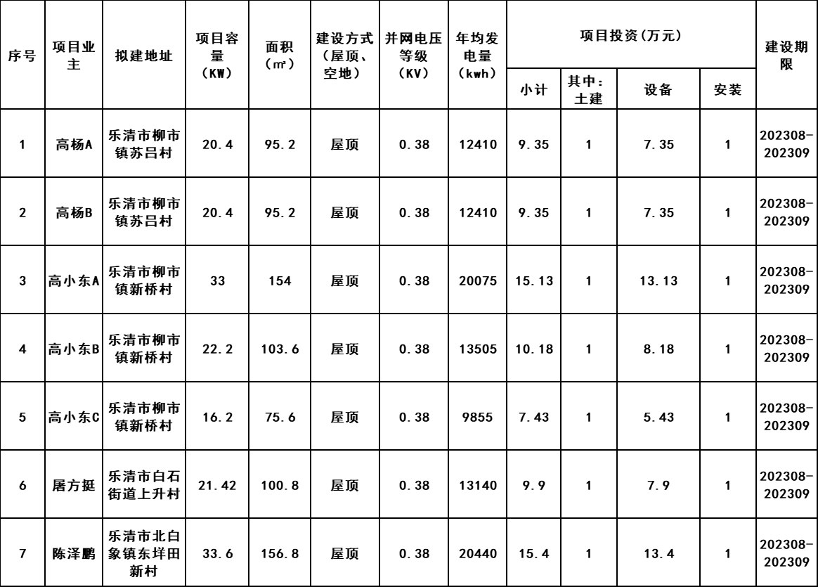 8月7日,樂清市發(fā)展和改革局關(guān)于樂清市2023年第十批居民家庭屋頂分布式光伏發(fā)電項(xiàng)目備案的通知,本批次共有居民家庭屋頂分布式光伏發(fā)電項(xiàng)目39個(gè),總裝機(jī)容量915.14kW,年平均發(fā)電量684426kWh。 2023年浙江樂清市一共公示了十批戶用光伏項(xiàng)目備案情況,共有468個(gè)項(xiàng)目,總計(jì)裝機(jī)規(guī)模9855.58KWp。詳情如下: 原文如下: 關(guān)于樂清市2023年第十批居民家庭屋頂分布式光伏發(fā)電項(xiàng)目備案的通知 國(guó)網(wǎng)浙江樂清市供電公司: 貴公司報(bào)送的樂清市居民家庭屋頂分布式光伏發(fā)電項(xiàng)目備案申請(qǐng)材料已收悉,根據(jù)《浙江省光伏發(fā)電項(xiàng)目管理暫行辦法》(浙發(fā)改能源〔2014〕450號(hào))《樂清市人民政府關(guān)于扶持分布式光伏發(fā)電的若干意見》(樂政發(fā)〔2014〕29號(hào)),現(xiàn)予以集中備案,并就備案有關(guān)事項(xiàng)通知如下: 一、本批次共有居民家庭屋頂分布式光伏發(fā)電項(xiàng)目39個(gè),總裝機(jī)容量915.14Wp,年平均發(fā)電量684426kWh。項(xiàng)目情況詳見附表。 二、本備案通知書有效期一年,自備案之日起計(jì);有效期內(nèi)未開工建設(shè)的,貴公司應(yīng)在備案通知書有效期滿30日前向我局申請(qǐng)延期。逾期不報(bào),備案通知書自動(dòng)失效。 三、已備案項(xiàng)目發(fā)生變更的,應(yīng)辦理相應(yīng)的變更手續(xù)。 四、居民家庭屋頂分布式光伏發(fā)電項(xiàng)目屬自然人項(xiàng)目,我局委托貴公司組織驗(yàn)收。 五、本備案通知書不可作為項(xiàng)目所依托的建筑物符合城鄉(xiāng)、土地等相關(guān)規(guī)劃的認(rèn)定依據(jù)。 附件:樂清市2023年第十批居民家庭屋頂分布式光伏發(fā)電項(xiàng)目表 樂清市發(fā)展和改革局 2023年8月2日 附件 樂清市2023年第十批居民家庭屋頂分布式光伏發(fā)電項(xiàng)目表