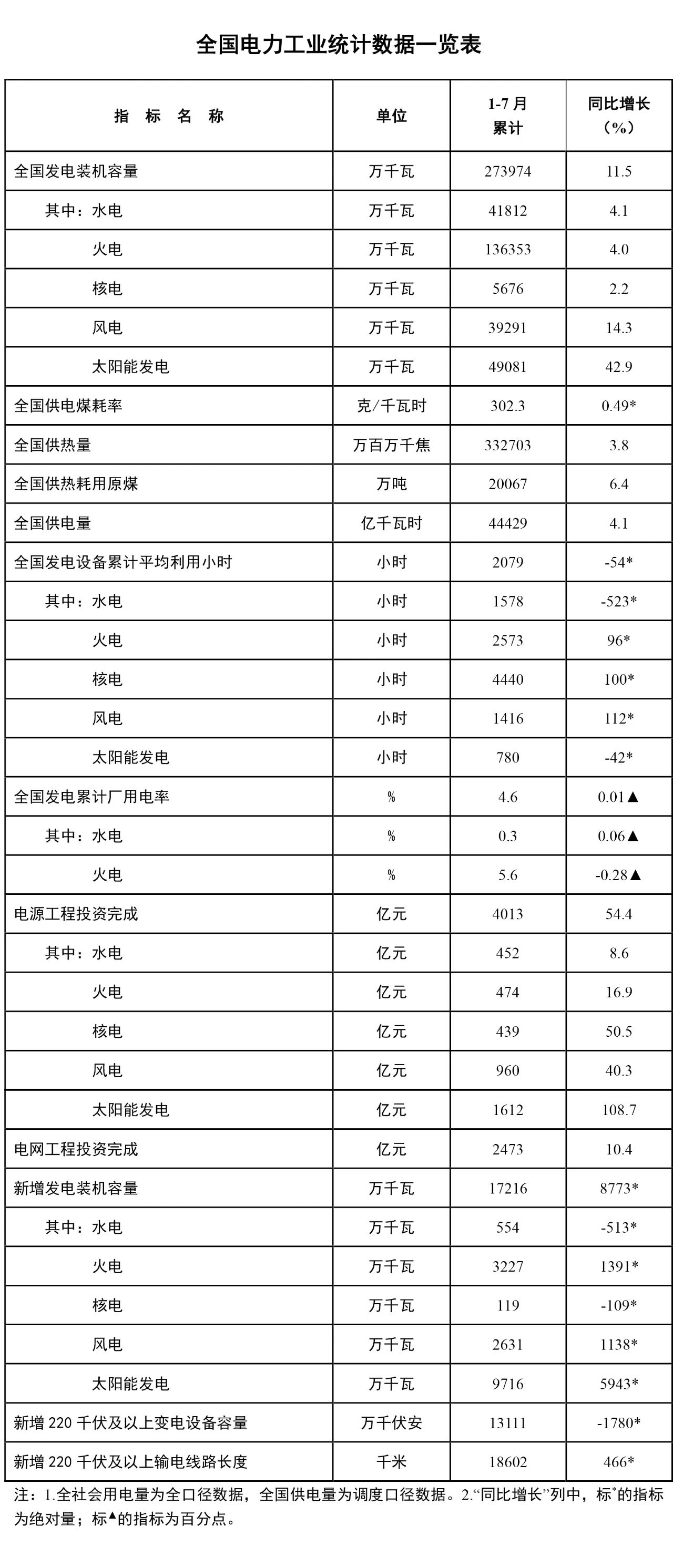 8月17日,國家能源局發(fā)布1-7月份全國電力工業(yè)統(tǒng)計數(shù)據(jù)。 截至7月底,全國累計發(fā)電裝機容量約27.4億千瓦,同比增長11.5%。其中,太陽能發(fā)電裝機容量約4.9億千瓦,同比增長42.9%;風(fēng)電裝機容量約3.9億千瓦,同比增長14.3%。 1-7月份,全國發(fā)電設(shè)備累計平均利用2079小時,比上年同期減少54小時。其中,水電1578小時,比上年同期減少523小時;太陽能發(fā)電780小時,比上年同期減少42小時;風(fēng)電1416小時,比上年同期增加112小時;核電4440小時,比上年同期增加100小時;火電2573小時,比上年同期增加96小時。 1-7月份,全國主要發(fā)電企業(yè)電源工程完成投資4013億元,同比增長54.4%。其中,太陽能發(fā)電1612億元,同比增長108.7%;核電439億元,同比增長50.5%。電網(wǎng)工程完成投資2473億元,同比增長10.4%。