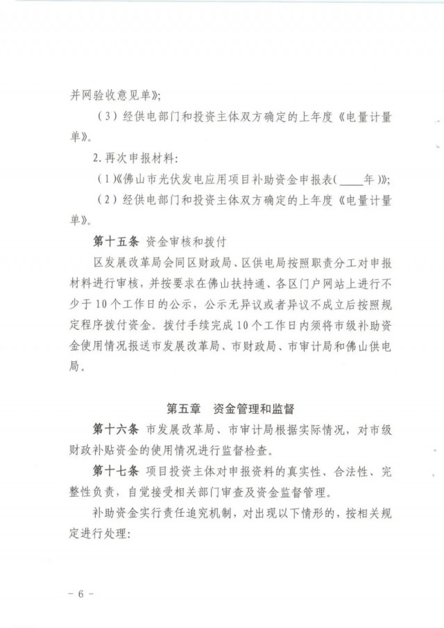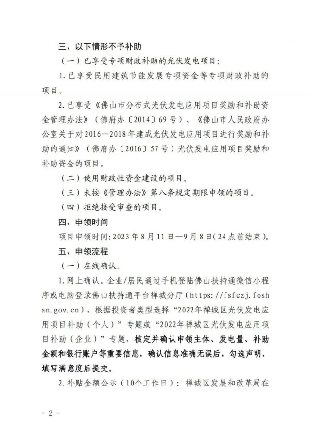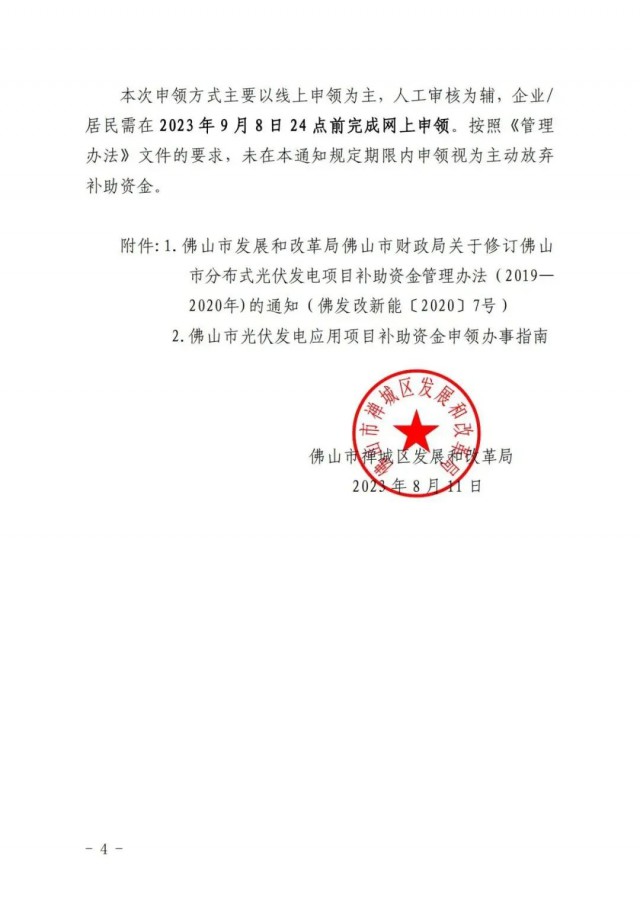 近日,廣東省佛山市禪城區(qū)發(fā)展和改革局關(guān)于開展2022年度禪城區(qū)光伏發(fā)電應用項目補助資金申領(lǐng)工作的通知。 通知明確,對2019—2020年在禪城區(qū)利用工業(yè)、商業(yè)、交通、公共機構(gòu)、居民家庭等各類型建筑物和構(gòu)筑物建成且符合國家、省、市光伏項目管理辦法要求的分布式光伏發(fā)電項目按實際發(fā)電量補助0.3元/千瓦時(其中市級補助0.06元/千瓦時、區(qū)級補助0.24元/千瓦時),自項目建成的次月1日起計算補助金額,連續(xù)補助3年。(項目建成時間按供電部門出具的《并網(wǎng)驗收意見單》上并網(wǎng)驗收時間為準) 項目申領(lǐng)時間為2023年8月11日—9月8日(24點前結(jié)束)。本次申領(lǐng)方式主要以線上申領(lǐng)為主,人工審核為輔,企業(yè)/居民需在2023年9月8日24點前完成網(wǎng)上申領(lǐng)。按照《管理辦法》文件的要求,未在本通知規(guī)定期限內(nèi)申領(lǐng)視為主動放棄補助資金。 具體文件如下