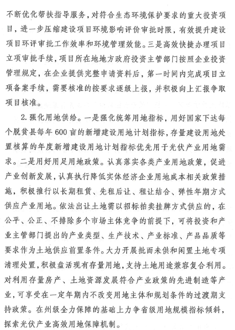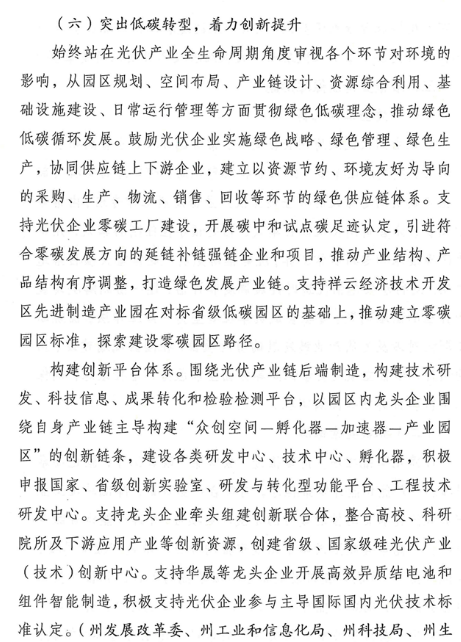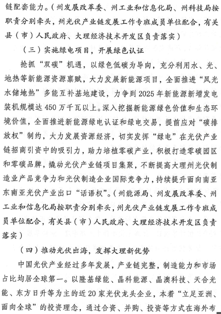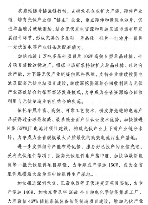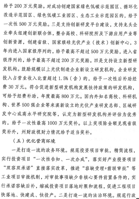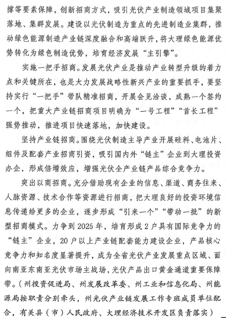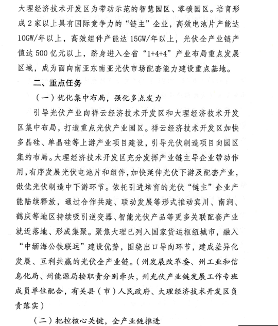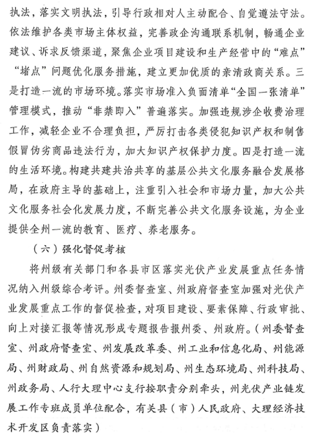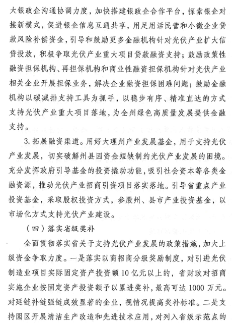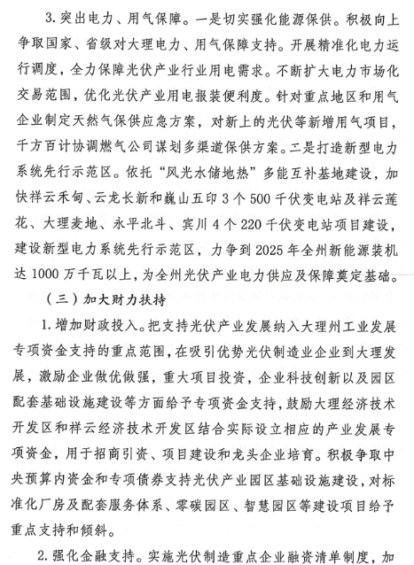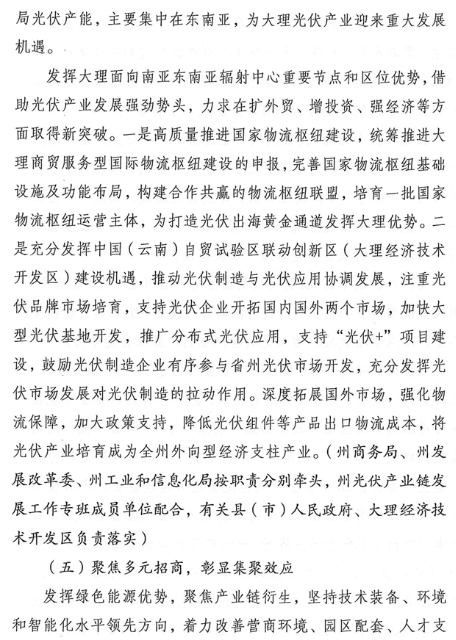 8月18日,云南大理州人民政府發(fā)布《大理州加快光伏產業(yè)高質量發(fā)展三年行動(2023—2025年)》。文件指出,云南大理州光伏產業(yè)發(fā)展目標為:2023 年,光伏產業(yè)產值力爭達 200 億元以上;到2024 年,光伏產業(yè)產值力爭達300 億元以上;到2025年,推動“多晶硅一單晶硅一電池片一組件一配套產業(yè)一光伏電站”全產業(yè)鏈優(yōu)化布局搭建形成,建設以祥云經濟技術開發(fā)區(qū)、大理經濟技術開發(fā)區(qū)為帶動示范的智慧園區(qū)、零碳園區(qū)。培育形成 2家以上具有國際競爭力的“鏈主”企業(yè),高效電池片產能達10GW/年以上,高效組件產能達 15GW/年以上,光伏全產業(yè)鏈產值達 500億元以上,躋身進入全省“1+4+4”產業(yè)布局重點發(fā)展區(qū)域,成為面向南亞東南亞光伏市場配套能力建設重點基地。 為實現這一目標,大理州在用地、項目審批、用電、用氣、金融方面給予支持。除此之外,對于落地的光伏制造企業(yè),大理州還規(guī)劃了一系列獎補措施:一、對引進光伏制造業(yè)項目實際固定資產投資額 10 億元以上的,省財政對招商實施企業(yè)按固定資產投資額予以累進獎補,最高可達 1000 萬元。對延鏈補鏈強鏈成效顯著的企業(yè),視情況提高獎補標準。二是支持園區(qū)開展清潔生產改造和先進技術應用,對列入省級示范點的給予200萬元獎勵。對成功創(chuàng)建國家綠色低碳示范園區(qū)、循環(huán)化改造示范園區(qū)、綠色低碳工業(yè)園區(qū)、生態(tài)工業(yè)示范園區(qū)的,給予一次性 500 萬元獎勵。三是支持創(chuàng)新研發(fā)平臺建設,支持龍頭企業(yè)牽頭組建創(chuàng)新聯合體,整合高校、科研院所及下游應用產業(yè)等創(chuàng)新資源,創(chuàng)建省級、國家級硅光伏產業(yè)(技術)創(chuàng)新中心,3年內進入國家級序列的,給予最高不超過500萬元獎勵,進入省級序列的,給予最高不超過 200 萬元獎勵。四是支持設立新型研發(fā)機構。鼓勵規(guī)模以上光伏制造企業(yè)新設立研發(fā)機構,企業(yè)研發(fā)投入占營業(yè)收入比重超過 1.5%(含)的,給予一次性后補助經費 30 萬元。符合促進新型研發(fā)機構發(fā)展扶持政策的研發(fā)機構可給予經費補助,年度最高800萬元。國內外知名高校、科研機構、世界 500 強企業(yè)等來滇新設立的光伏產業(yè)研發(fā)總部、區(qū)域研發(fā)中心或高水平研究院等,認定為新型研發(fā)機構并評估為優(yōu)秀的,給予一次性最高1000萬元獎補。 原文如下: