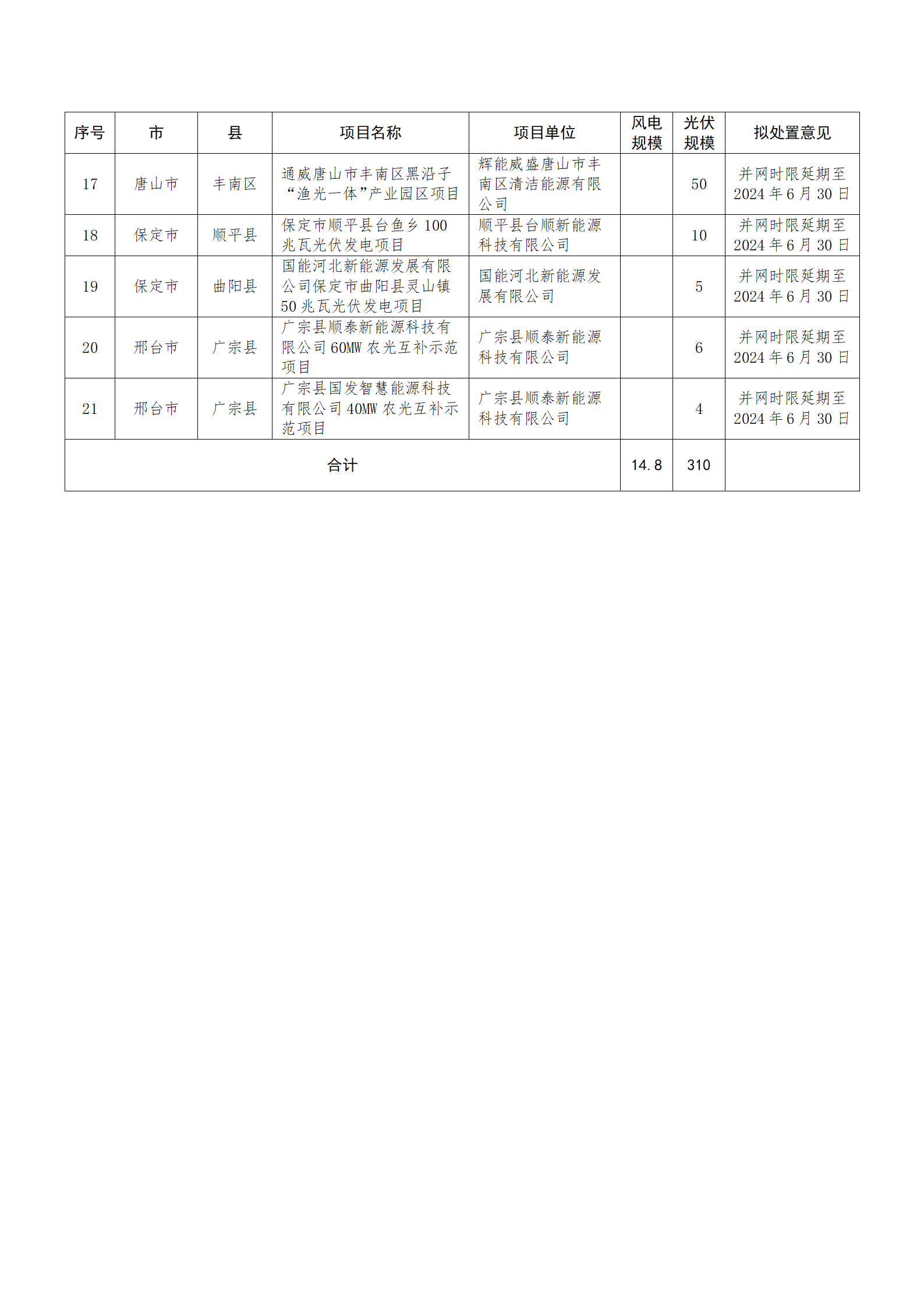8月23日,河北省發(fā)改委公示河北省2023年6月底到期風(fēng)電、光伏發(fā)電項(xiàng)目擬調(diào)整情況。 《公示》明確,為進(jìn)一步加強(qiáng)風(fēng)電、光伏發(fā)電項(xiàng)目管理,我委組織各市對(duì)2023年6月底已到期風(fēng)電、光伏發(fā)電項(xiàng)目建設(shè)進(jìn)度進(jìn)行了摸底統(tǒng)計(jì),并對(duì)受疫情影響、逾期未建成項(xiàng)目提出了處置意見。 其中,擬調(diào)整風(fēng)電項(xiàng)目共有2個(gè),共計(jì)148MW;擬調(diào)整光伏項(xiàng)目共有21個(gè),共計(jì)3.1GW,擬取消的光伏項(xiàng)目6個(gè),規(guī)??傆?jì)845MW。 原文見下: 河北省2023年6月底到期風(fēng)電、光伏發(fā)電項(xiàng)目擬調(diào)整情況公示 為進(jìn)一步加強(qiáng)風(fēng)電、光伏發(fā)電項(xiàng)目管理,我委組織各市對(duì)2023年6月底已到期風(fēng)電、光伏發(fā)電項(xiàng)目建設(shè)進(jìn)度進(jìn)行了摸底統(tǒng)計(jì),并對(duì)受疫情影響、逾期未建成項(xiàng)目提出了處置意見?,F(xiàn)將相關(guān)項(xiàng)目擬調(diào)整意見予以公示。具體項(xiàng)目名單及調(diào)整意見見附件。 公示時(shí)間為2023年8月23日至8月27日。期間,如有異議,請(qǐng)向省發(fā)展改革委(能源局)新能源處反映。 聯(lián)系電話:0311—88600512(傳真) 電子郵箱:nyjxnyc@hbdrc.gov.cn 附件:1.風(fēng)電、光伏發(fā)電項(xiàng)目擬取消情況統(tǒng)計(jì)表 2.風(fēng)電、光伏發(fā)電項(xiàng)目擬調(diào)整情況統(tǒng)計(jì)表