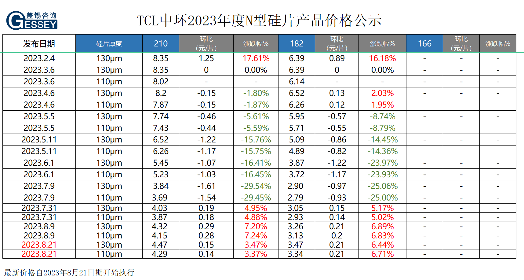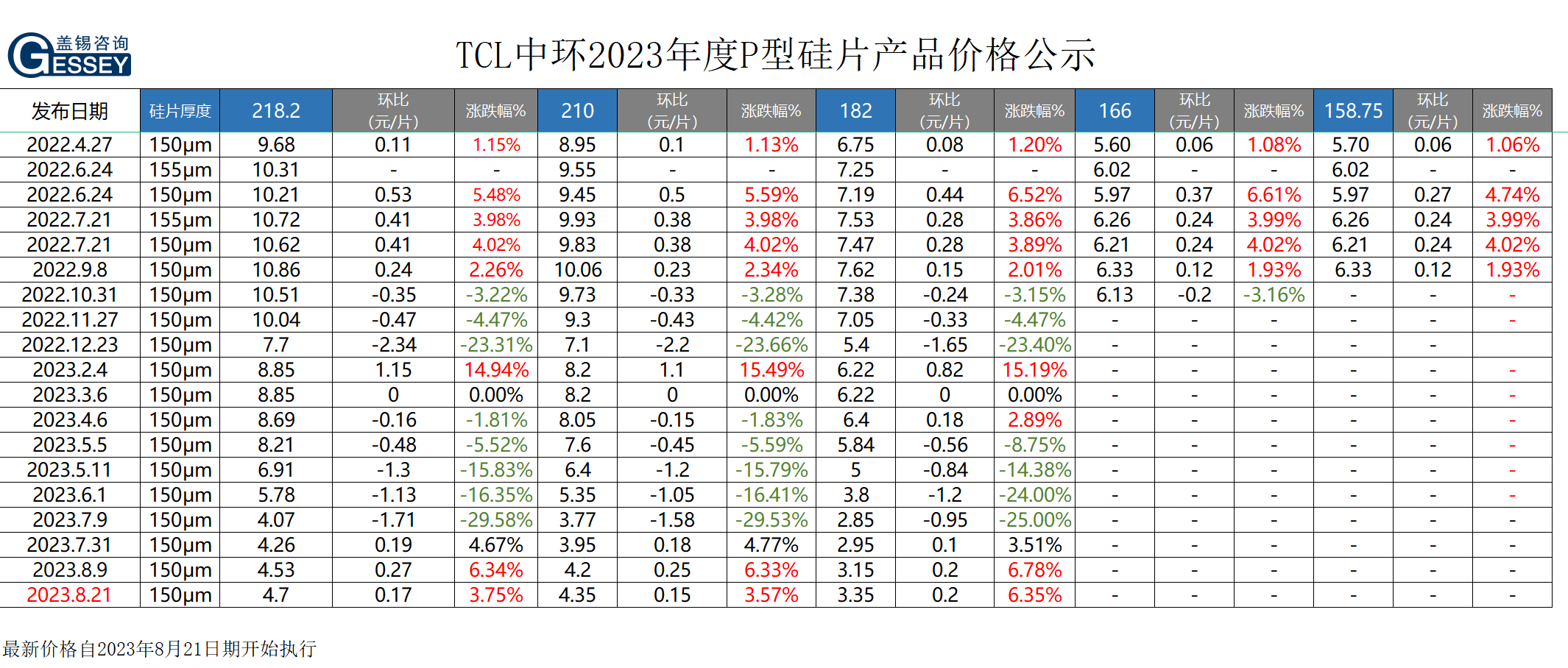 TCL中環(huán)關(guān)于2023年8月21日單晶硅片價(jià)格公示2023-08-21 21:22瀏覽數(shù):311次