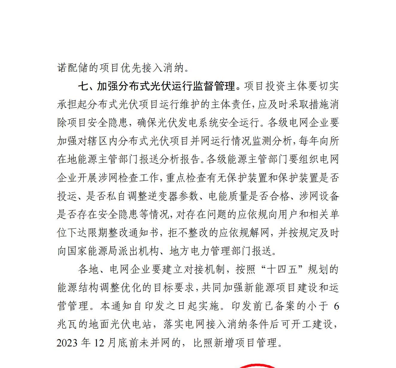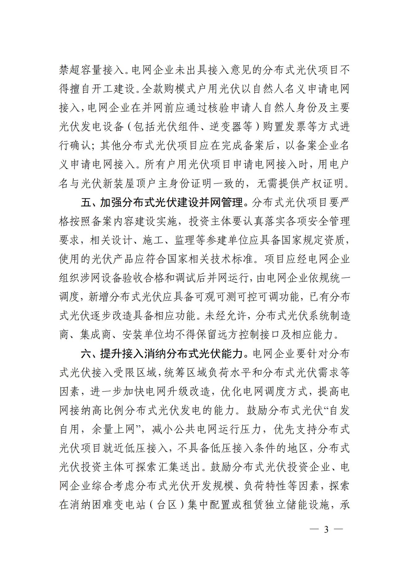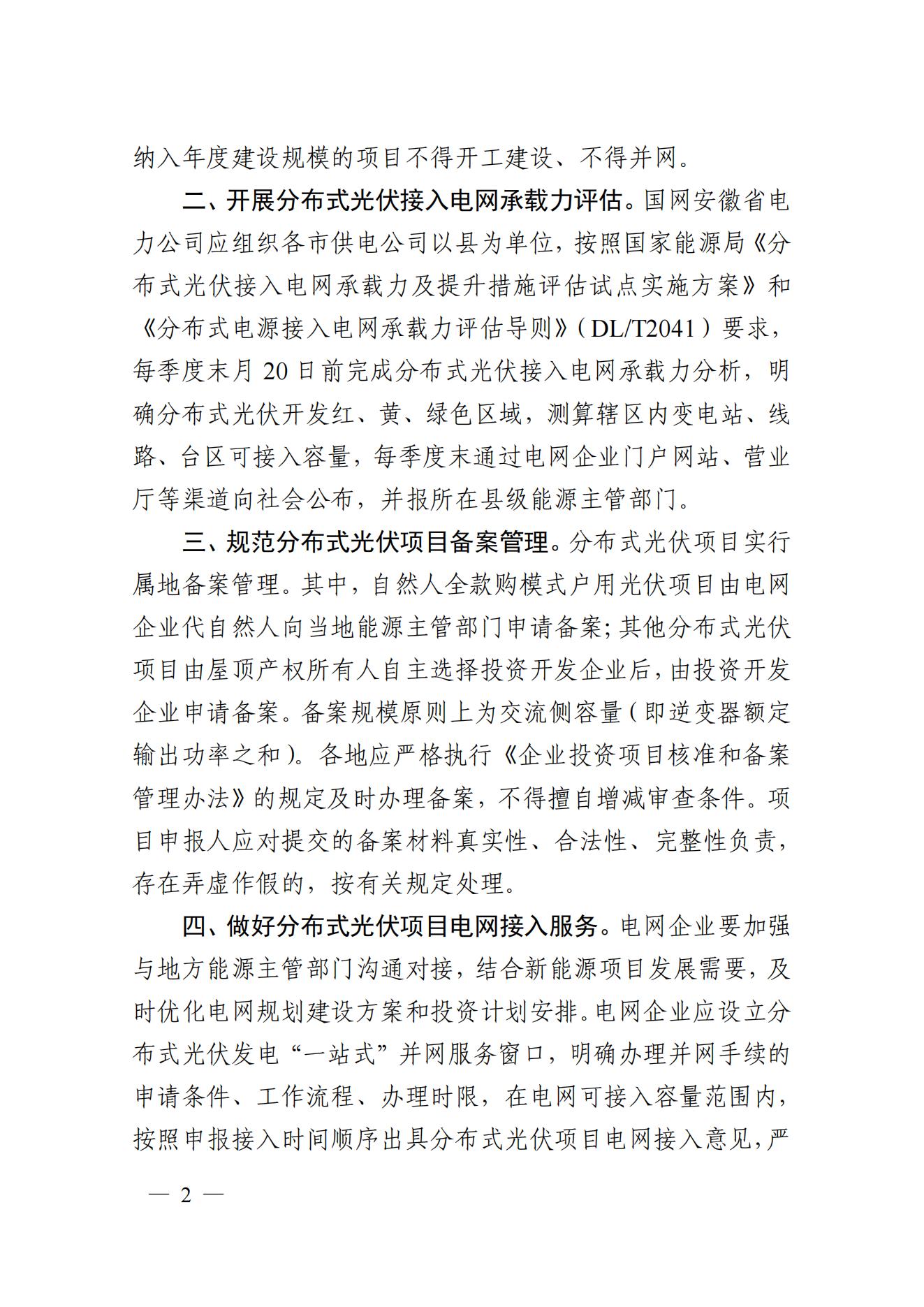 8月26日,安徽省能源局下發(fā)《關(guān)于進(jìn)一步推進(jìn)分布式光伏規(guī)范有序發(fā)展的通知》,文件指出,新增備案小于6兆瓦的地面光伏電站(包括利用坑塘水面、結(jié)合農(nóng)業(yè)大棚、牲畜養(yǎng)殖等建設(shè)的光伏電站項(xiàng)目)納入年度建設(shè)規(guī)模管理,未納入年度建設(shè)規(guī)模的項(xiàng)目不得開工建設(shè)、不得并網(wǎng)。 單點(diǎn)接入小于6兆瓦的工商業(yè)分布式光伏項(xiàng)目(指利用工商業(yè)企業(yè)自有建設(shè)用地范圍內(nèi)屋頂或地面建設(shè)的分布式光伏)和戶用光伏項(xiàng)目,暫不納入年度建設(shè)規(guī)模管理。 自然人全款購模式戶用光伏項(xiàng)目由電網(wǎng)企業(yè)代自然人向當(dāng)?shù)啬茉粗鞴懿块T申請備案;其他分布式光伏項(xiàng)目由屋頂產(chǎn)權(quán)所有人自主選擇投資開發(fā)企業(yè)后,由投資開發(fā)企業(yè)申請備案,備案規(guī)模原則上為交流側(cè)容量。 全款購模式戶用光伏以自然人名義申請電網(wǎng)接入,電網(wǎng)企業(yè)在并網(wǎng)前應(yīng)通過核驗(yàn)申請人自然人身份及主要光伏發(fā)電設(shè)備(包括光伏組件、逆變器等)購置發(fā)票等方式進(jìn)行確認(rèn)。 原文如下: