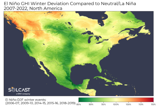 DNV公司在其發(fā)布的每周更新報(bào)告中指出,今年冬季出現(xiàn)的厄爾尼諾現(xiàn)象可能會(huì)使美國(guó)的光伏發(fā)電量低于正常水平。其分析是基于從以前的厄爾尼諾氣候事件中收集的數(shù)據(jù)。 研究表明,在這個(gè)即將到來(lái)的冬天,北美大部分地區(qū)的陽(yáng)光輻照度很可能低于平均水平,因?yàn)槎驙柲嶂Z氣候的影響會(huì)給北美大陸帶來(lái)更多云層和更潮濕的環(huán)境。DNV公司使用Solcast API對(duì)發(fā)生厄爾尼諾的歷史時(shí)間序列數(shù)據(jù)進(jìn)行分析,表明在出現(xiàn)厄爾尼諾的這些年份陽(yáng)光輻照度受到了顯著影響。 美國(guó)國(guó)家海洋和大氣管理局(NOAA)日前宣布,美國(guó)正處于厄爾尼諾的南方濤動(dòng)(ENSO)階段,并且這種情況有90%~95%的可能性持續(xù)到即將到來(lái)的冬季。 美國(guó)國(guó)家海洋和大氣管理局進(jìn)一步預(yù)測(cè),這是一個(gè)“強(qiáng)烈事件”的可能性為60%,因此北美大陸的光伏發(fā)電商應(yīng)該預(yù)料到這一點(diǎn),以改變他們對(duì)光伏發(fā)系統(tǒng)在今年冬天的預(yù)期表現(xiàn)。 對(duì)以往厄爾尼諾天氣事件(2006、2009、2014、2015和2018-)12月至2月的分析顯示了其對(duì)全球水平輻照度(GHI)的歷史性影響。下圖顯示了厄爾尼諾現(xiàn)象與厄爾尼諾的南方濤動(dòng)(ENSO氣候周期的中期階段和拉尼娜現(xiàn)象的平均水平輻照度(GHI)進(jìn)行的比較。