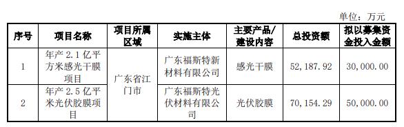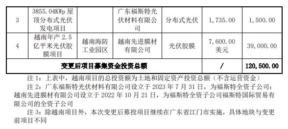 8月30日,電項目”變更為“年產(chǎn)2.1億平方米感光干膜項目(原“年產(chǎn)4.2億平方米感光干膜項目”縮減規(guī)模和變更實施地點)、年產(chǎn)2.5億平米高效電池封裝膠膜項目(新項目)、3855.04KWp屋頂分布式光伏發(fā)電項目(原項目變更實施地點和實施主體)、越南年產(chǎn)2.5億平米光 伏膠膜項目(新項目)”。 變更后的項目投入詳情如下: 福斯特表示,公司本次募投項目變更是綜合了感光干膜和光伏膠膜產(chǎn)品近期市場變化、產(chǎn)能擴(kuò)充的迫切程度不同而作出的調(diào)整。一方面,近期感光干膜產(chǎn)品下游PCB 行業(yè)市場需求增速放緩,公司現(xiàn)有感光干膜產(chǎn)能以及建設(shè)進(jìn)度較快的“年產(chǎn)1億平方米(高分辨率)感光干膜項目”產(chǎn)能預(yù)計短期內(nèi)能夠較好地滿足市場需求;另一方面,公司核心產(chǎn)品光伏膠膜下游應(yīng)用市場規(guī)模快速增長,短期內(nèi)存在擴(kuò)充光伏膠膜優(yōu)質(zhì)產(chǎn)能以貼近市場滿足客戶需求的迫切需求。公司根據(jù)市場和經(jīng)營實際情況,適當(dāng)縮減感光干膜在建產(chǎn)能并暫停建設(shè)上游原材料合成樹脂項目,同時優(yōu)先滿足光伏膠膜產(chǎn)能的建設(shè)需求,有利于提升募集資金的使用效率并提前實現(xiàn)項目應(yīng)有的經(jīng)濟(jì)效益。