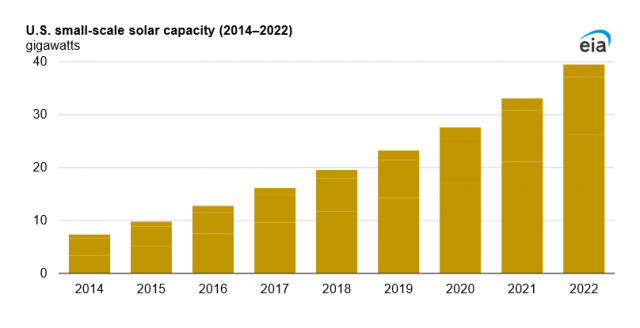 根據(jù)美國能源情報署日前發(fā)布的一份調(diào)查報告,美國在2022年新增了6.4GW的小型光伏系統(tǒng),這是其光伏行業(yè)有史以來最高的增長。 小型光伏系統(tǒng)通常稱為分布式光伏系統(tǒng)或屋頂光伏系統(tǒng),包括裝機容量為1MW或規(guī)模更小的光伏系統(tǒng)。在美國,大部分小型光伏系統(tǒng)是安裝在住宅建筑上的屋頂光伏系統(tǒng)。 該報告指出,小型光伏系統(tǒng)市場從2014年開始快速發(fā)展,當時美國累計安裝了7.3GW小型光伏系統(tǒng)。而到2022年,美國累計安裝的小型光伏系統(tǒng)裝機容量已飆升至39.5GW,占安裝的所有光伏系統(tǒng)總裝機容量的近三分之一。