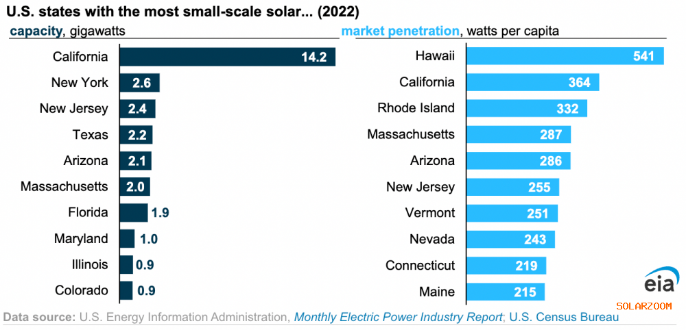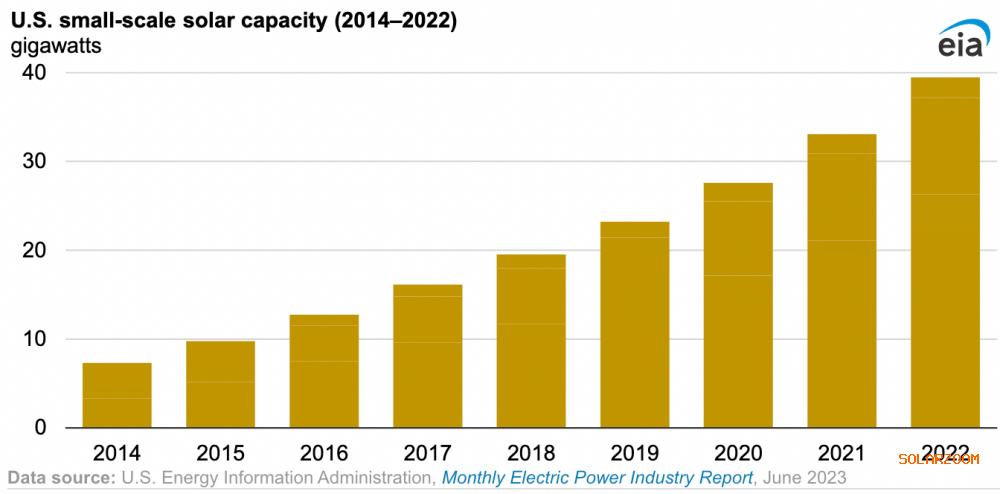 據(jù)美國能源信息署發(fā)布的數(shù)據(jù),美國在2022年增加了6.4吉瓦的小規(guī)模太陽能發(fā)電量,是有史以來增量最多的一年。 ![]() “小型太陽能”也稱為分布式太陽能或屋頂太陽能,在美國是指容量不超過1兆瓦(MW)的太陽能系統(tǒng)。美國小型太陽能發(fā)電總裝機(jī)容量從2014年美國能源信息署開始發(fā)布這些數(shù)據(jù)時(shí)的7.3吉瓦增長到2022年的39.5吉瓦。小型太陽能裝機(jī)約占美國太陽能總?cè)萘康娜种?。在美國,安裝在家庭中的屋頂太陽能電池板占小規(guī)模太陽能發(fā)電量的大部分。同時(shí),小型太陽能發(fā)電系統(tǒng)也用于商業(yè)和工業(yè)部門。 稅收抵免和激勵(lì)措施、公共政策以及更高的零售電價(jià)在過去十年中鼓勵(lì)了小型太陽能發(fā)電量的增長,太陽能光伏板成本的下降也起到了重要作用。 到目前為止,加利福尼亞州的小規(guī)模太陽能發(fā)電量占全美最大份額,達(dá)36%。充足的陽光、有利的激勵(lì)措施和相對(duì)較高的零售電價(jià)鼓勵(lì)了加州用戶積極采用屋頂太陽能。加州的凈能源雙向計(jì)量計(jì)劃允許屋頂太陽能光伏連接到電網(wǎng),向電網(wǎng)上傳的多余電力。從2020年開始,加利福尼亞州要求新建三層樓高的獨(dú)棟住宅和多戶建筑安裝太陽能電池板。 紐約州和新澤西州是大西洋中部全年日照較少的州,它們的小規(guī)模太陽能發(fā)電量分別位居第二和第三,盡管近年來,陽光明媚的得克薩斯州和亞利桑那州一直在縮小差距。紐約州和新澤西州的長期政策提供了慷慨的太陽能激勵(lì)措施,推動(dòng)了小規(guī)模的太陽能裝機(jī)增長。 ![]() 許多擁有小規(guī)模太陽能發(fā)電能力的州也有大量人口??紤]到人口規(guī)模,可以深入了解一個(gè)州小規(guī)模太陽能發(fā)電的普及程度。盡管加利福尼亞州擁有最多的小規(guī)模太陽能發(fā)電量,但夏威夷的小規(guī)模太陽普及率最高,人均541瓦。 從歷史上看,夏威夷電力的很大一部分來自燃油發(fā)電廠。這些工廠依賴昂貴的燃料進(jìn)口,導(dǎo)致高昂的電費(fèi)。隨著太陽能光伏成本的下降,夏威夷的許多家庭和企業(yè)都使用太陽能,減少了電費(fèi),并助力該州實(shí)現(xiàn)到2045年100%由可再生能源發(fā)電的目標(biāo)。