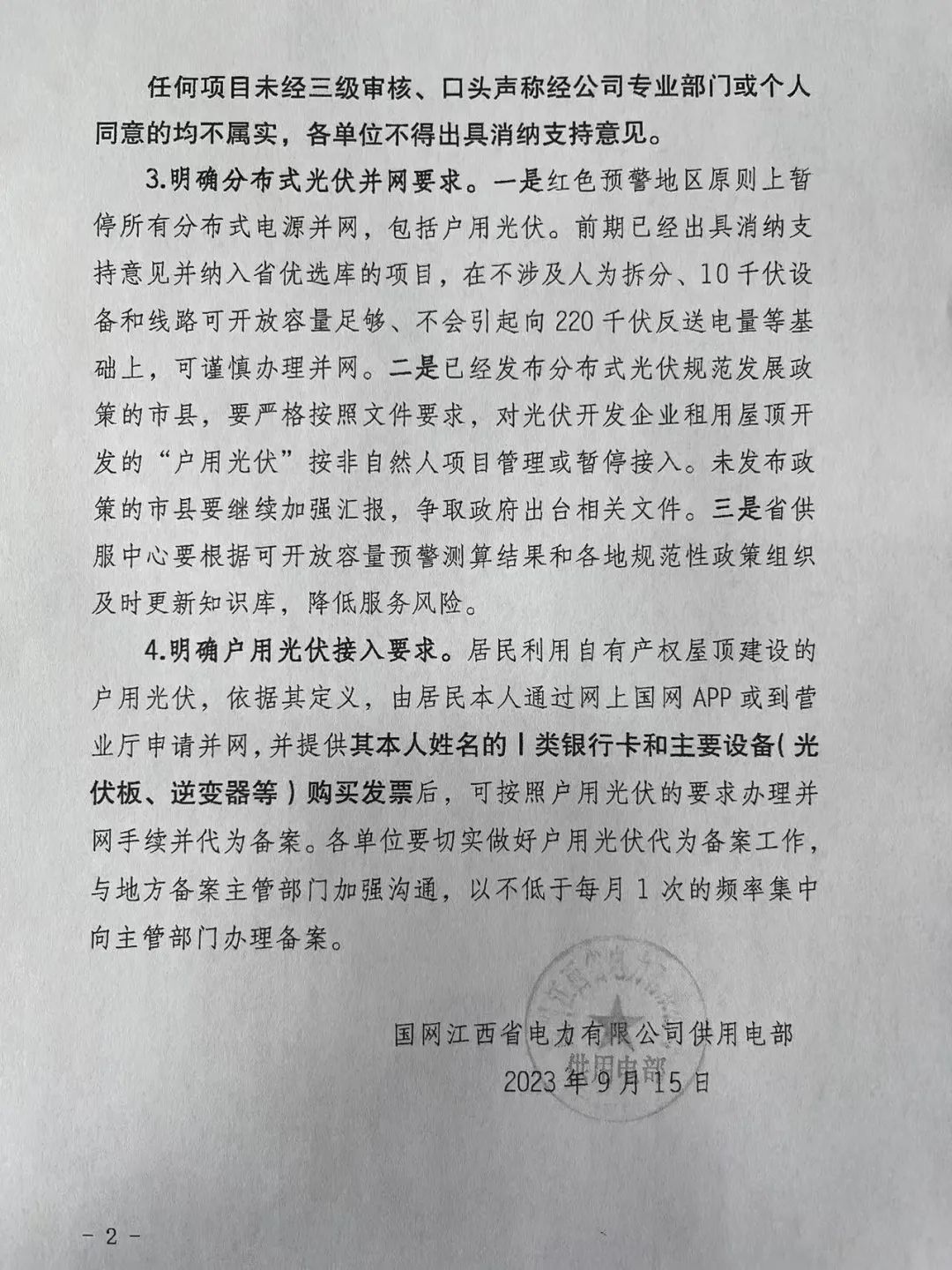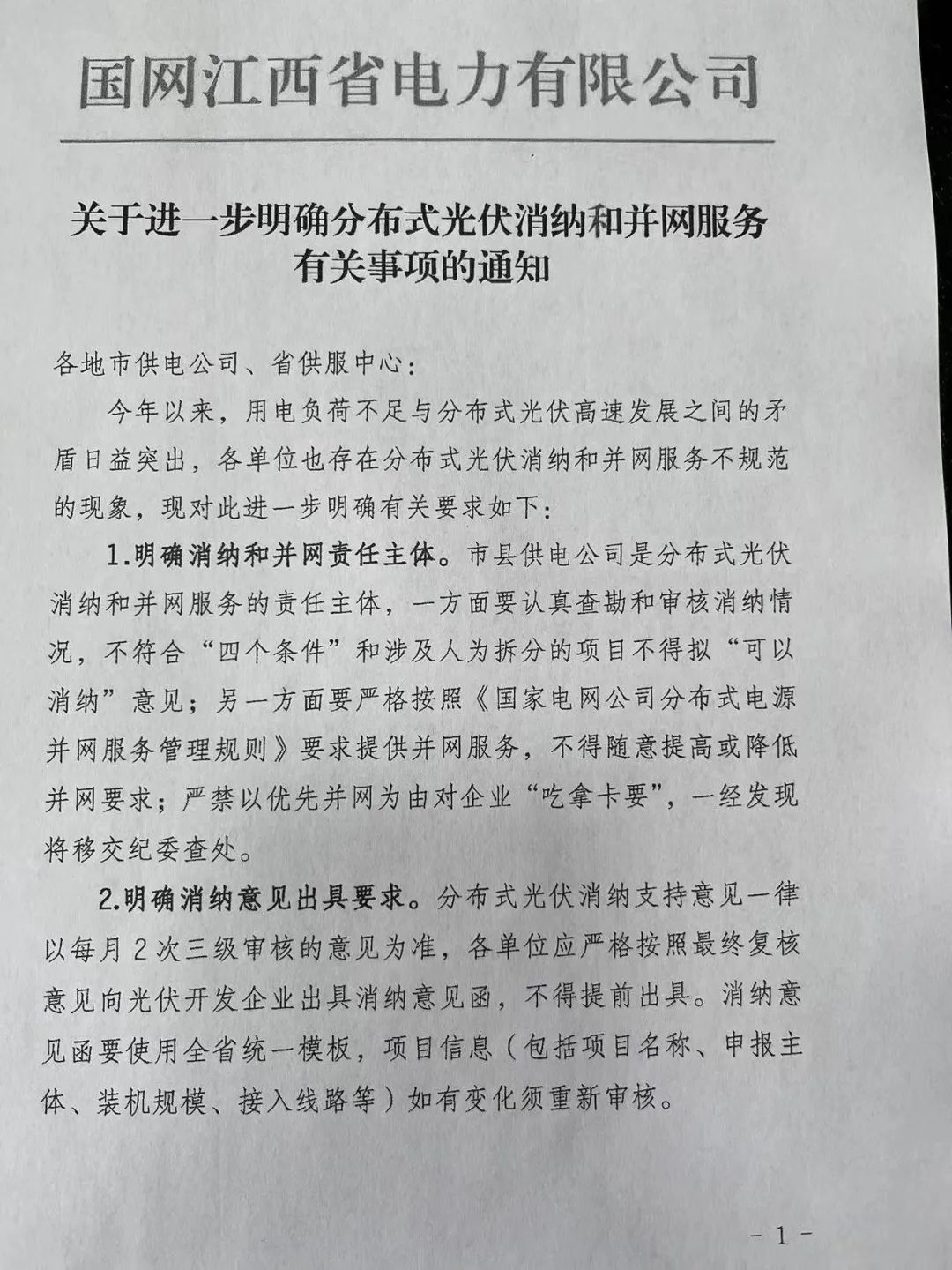 近日,國網(wǎng)江西電力公司下發(fā)《關(guān)于進一步明確分布式光伏消納和并網(wǎng)服務(wù)有關(guān)事項的通知》,提出:為解決用電負(fù)荷不足與分布式光伏高速發(fā)展之間的矛盾,進一步規(guī)范分布式光伏消納和并網(wǎng)服務(wù),具體如下: 1)紅色預(yù)警地區(qū)原則上暫停所有分布式電源并網(wǎng),包括戶用光伏。 前期已經(jīng)出具消納支持意見并納入省優(yōu)選庫的項目,在不涉及人為拆分、10千伏設(shè)備和線路可開放容量足夠、不會引起向220千伏反送電量等基礎(chǔ)上,可謹(jǐn)慎辦理并網(wǎng)。 2)對光伏開發(fā)企業(yè)租用屋頂開發(fā)的“戶用光伏”按非自然人項目管理或暫停接入。 居民利用自有產(chǎn)權(quán)屋頂建設(shè)的戶用光伏,由居民本人通過網(wǎng)上國網(wǎng)APP或到營業(yè)廳申請并網(wǎng),并提供其本人姓名的I類銀行卡和主要設(shè)備(光伏板、逆變器等)購買發(fā)票后,可按照戶用光伏的要求辦理并網(wǎng)手續(xù)并代為備案。 3)加強出具“消納意見”的管理。不符合“四個條件"和涉及人為拆分的項目不得擬“可以消納"意見;要嚴(yán)格按照《國家電網(wǎng)公司分布式電源并網(wǎng)服務(wù)管理規(guī)則》要求提供并網(wǎng)服務(wù),不得隨意提高或降低并網(wǎng)要求。分布式光伏消納支持意見一律以每月2次三級審核的意見為準(zhǔn),消納意見函要使用全省統(tǒng)一模板,項目信息(包括項目名稱、申報主體、裝機規(guī)模、接入線路等) 任何項目未經(jīng)三級審核、口頭聲稱經(jīng)公司專業(yè)部門或個人同意的均不屬實,各單位不得出具消納支持意見。