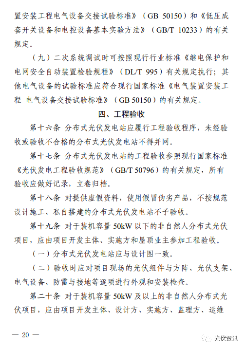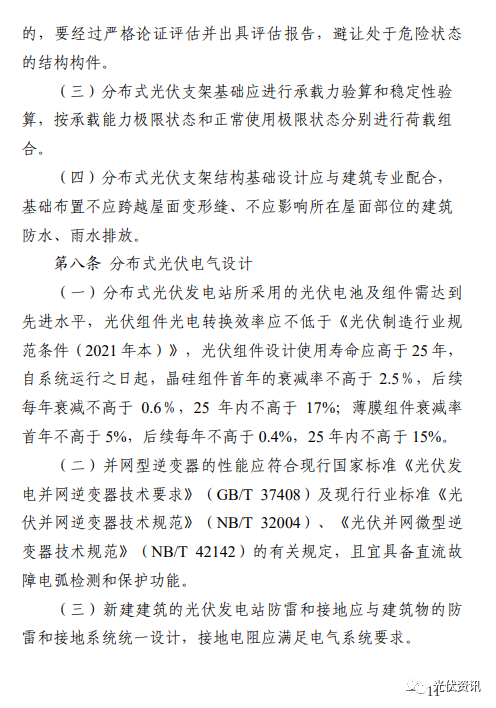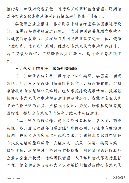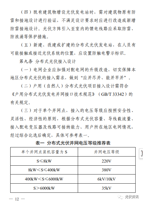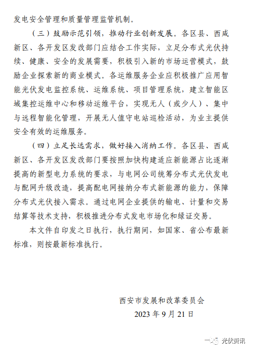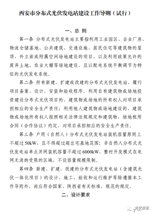 9月21日,西安市發(fā)改委發(fā)布《推進(jìn)西安市分布式光伏電站建設(shè)工作導(dǎo)則(試行)》的通知。 其中明確,要做好接入消納工作,提高配電網(wǎng)接納分布式新能源的能力,保障分布式光伏接入需求; 所有新建、擴建或改建的分布式光伏發(fā)電站,履行項目備案、設(shè)計、安裝和驗收程序; 戶用(自然人)分布式光伏發(fā)電站裝機容量原則上不超過50kW,且不得超過超出宅基地范圍;非自然人分布式光伏發(fā)電站單點并網(wǎng)裝機容量不超過6000kW,整村開發(fā)模式在電網(wǎng)無消納受限的區(qū)域,不設(shè)容量規(guī)模限制; 分布式光伏發(fā)電站可采用“自發(fā)自用”“自發(fā)自用,余電上網(wǎng)”或者“全額上網(wǎng)”等并網(wǎng)模式; 嚴(yán)禁利用危險性鑒定等級為C級、D級的建筑物建設(shè)分布式光伏發(fā)電站; 分布式光伏發(fā)電站所采用的光伏組件設(shè)計使用壽命應(yīng)高于25年。 原文如下: ![]()