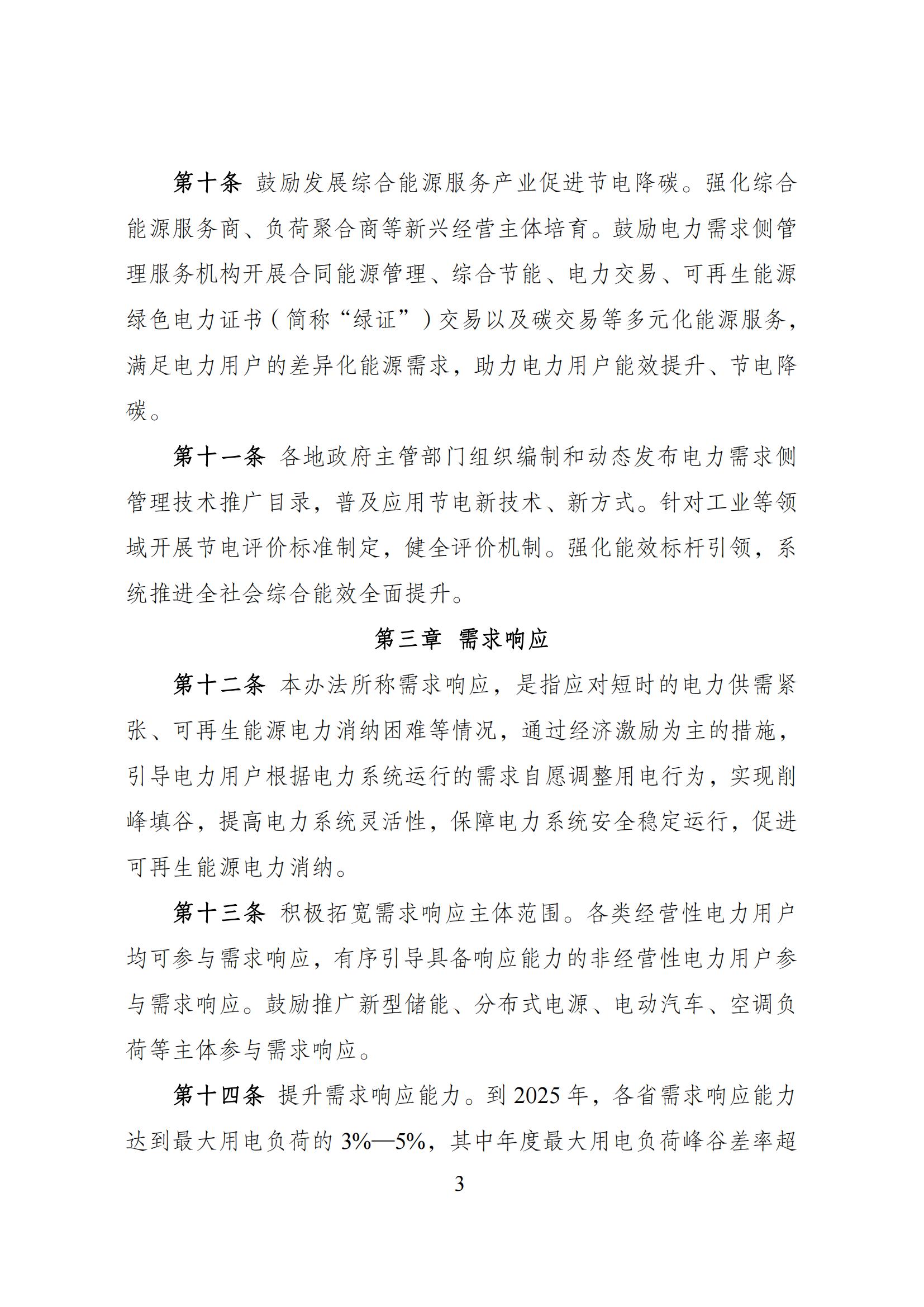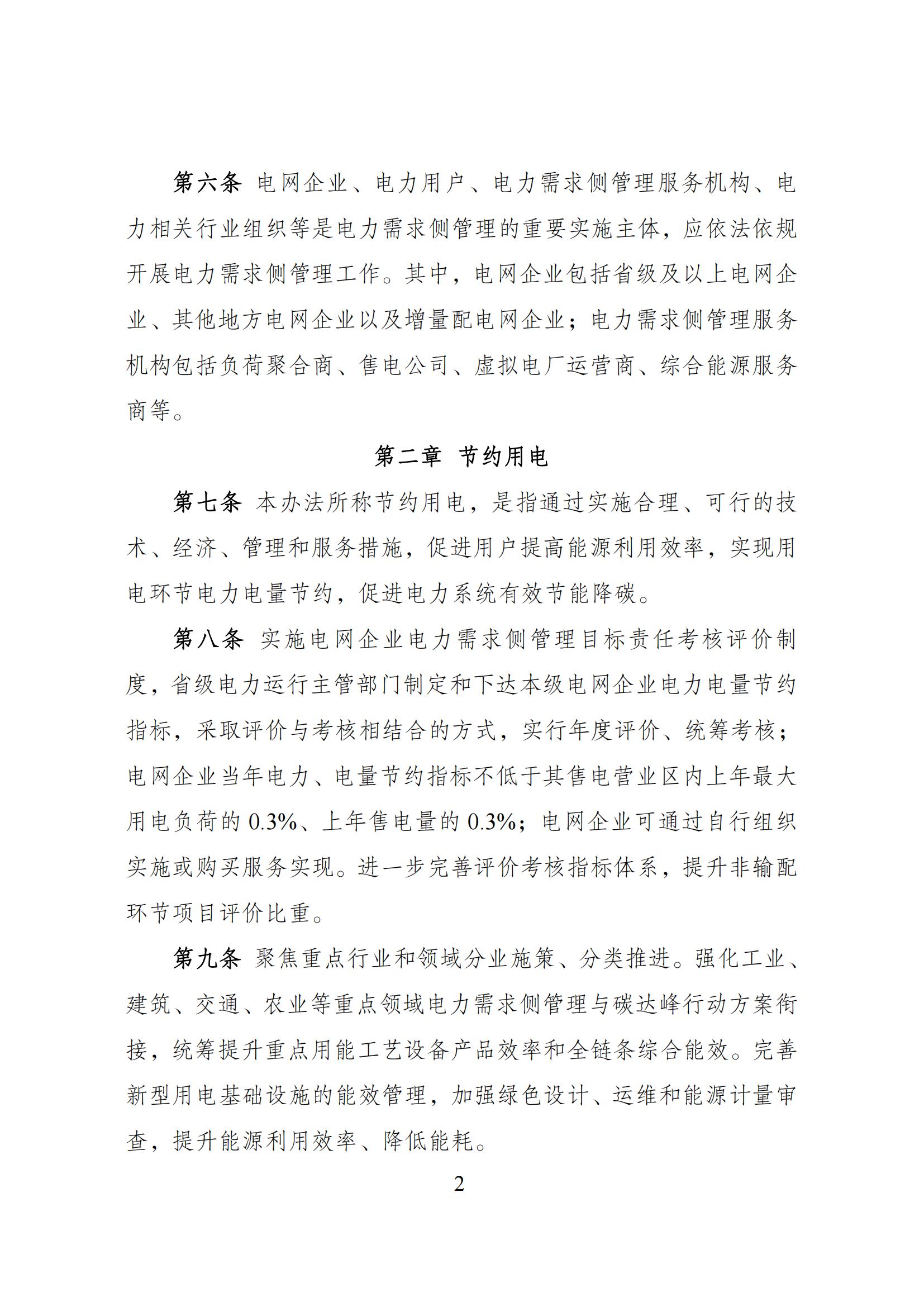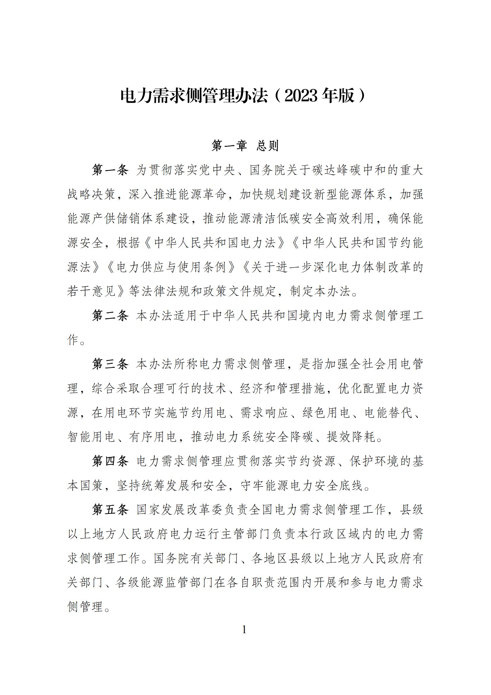 9月27日,國家發(fā)展改革委等部門關于印發(fā)《電力需求側(cè)管理辦法(2023年版)》的通知。 通知指出,本辦法所稱電力需求側(cè)管理,是指加強全社會用電管理,綜合采取合理可行的技術、經(jīng)濟和管理措施,優(yōu)化配置電力資源,在用電環(huán)節(jié)實施節(jié)約用電、需求響應、綠色用電、電能替代、 智能用電、有序用電,推動電力系統(tǒng)安全降碳、提效降耗。 節(jié)約用電方面,實施電網(wǎng)企業(yè)電力需求側(cè)管理目標責任考核評價制 度,省級電力運行主管部門制定和下達本級電網(wǎng)企業(yè)電力電量節(jié)約 指標,采取評價與考核相結(jié)合的方式,實行年度評價、統(tǒng)籌考核;電網(wǎng)企業(yè)當年電力、電量節(jié)約指標不低于其售電營業(yè)區(qū)內(nèi)上年最大 用電負荷的 0.3%、上年售電量的 0.3%;電網(wǎng)企業(yè)可通過自行組織 實施或購買服務實現(xiàn)。進一步完善評價考核指標體系,提升非輸配 環(huán)節(jié)項目評價比重。 鼓勵發(fā)展綜合能源服務產(chǎn)業(yè)促進節(jié)電降碳。強化綜合能源服務商、負荷聚合商等新興經(jīng)營主體培育。鼓勵電力需求側(cè)管 理服務機構(gòu)開展合同能源管理、綜合節(jié)能、電力交易、可再生能源 綠色電力證書(簡稱“綠證”)交易以及碳交易等多元化能源服務, 滿足電力用戶的差異化能源需求,助力電力用戶能效提升、節(jié)電降 碳。 需求響應方面,積極拓寬需求響應主體范圍。各類經(jīng)營性電力用戶 均可參與需求響應,有序引導具備響應能力的非經(jīng)營性電力用戶參 與需求響應。鼓勵推廣新型儲能、分布式電源、電動汽車、空調(diào)負 荷等主體參與需求響應。 綠色用電方面,綠證是可再生能源電力消費量的唯一憑證。 鼓勵行業(yè)龍頭企業(yè)、大型國有企業(yè)、跨國公司等 消費綠電,發(fā)揮示范帶頭作用,推動外向型企業(yè)較多、經(jīng)濟承受能 力較強的地區(qū)逐步提升綠電消費比例。加強高耗能、高排放企業(yè)使 用綠電的剛性約束,各地可根據(jù)實際情況制定高耗能、高排放企業(yè) 電力消費中綠電最低占比。提升新型基礎設施綠電消費水平,促進 綠電就近消納。 積極推動工業(yè)廠房、公共建筑等屋 頂光伏建設和實施光伏建筑一體化應用,因地制宜推廣淺層地熱驅(qū) 動的冷熱電一體化模式。 推動配電網(wǎng)增容、線路改造和智能化升級,提升 配電網(wǎng)規(guī)模化接入分布式電源、柔性負荷的能力,推進電網(wǎng)運行方 式向源網(wǎng)荷儲互動、分層分區(qū)協(xié)同控制轉(zhuǎn)變。支持工業(yè)企業(yè)、產(chǎn)業(yè) 園區(qū)、具備條件的鄉(xiāng)村地區(qū)等開展綠色低碳微電網(wǎng)和源網(wǎng)荷儲一體 化建設。 電能替代方面,持續(xù)提升電能替代項目的靈活互動能力和可再生 能源消納水平。實施電能替代新增電力電量應優(yōu)先通過可再生能源 電力滿足,支持電能替代項目開展綠電交易、綠證交易,進一步提 高可再生能源消納占比,推動電能替代項目參與分布式發(fā)電市場化 交易。鼓勵電能替代項目通過負荷聚合商參與需求響應。 實施電能替代新增電力電量在電網(wǎng)企業(yè)年度電力電 量節(jié)約指標完成情況考核中予以合理扣除。對于通過可再生能源滿 足的電能替代電力電量,計入電網(wǎng)企業(yè) 年度電力電量節(jié)約指標。 9月27日,國家發(fā)展改革委有關負責同志就《電力需求側(cè)管理辦法(2023年版)》答記者問。 原文見下: 近日,國家發(fā)展改革委、工業(yè)和信息化部、財政部、住房和城鄉(xiāng)建設部、國務院國資委、國家能源局聯(lián)合發(fā)布了新修訂的《電力需求側(cè)管理辦法(2023年版)》(以下簡稱《辦法》),就此,記者專訪了國家發(fā)展改革委有關負責同志。 問:《辦法》修訂的背景和意義是什么? 答:電力需求側(cè)管理,是指加強全社會用電管理,綜合采取合理可行的技術、經(jīng)濟和管理措施,優(yōu)化配置電力資源,在用電環(huán)節(jié)實施節(jié)約用電、需求響應、綠色用電、電能替代、智能用電、有序用電,推動電力系統(tǒng)安全降碳、提效降耗。深化電力需求側(cè)管理,充分挖掘需求側(cè)資源,對推動源網(wǎng)荷儲協(xié)同互動,保障電力安全穩(wěn)定運行,助力新型電力系統(tǒng)和新型能源體系建設具有重要意義。 我國上世紀90年代開始引入電力需求側(cè)管理,在實踐中不斷完善,分別于2010年、2017年發(fā)布了兩版電力需求側(cè)管理辦法?,F(xiàn)行《電力需求側(cè)管理辦法》(修訂版)自2017年9月20日起實施,對推動節(jié)能減排和電力經(jīng)濟綠色發(fā)展,加快生態(tài)文明建設發(fā)揮了積極作用。近年來各地、各部門從推動市場化需求響應、促進節(jié)能降耗、擴大綠電消費、保障電力安全等方面不斷豐富電力需求側(cè)管理實踐,虛擬電廠運營商、負荷聚合商等新興主體不斷涌現(xiàn),為電力系統(tǒng)安全、經(jīng)濟、高效、綠色運行提供了有力支撐。 黨的二十大報告提出,要加快規(guī)劃建設新型能源體系,加強能源產(chǎn)供儲銷體系建設,確保能源安全。為更好適應我國經(jīng)濟社會和能源發(fā)展所面臨的新形勢、新任務,去年以來,國家發(fā)展改革委會同有關方面,在認真總結(jié)電力需求側(cè)管理工作