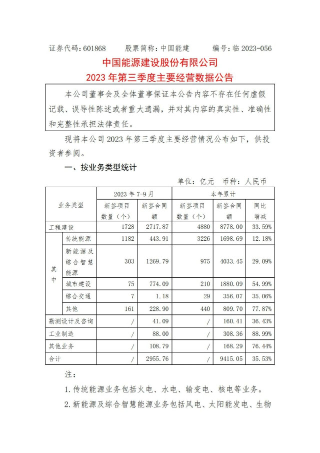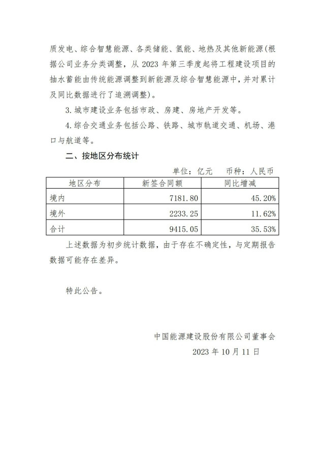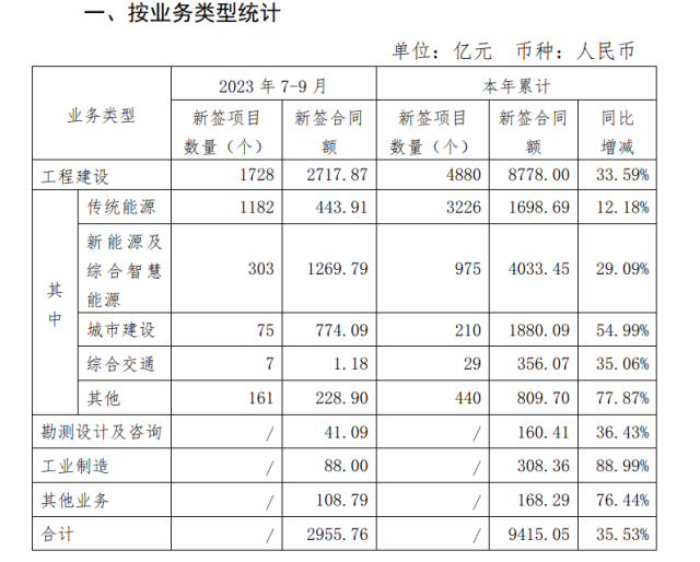 10月11日,中國能源建設股份有限公司發(fā)布2023年第三季度主要經(jīng)營數(shù)據(jù),本年度已新簽約4880個工程建設項目,合同總額達8778億元,同比增長33.59%。
