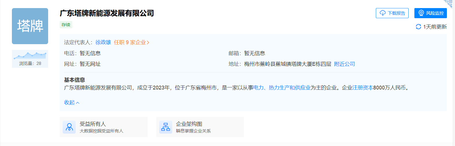 天眼查顯示,近日,塔牌集團成立廣東塔牌新能源發(fā)展有限公司,注冊資本8000萬元,經(jīng)營范圍包含:太陽能發(fā)電技術(shù)服務;光伏設(shè)備及元器件制造;光伏設(shè)備及元器件銷售等。該公司由塔牌集團100%控股。 ![]() 據(jù)悉,塔牌集團成立于1972年,其產(chǎn)品大多應用于各類工業(yè)和民用建筑、大體積混凝土及地下工程,是廣東省內(nèi)一家上市水泥公司。此前,塔牌集團按照“自發(fā)自用、余電上網(wǎng)”原則建設(shè),經(jīng)濟效益較高,截至2022年年底,共投入資金1.23億元,建成36.72MW分布式光伏發(fā)電系統(tǒng)并全部實現(xiàn)并網(wǎng)發(fā)電。今年上半年,塔牌集團及下屬企業(yè)廠區(qū)紅線內(nèi)的“自發(fā)自用、余電上網(wǎng)”分布式光伏發(fā)電項目實現(xiàn)余電上網(wǎng)收入109.96萬元,同比增長146.04%。