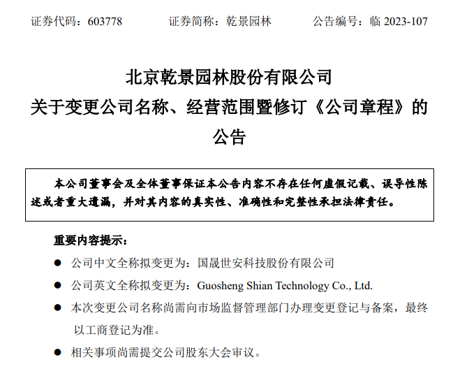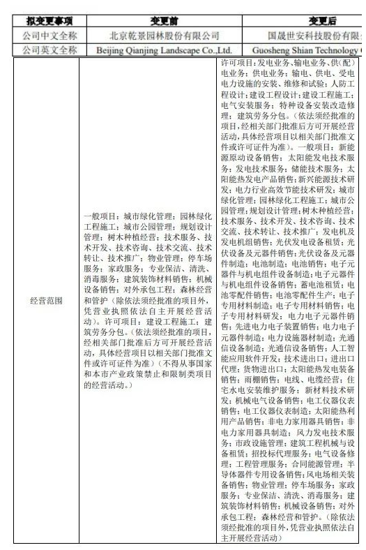 10月14日,乾景園林發(fā)布公告稱,2023年10月13日召開了第五屆董事會(huì)第二次會(huì)議及第五屆監(jiān)事會(huì)第二次會(huì)議,審議通過(guò)了《關(guān)于變更公司名稱、經(jīng)營(yíng)范圍暨修訂<公司章程>的議案》,擬對(duì)公司中文全稱、英文全稱以及經(jīng)營(yíng)范圍進(jìn)行變更,并修訂《公司章程》中的相關(guān)內(nèi)容。 根據(jù)公告內(nèi)容顯示,公司中文名字由“北京乾景園林股份有限公司”變更為“國(guó)晟世安科技股份有限公司”,而公司的經(jīng)營(yíng)范圍從原來(lái)主營(yíng)的園林工程施工和園林景觀設(shè)計(jì),新增光伏制造業(yè)務(wù)、風(fēng)力發(fā)電技術(shù)服務(wù)等。 對(duì)于此次變更,乾景園林表示,鑒于2023年9月公司控股股東協(xié)議轉(zhuǎn)讓股份已完成過(guò)戶登記,公司控制權(quán)及實(shí)際控制人已相應(yīng)變更,隨著公司光伏、園林板塊融合,兩大板塊協(xié)同發(fā)展, “園林+光伏”雙主業(yè)已經(jīng)形成,公司現(xiàn)有名稱已不能匹配目前的業(yè)務(wù)結(jié)構(gòu)及未來(lái)發(fā)展戰(zhàn)略。 今年8月10日,乾景園林發(fā)布公告表示,8月9日公司控股股東、實(shí)際控制人回全福、楊靜與國(guó)晟能源簽署了股份轉(zhuǎn)讓協(xié)議,將楊靜持有的5686.7萬(wàn)股非限售流通股份,占乾景園林總股本的 8.85%,以7.78元/股的價(jià)格轉(zhuǎn)讓給國(guó)晟能源。此次轉(zhuǎn)讓完成后,國(guó)晟能源將持有乾景園林16.85%的股份,成為公司的控股股東。