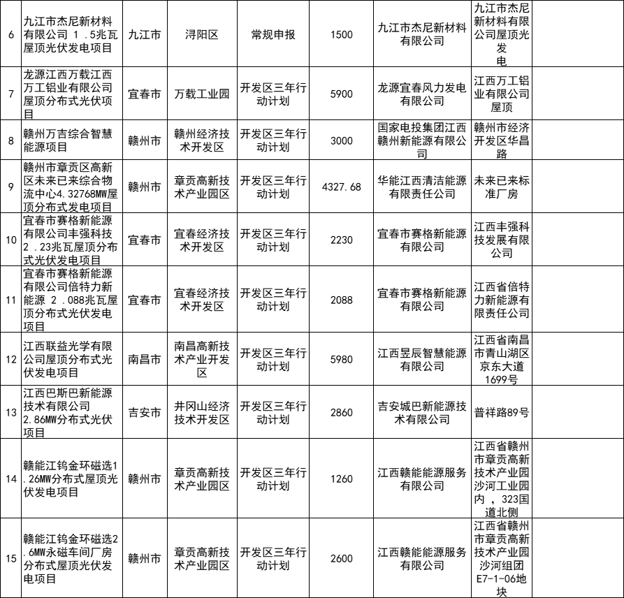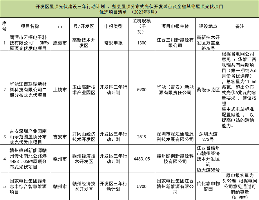 10月18日,江西開發(fā)區(qū)三年行動計劃、整縣開發(fā)試點及全省其他屋頂光伏項目2023年9月競爭性優(yōu)選結(jié)果公布,共涉及17個光伏項目,總裝機規(guī)模56.10273MW。 詳情如下: 開發(fā)區(qū)三年行動計劃、整縣開發(fā)試點及全省其他屋頂光伏項目2023年9月競爭性優(yōu)選結(jié)果 根據(jù)《江西省整體推進開發(fā)區(qū)屋頂光伏建設三年行動計劃(2022-2024年)》(贛發(fā)改能源〔2022〕27號)與《江西省能源局關(guān)于進一步做好整縣屋頂分布式光伏開發(fā)試點工作的通知》(贛能新能字〔2022〕29號)要求,江西省能源局組織開展了開發(fā)區(qū)三年行動計劃、整縣開發(fā)試點及全省其他屋頂光伏項目2023年9月競爭性優(yōu)選工作,江西省可再生能源信息中心對項目材料進行合規(guī)性審查,省電網(wǎng)公司對電網(wǎng)消納材料進行合規(guī)性審查,經(jīng)省能源局同意,現(xiàn)將優(yōu)選結(jié)果予以線上公布。各地應在保障安全的前提下組織好項目建設工作,并督促已開工的項目在可再生能源規(guī)劃項目庫管理系統(tǒng)中及時更新建設進度,及時開展建檔立卡工作。