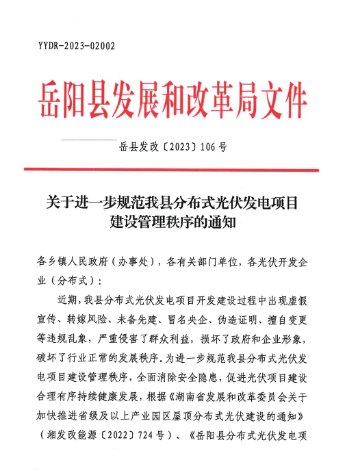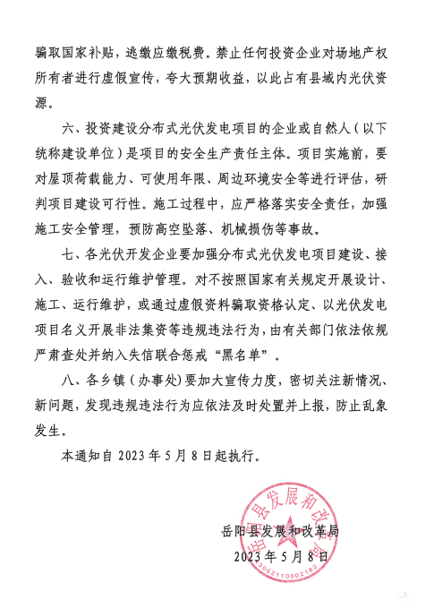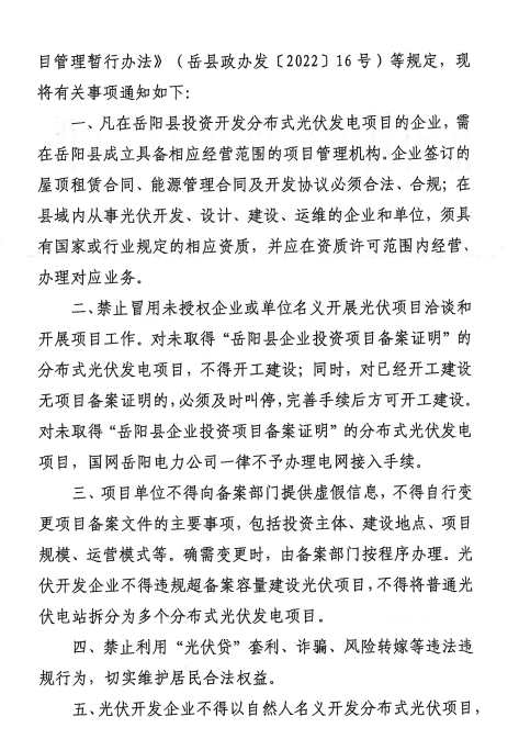 湖南岳陽縣人民政府發(fā)布關(guān)于進(jìn)一步規(guī)范我縣分布光伏發(fā)電項(xiàng)目建設(shè)管理秩序的通知。通知提出,禁止冒用未授權(quán)企業(yè)或單位名義開展光伏項(xiàng)目洽談和開展項(xiàng)目工作。對未取得“岳陽縣企業(yè)投資項(xiàng)目備案證明”的分布式光伏發(fā)電項(xiàng)目,不得開工建設(shè);同時,對已經(jīng)開工建設(shè)無項(xiàng)目備案證明的,必須及時叫停,完善手續(xù)后方可開工建設(shè)。對未取得“岳陽縣企業(yè)投資項(xiàng)目備案證明”的分布式光伏發(fā)電項(xiàng)目,國網(wǎng)岳陽電力公司一律不予辦理電網(wǎng)接入手續(xù)。 本通知自2023年5月8日起執(zhí)行。