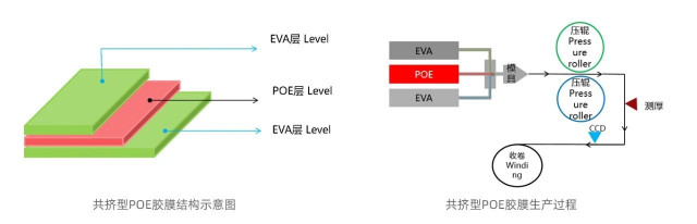 為提升組件可靠性,封裝膠膜POE(聚烯烴材質(zhì))因其在抗PID、水汽透過率、老化黃變等方面的性能優(yōu)勢被廣泛采用。然而在組件制造過程中,采用常規(guī)POE也面臨著不少挑戰(zhàn):由于POE膠膜與助劑相容性不佳,助劑容易析出并產(chǎn)生打滑現(xiàn)象,導致組件在層壓過程中容易產(chǎn)生氣泡、電池片滑移和并片等問題。 為克服現(xiàn)有技術(shù)中的不足,常規(guī)POE正逐漸被共擠型POE所替代。共擠型POE復合膠膜結(jié)合了EVA和常規(guī)POE的優(yōu)良特性,1.不僅在組件的長期可靠性上與常規(guī)POE相當,能夠有效提高組件抗PID性能,降低組件使用過程中水汽滲入,2.更重要的是在組件生產(chǎn)中能提高層壓件外觀良品率。3. 此外,在光伏市場降本增效的大趨勢下,共擠型POE的應(yīng)用更是得到了快速發(fā)展,是未來膠膜的重要發(fā)展方向。 共擠型POE膠膜一種由三層共擠復合膠膜構(gòu)成,從上到下依次為EVA層、POE層和EVA層,其制備方法是通過多個螺旋桿擠出機將這三種材料擠出到同一個三層共擠摸具,然后經(jīng)壓花、冷卻、牽引、收卷工序制備獲得復合膠膜,如下圖所示: