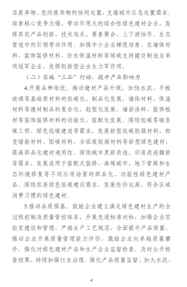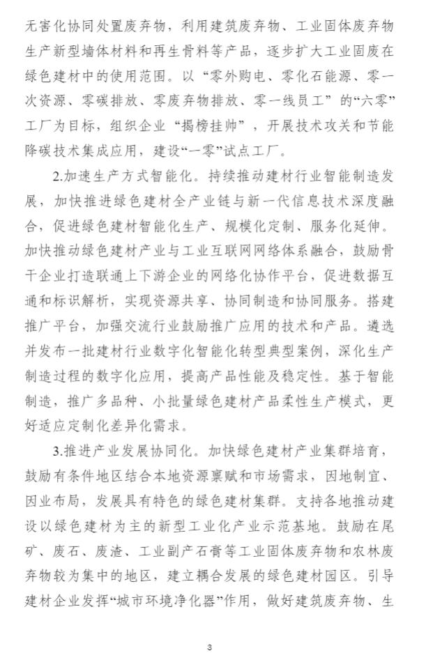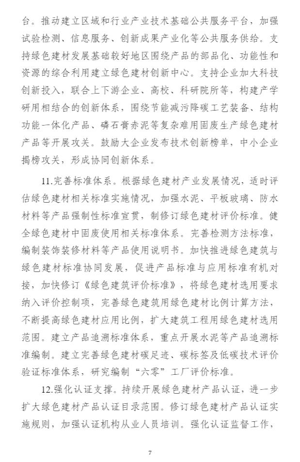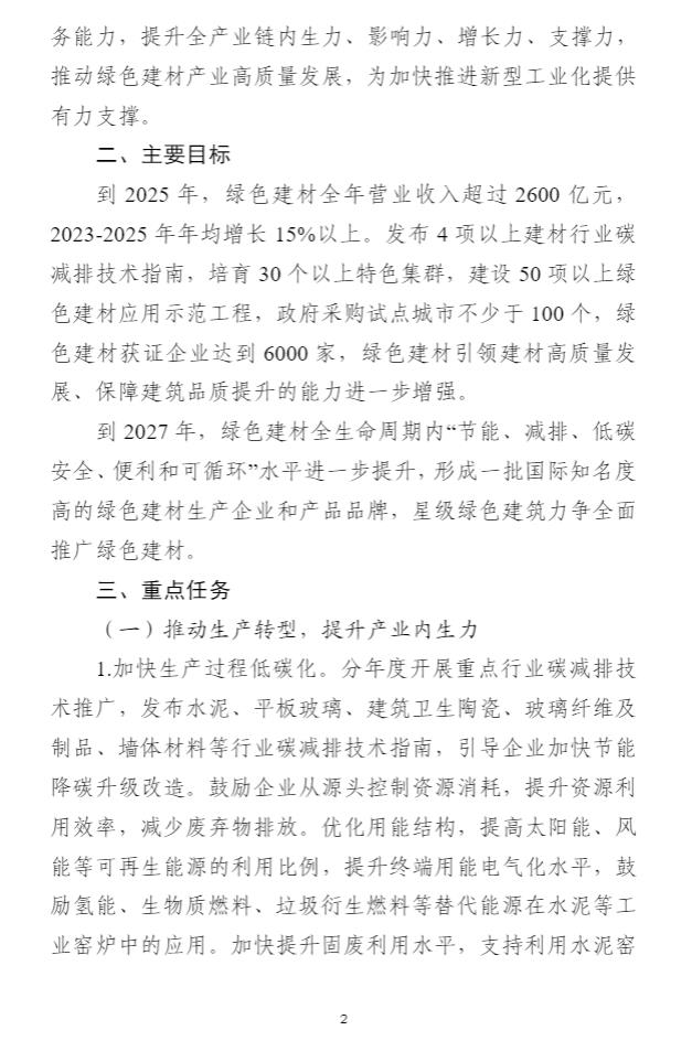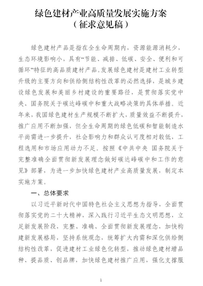11月2日,工信部發(fā)布《綠色建材產(chǎn)業(yè)高質(zhì)量發(fā)展實施方案(征求意見稿)》,征求意見稿提出主要目標:到2025年,綠色建材全年營業(yè)收入超過2600億元,2023-2025年年均增長15%以上。發(fā)布4項以上建材行業(yè)碳減排技術(shù)指南,培育30個以上特色集群,建設(shè)50項以上綠色建材應(yīng)用示范工程,政府采購試點城市不少于100個,綠色建材獲證企業(yè)達到6000家,綠色建材引領(lǐng)建材高質(zhì)量發(fā)展、保障建筑品質(zhì)提升的能力進一步增強。到2027年,綠色建材全生命周期內(nèi)“節(jié)能、減排、低碳安全、便利和可循環(huán)”水平進一步提升,形成一批國際知名度高的綠色建材生產(chǎn)企業(yè)和產(chǎn)品品牌,星級綠色建筑力爭全面推廣綠色建材。 要求優(yōu)化用能結(jié)構(gòu),提高太陽能、風能等可再生能源的利用比例,提升終端用能電氣化水平,鼓勵氫能、生物質(zhì)燃料、垃圾衍生燃料等替代能源在水泥等工業(yè)窯爐中的應(yīng)用。 詳情如下: 公開征求對《綠色建材產(chǎn)業(yè)高質(zhì)量發(fā)展實施方案(征求意見稿)》的意見 按照《中共中央 國務(wù)院關(guān)于完整準確全面貫徹新發(fā)展理念做好碳達峰碳中和工作的意見》部署,為進一步加快綠色建材產(chǎn)業(yè)高質(zhì)量發(fā)展,工業(yè)和信息化部起草了《綠色建材產(chǎn)業(yè)高質(zhì)量發(fā)展實施方案(征求意見稿)》(見附件)。為進一步聽取社會各界意見,現(xiàn)予以公示。如有意見和建議,請于2023年11月9日前反饋。 傳真:010-68205579 郵箱:yclsjcc@miit.gov.cn 附件:《綠色建材產(chǎn)業(yè)高質(zhì)量發(fā)展實施方案(征求意見稿)》