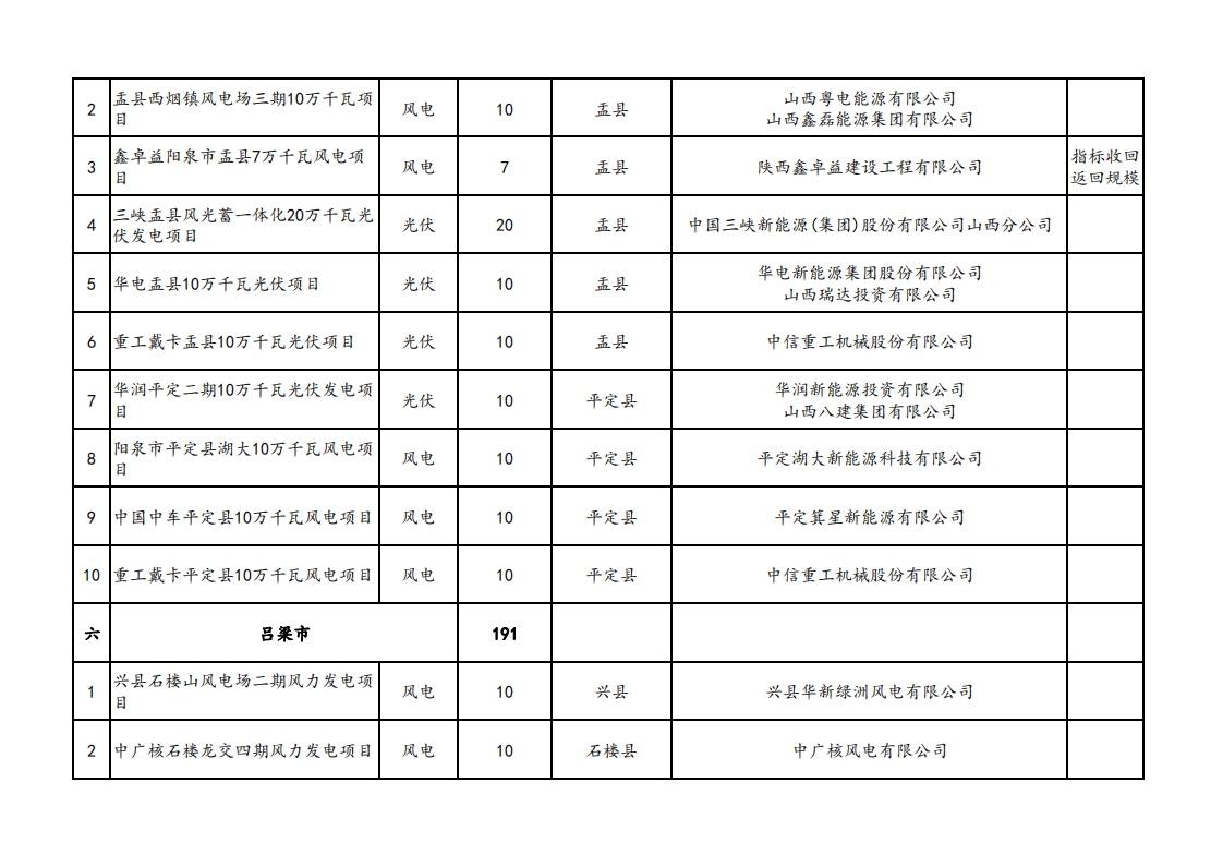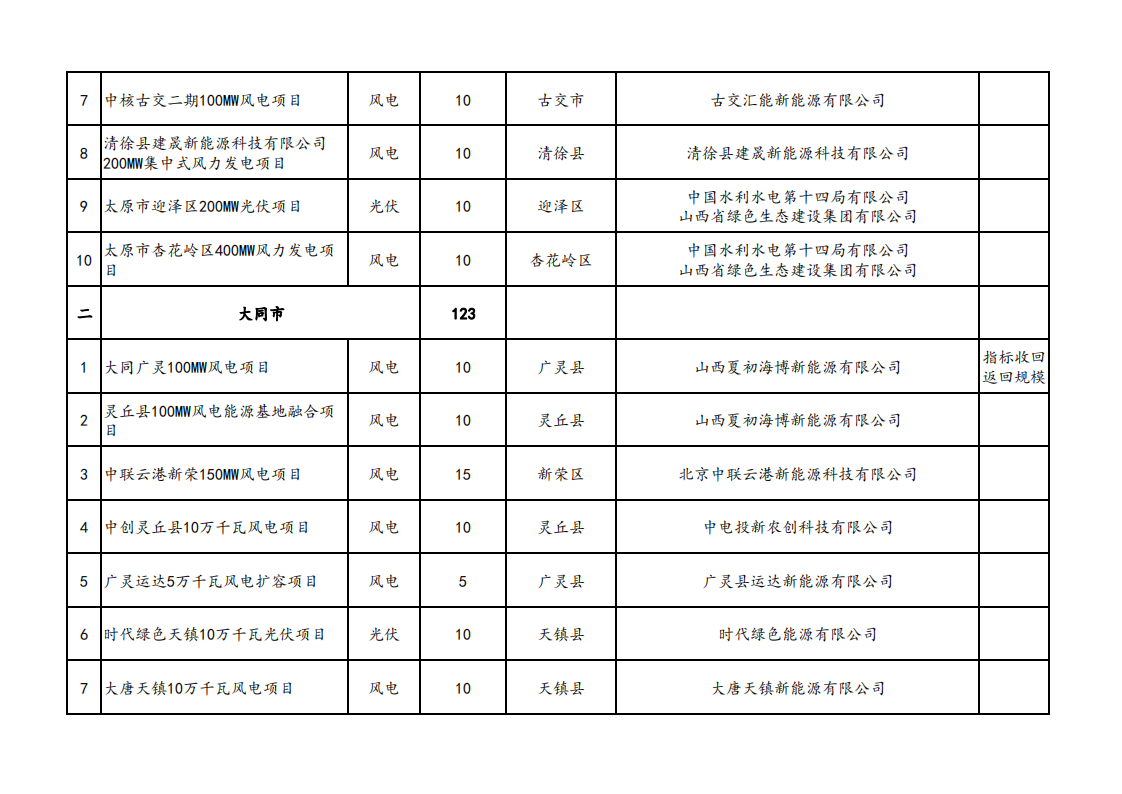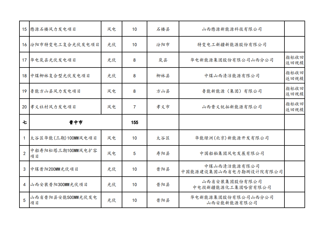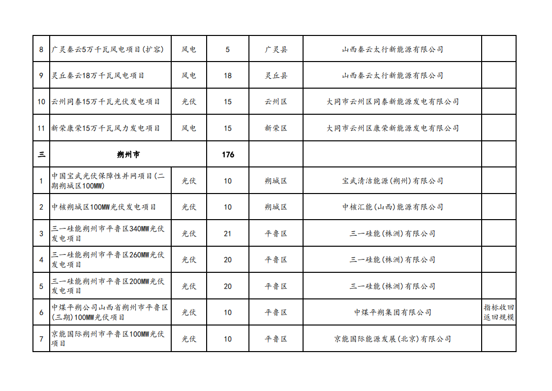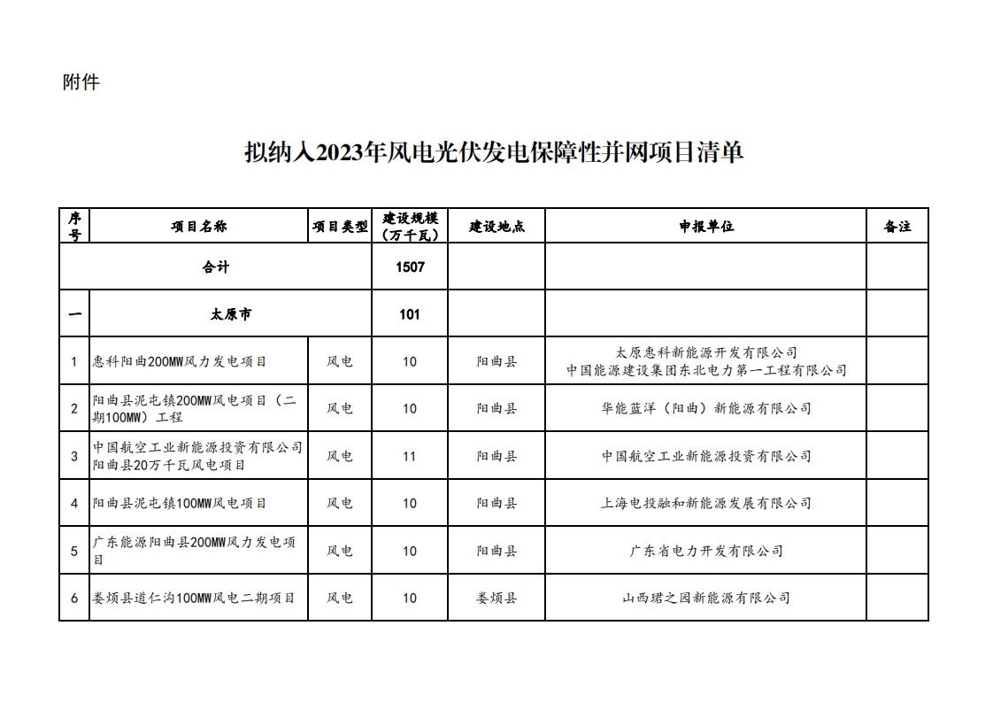 11月6日,山西省能源局發(fā)布關(guān)于山西省2023年競爭性配置風(fēng)電、光伏發(fā)電項目評審結(jié)果的公示,優(yōu)選出超過15GW的保障性并網(wǎng)新能源發(fā)電項目,其中,風(fēng)電項目7.7GW。光伏項目7.37GW。 據(jù)統(tǒng)計,本次選出的項目中,國家電投納入規(guī)模約為2.36GW、大唐集團、中國電建獲得規(guī)模均超1GW。 原文如下: 關(guān)于山西省2023年競爭性配置風(fēng)電、光伏發(fā)電項目評審結(jié)果的公示 根據(jù)《山西省2023年風(fēng)電、光伏發(fā)電開發(fā)建設(shè)競爭性配置工作方案》,經(jīng)各市初選上報,省能源局組織了2023年競爭性配置風(fēng)電、光伏發(fā)電項目評審,優(yōu)選出保障性并網(wǎng)項目146個、規(guī)模1507萬千瓦,現(xiàn)將結(jié)果予以公示。 公示時間為2023年11月6至11月10日。如有異議,請在公示期內(nèi)向項目所在市能源局提出書面意見,各市匯總上報省能源局。 聯(lián)系電話:0351-4117220 電子郵箱:sxnyjxnyc@126.com 附件:擬納入2023年風(fēng)電、光伏發(fā)電保障性并網(wǎng)項目清單.pdf 山西省能源局 2023年11月6日