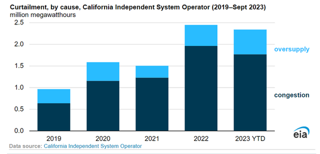 圖1加州獨立系統(tǒng)運營商的風力發(fā)電和光伏發(fā)電每月的棄電量(2015年1月~2023年7月) 隨著間歇性的光伏發(fā)電量的增加,可用的輸電基礎設施或儲能容量的缺乏導致發(fā)電量暫時過剩。當出現(xiàn)電網(wǎng)擁塞導致電力線路沒有足夠的能力輸送電力時,或者當發(fā)電量超過客戶需求時,就會出現(xiàn)棄電情況。 美國能源情報署(EIA)表示,加州的棄電主要是由于電網(wǎng)擁塞。自從2019年以來,由于光伏發(fā)電量的增長超過了輸電容量和儲能容量的增長,與電網(wǎng)擁塞相關的棄電一直在穩(wěn)步上升。
