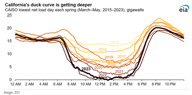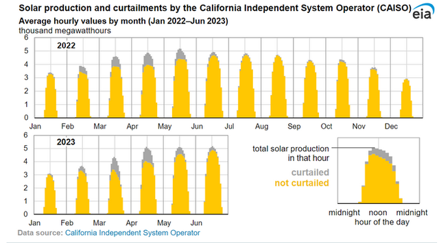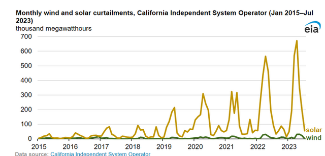 根據(jù)美國能源情報署(EIA)日前發(fā)布的一份研究報告,目前加州削減的可再生能源發(fā)電量(尤其是光伏發(fā)電)正在上升。2022年,加州獨立系統(tǒng)運營商(CAISO)削減了2400GWh的光伏系統(tǒng)和風力發(fā)電設施的電力,其中光伏發(fā)電量占95%。