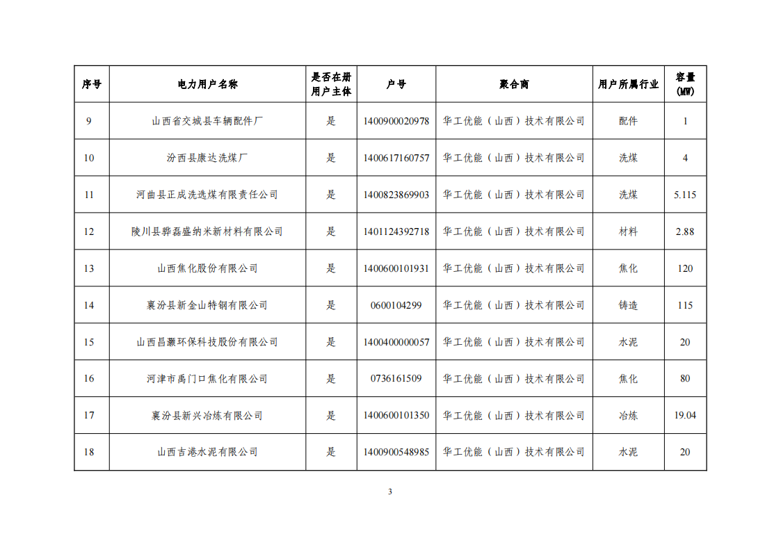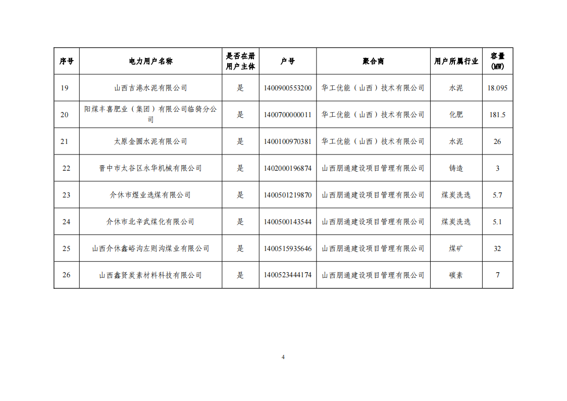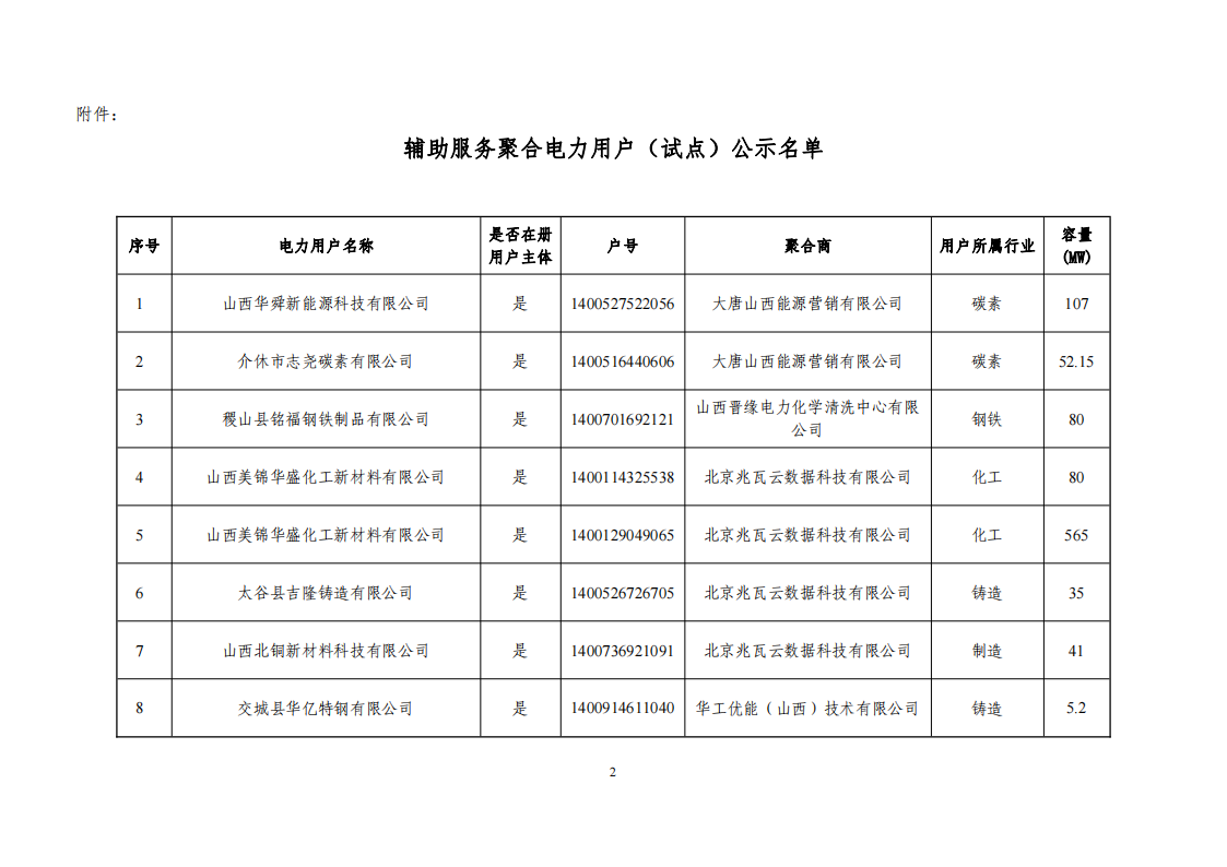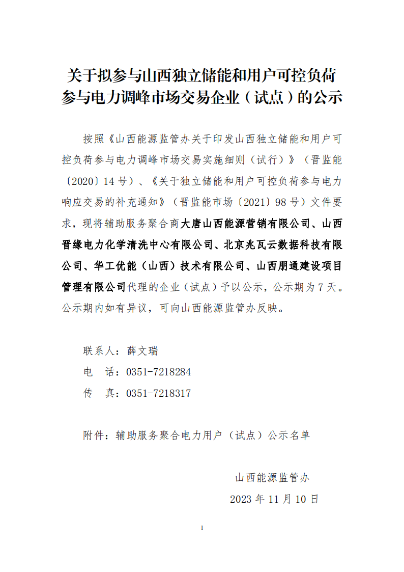 11月13日,山西能監(jiān)辦公示新一批擬參與山西獨(dú)立儲(chǔ)能和用戶可控負(fù)荷參與電力調(diào)峰市場(chǎng)交易企業(yè)(試點(diǎn))。新增26家輔助服務(wù)聚合電力用戶,聚合商大唐山西能源營(yíng)銷有限公司、山西 晉緣電力化學(xué)清洗中心有限公司、北京兆瓦云數(shù)據(jù)科技有限 公司、華工優(yōu)能(山西)技術(shù)有限公司、山西朋通建設(shè)項(xiàng)目 管理有限公司容量共計(jì)1630.78MW。