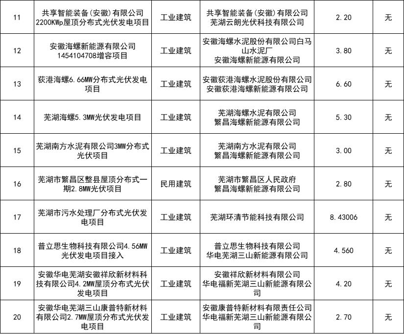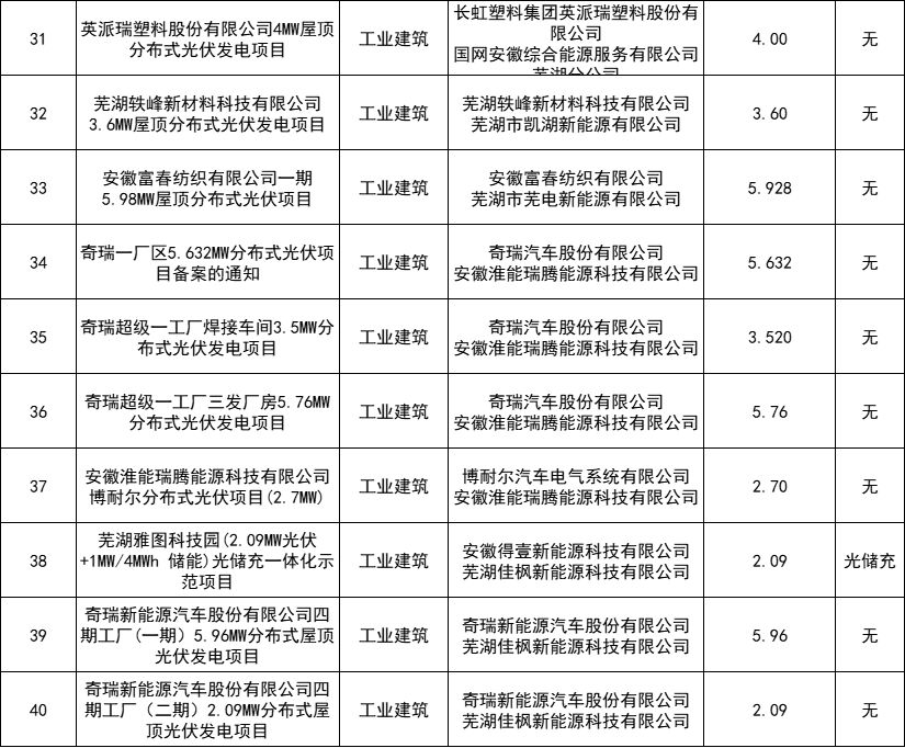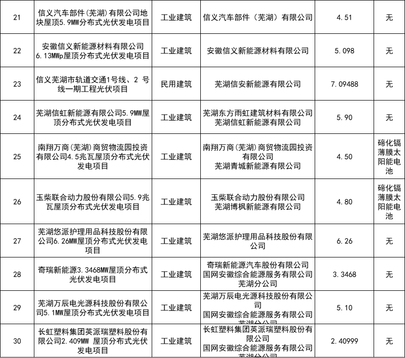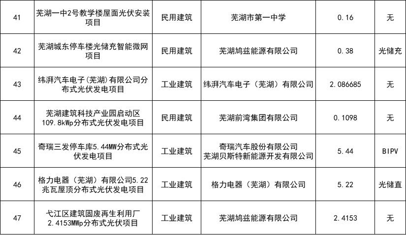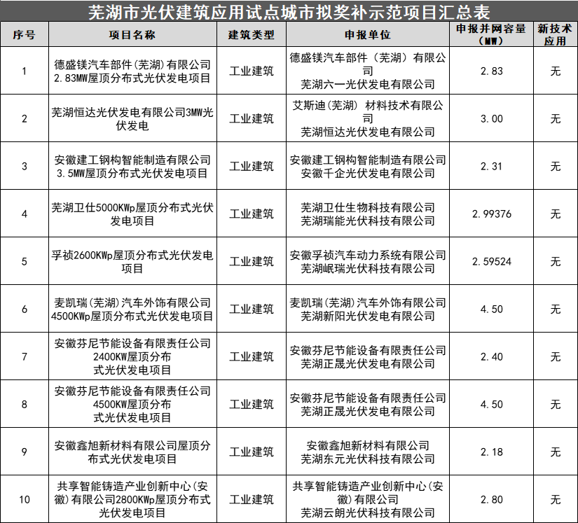 11月15日,安徽省蕪湖市住建局公示了《蕪湖市光伏建筑應用試點城市擬獎補示范項目》,共包含47個項目,總并網(wǎng)容量179.810515MW,其中部分項目采用了碲化鎘薄膜太陽能電池、光儲充、BIPV、光儲直等新技術應用。 詳情如下: 關于蕪湖市光伏建筑應用試點城市擬獎補示范項目的公示 按照《蕪湖市光伏建筑應用試點城市專項資金管理辦法》有關規(guī)定,經(jīng)項目征集、專家評審,蕪湖城東停車樓光儲充智能微網(wǎng)項目等47個項目符合獎補示范項目申報條件,現(xiàn)予以公示。 公示時間:2023年11月15日至11月21日。 任何單位或個人如有異議,可在公示期內(nèi)以書面形式將有關情況反映至蕪湖市住建局。以單位名義反映情況的,應加蓋單位公章;以個人名義反映情況的,應署真實姓名和聯(lián)系電話。 聯(lián)系電話:0553-5905179(建筑節(jié)能與科技科) 通信地址:蕪湖市鳩江區(qū)皖江財富廣場A2座9樓925 電子郵箱:whzjwkjk@163.com 附件:蕪湖市光伏建筑應用試點城市擬獎補示范項目匯總表.xlsx 蕪湖市住房和城鄉(xiāng)建設局 2023年11月15日