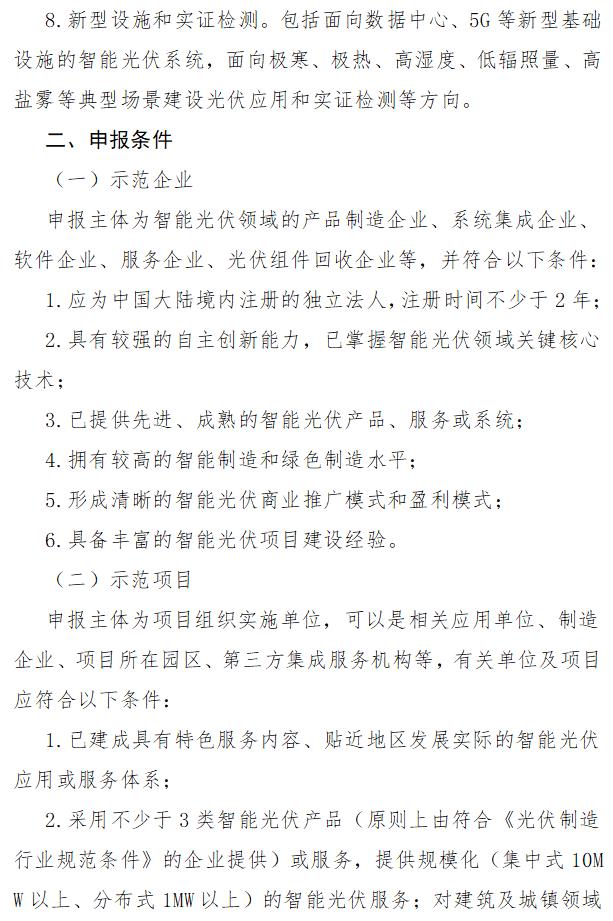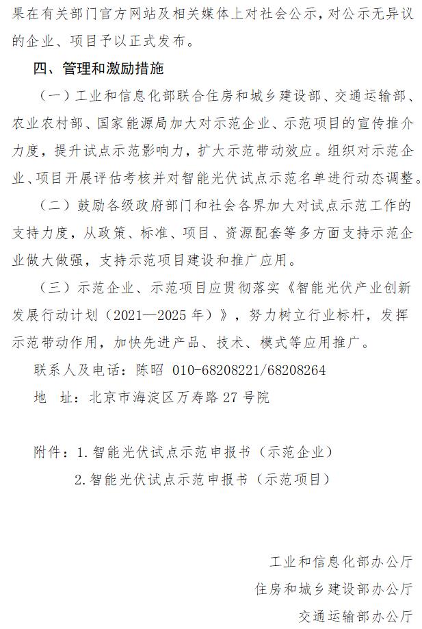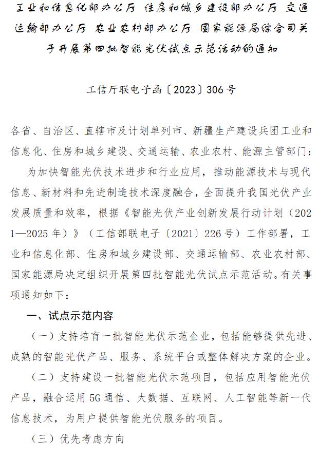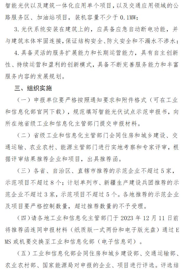 11月15日,福建省廈門(mén)市工信局發(fā)布關(guān)于開(kāi)展第四批智能光伏試點(diǎn)示范活動(dòng)的通知,要求各有關(guān)單位對(duì)照工信部官網(wǎng)通知要求自愿申報(bào),并于2023年12月1日前將項(xiàng)目申報(bào)書(shū)(紙質(zhì)版一式兩份和電子版光盤(pán))通過(guò)EMS郵寄提交廈門(mén)市工信局(電子信息處),廈門(mén)市工信局會(huì)同有關(guān)部門(mén)遴選后上報(bào)工業(yè)和信息化部。 詳情如下: 廈門(mén)市工業(yè)和信息化局關(guān)于開(kāi)展第四批智能光伏試點(diǎn)示范活動(dòng)的通知 各有關(guān)單位: 根據(jù)工業(yè)和信息化部等五部門(mén)《關(guān)于開(kāi)展第四批智能光伏試點(diǎn)示范活動(dòng)的通知》(工信廳聯(lián)電子函〔2023〕306號(hào))精神,我局?jǐn)M組織開(kāi)展第四批智能光伏試點(diǎn)示范征集工作。 請(qǐng)對(duì)照工業(yè)和信息化部官網(wǎng)通知(.cn/jgsj/dzs/wjfb/art/2023/art_27b9569d11f24ee0a1b7ace2a9830ccd.html)要求自愿申報(bào),并于2023年12月1日前將項(xiàng)目申報(bào)書(shū)(紙質(zhì)版一式兩份和電子版光盤(pán))通過(guò)EMS郵寄提交我局(電子信息處),我局會(huì)同有關(guān)部門(mén)遴選后上報(bào)工業(yè)和信息化部。 聯(lián)系方式:電子信息處2896758/2896743 地址:廈門(mén)市湖濱北路61號(hào)市政府東樓606室 附件:五部門(mén)關(guān)于開(kāi)展第四批智能光伏試點(diǎn)示范活動(dòng)的通知 廈門(mén)市工業(yè)和信息化局 2023年11月14日