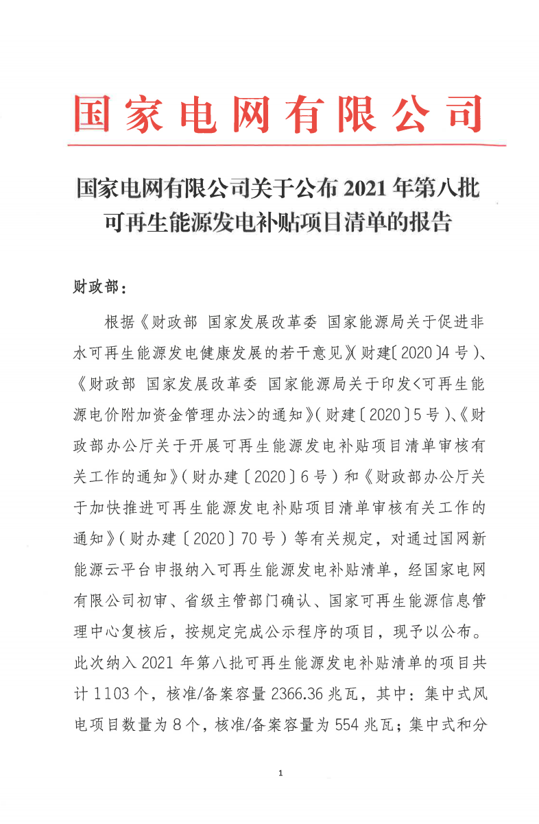 4月30日,國網(wǎng)公布2021年第八批可再生能源發(fā)電補(bǔ)貼項目清單,其中涉及集中式/分布式光伏項目共1093個,總裝機(jī)容量1793.36MW。 詳情如下: 國家電網(wǎng)有限公司關(guān)于公布2021年第八批可再生能源發(fā)電補(bǔ)貼項目清單的報告 根據(jù)《財政部 國家發(fā)展改革委 國家能源局關(guān)于促進(jìn)非水可再生能源發(fā)電健康發(fā)展的若干意見》(財建〔2020〕4號)、《財政部 國家發(fā)展改革委 國家能源局關(guān)于印發(fā)<可再生能源電價附加資金管理辦法>的通知》(財建〔2020〕5號)、《財政部辦公廳關(guān)于開展可再生能源發(fā)電補(bǔ)貼項目清單審核有關(guān)工作的通知》(財辦建〔2020〕6號)和《財政部辦公廳關(guān)于加快推進(jìn)可再生能源發(fā)電補(bǔ)貼項目清單審核有關(guān)工作的通知》(財辦建〔2020〕70號)等有關(guān)規(guī)定,國家電網(wǎng)有限公司積極配合各省級能源主管部門和國家可再生能源信息管理中心,為符合中央財政補(bǔ)助條件的可再生能源發(fā)電項目提供補(bǔ)貼清單申報服務(wù)。 2021年4月30日,我公司已將完成公示的2021年第八批可再生能源發(fā)電項目補(bǔ)貼項目清單上報國家主管部門,第八批項目清單及后續(xù)項目審核進(jìn)展情況,請登錄新能源云平臺查詢。 項目公布網(wǎng)址: Sgnec.esgcc.com.cn/atlas/projectListQuery 申報進(jìn)展查詢和公示網(wǎng)址: Sgnec.esgcc.com.cn/atlas/projectPublicity 國家電網(wǎng)有限公司 2021年4月30日