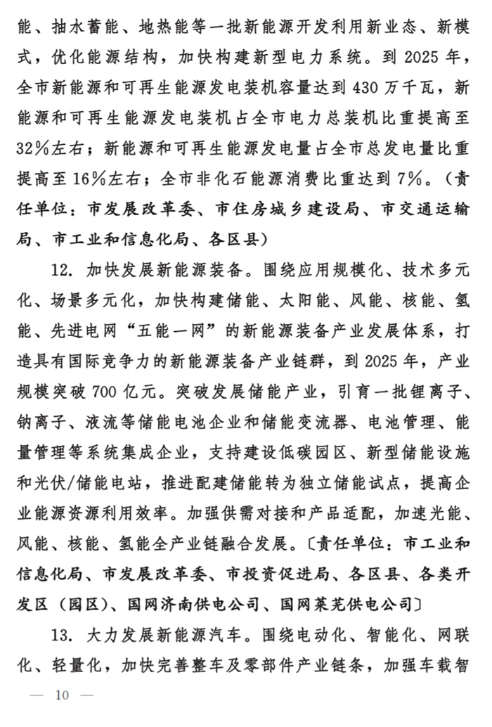 近日,山東省濟(jì)南市人民政府發(fā)布關(guān)于《推進(jìn)新型工業(yè)化加快建設(shè)工業(yè)強(qiáng)市三年行動計劃(2023-2025年)》的通知?!锻ㄖ分赋?,推動能源結(jié)構(gòu)綠色低碳轉(zhuǎn)型。以新能源項目建設(shè)為主要抓手,加快推進(jìn)光伏規(guī)?;_發(fā)、生物質(zhì)能多元利用、新能源綜合利用、電網(wǎng)優(yōu)化提升,打造儲能、氫能、生物質(zhì)能、抽水蓄能、地?zé)崮艿纫慌履茉撮_發(fā)利用新業(yè)態(tài)、新模式,優(yōu)化能源結(jié)構(gòu),加快構(gòu)建新型電力系統(tǒng)。到2025年,全市新能源和可再生能源發(fā)電裝機(jī)容量達(dá)到430萬千瓦,新能源和可再生能源發(fā)電裝機(jī)占全市電力總裝機(jī)比重提高至32%左右;新能源和可再生能源發(fā)電量占全市總發(fā)電量比重提高至16%左右;全市非化石能源消費(fèi)比重達(dá)到7%。