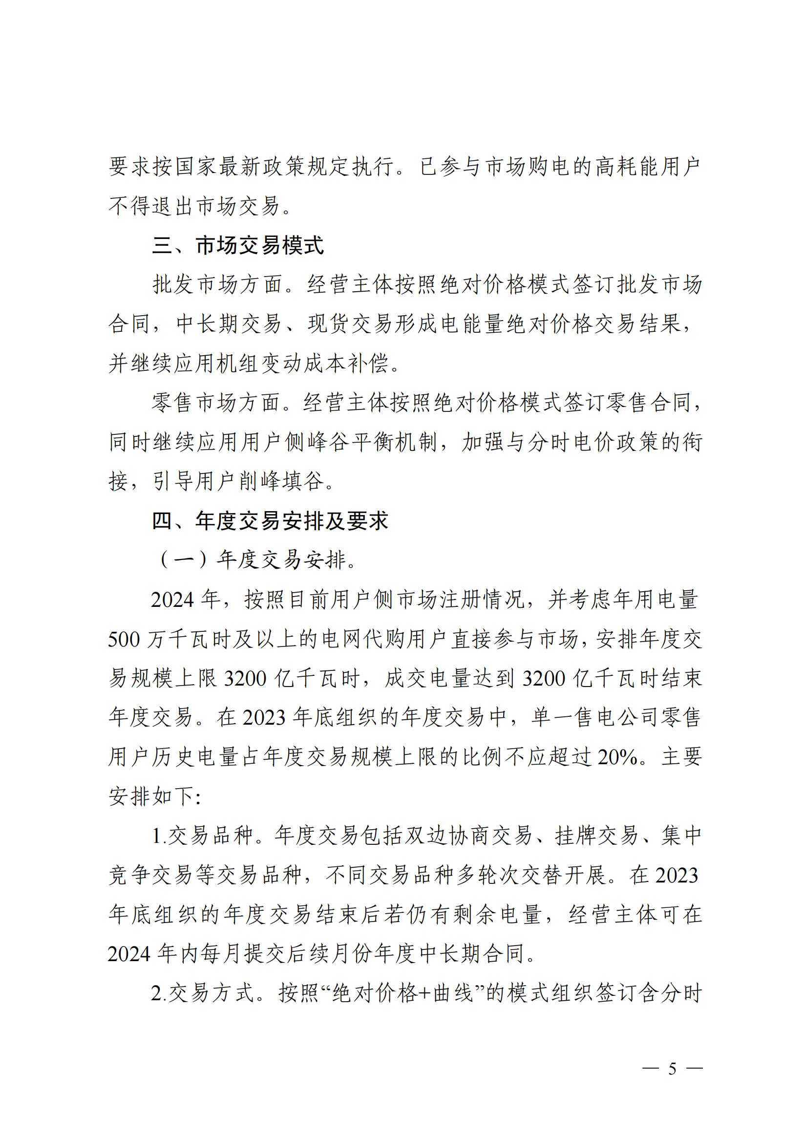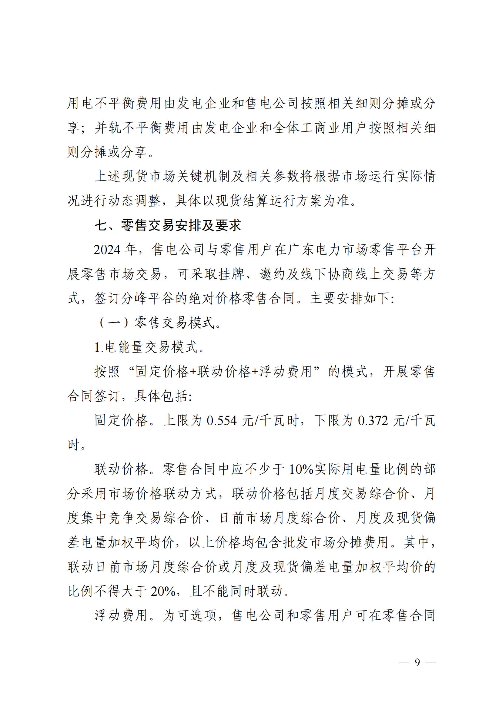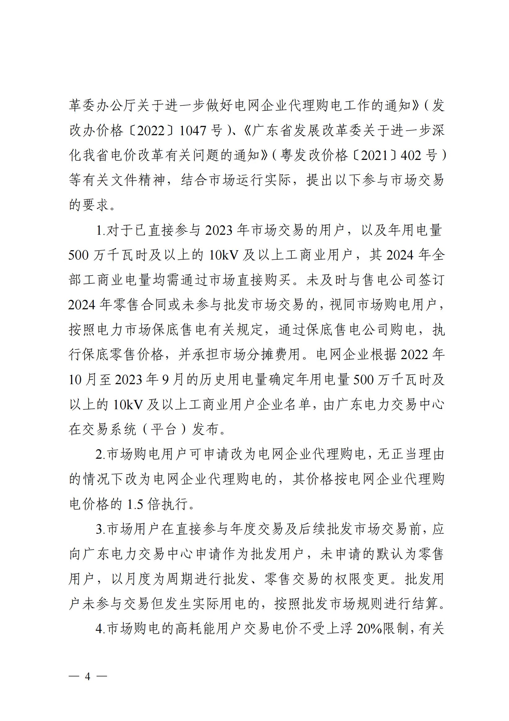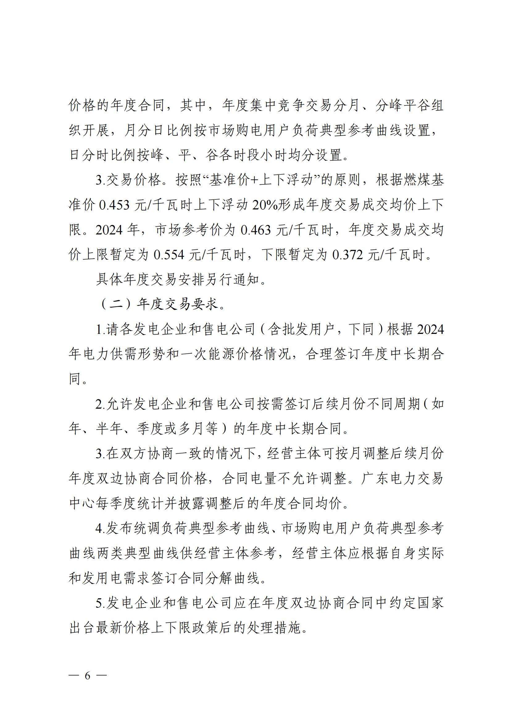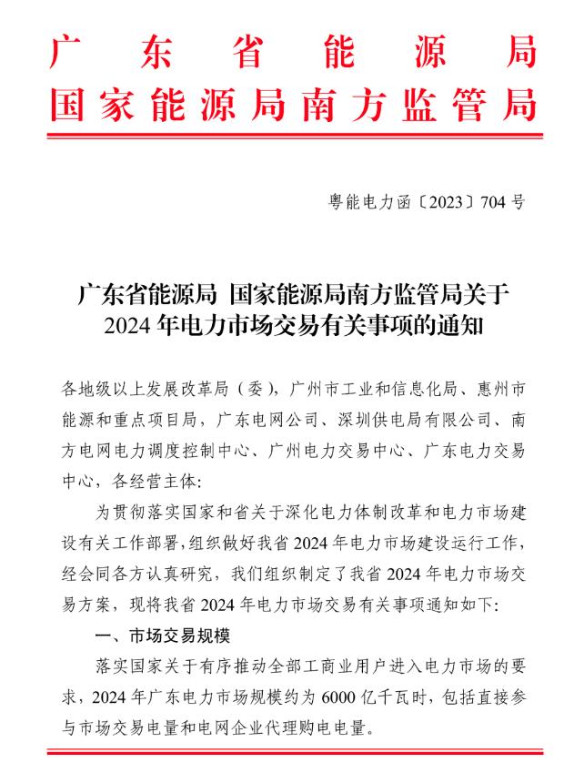 11月21日,廣東省能源局、南方能監(jiān)辦聯(lián)合發(fā)布《關(guān)于2024年電力市場交易有關(guān)事項的通知》。通知中提出,對廣東省2024年電力市場交易有關(guān)事項作出如下安排: 市場規(guī)模:2024年廣東電力市場規(guī)模約為6000億千瓦時,與2023年5500億千瓦時的市場規(guī)模相比,增加了500億千瓦時。市場主體準(zhǔn)入標(biāo)準(zhǔn):鼓勵 10kV 及以上工商業(yè)用戶直接參與市場交易,其中年用電量 500 萬千瓦時及以上的工商業(yè)用戶原則上直接參與市場交易;具備條件的 10kV 以下工商業(yè)用戶可自主選擇直接參與市場交易。 對于2023年已經(jīng)參與市場交易的用戶,以及年用電量滿足500萬千瓦時的 10kV 及以上工商業(yè)用戶,2024年均需直接參與市場交易,未及時與售電公司簽訂2024 年零售合同或未參與批發(fā)市場交易的,將通過保底售電公司購電,執(zhí)行保底零售價格,并承擔(dān)市場分?jǐn)傎M用。 市場購電用戶可申請改為電網(wǎng)企業(yè)代理購電,無正當(dāng)理由的情況下改為電網(wǎng)企業(yè)代理購電的,其價格按電網(wǎng)企業(yè)代理購電價格的1.5倍執(zhí)行。 在發(fā)電側(cè)經(jīng)營主體中提及,220kV及以上電壓等級的中調(diào)調(diào)管風(fēng)電場站、光伏電站全部作為市場交易電源,參與現(xiàn)貨市場交易,適時參與中長期市場交易(含綠電交易);參加綠電交易的發(fā)電企業(yè)準(zhǔn)入條件按廣東可再生能源交易最新規(guī)則執(zhí)行。 年度交易安排:年度交易規(guī)模上限 3200 億千瓦時,成交電量達(dá)到 3200 億千瓦時結(jié)束年度交易。電能量零售交易模式:按照“固定價格+聯(lián)動價格+浮動費用”的模式開展電能量零售合同簽訂,其中: 固定價格:上限為 0.554 元/千瓦時,下限為 0.372 元/千瓦時。 聯(lián)動模式:最低10%實際用電量比例的部分采用市場價格聯(lián)動方式。 浮動費用:上限由2023年的0.02 元/千瓦時調(diào)整為 0.015 元/千瓦時,下限為 0 元/千瓦時。綠電零售交易模式:按照“固定價格+聯(lián)動價格+偏差費用”的模式,開展綠電零售合同簽訂,其中:固定價格:上限為 0.05 元/千瓦時,下限為 0 元/千瓦時。峰平谷比例:原執(zhí)行峰谷價格的市場購電用戶,其簽訂的零售合同電能量峰平谷比例不變(深圳暫定1.53:1:0.32,其他地市暫定1.7:1:0.38,蓄冷用戶暫定1.65:1:0.25)。 詳情如下: