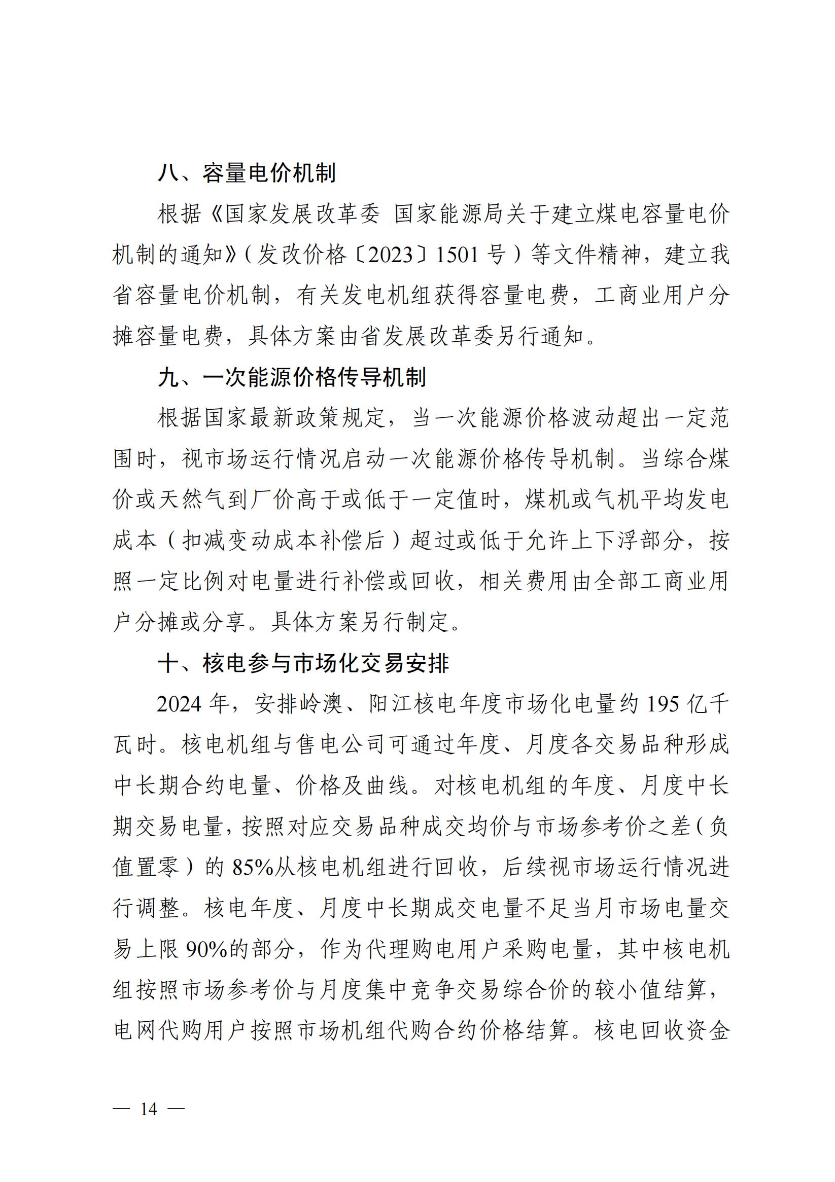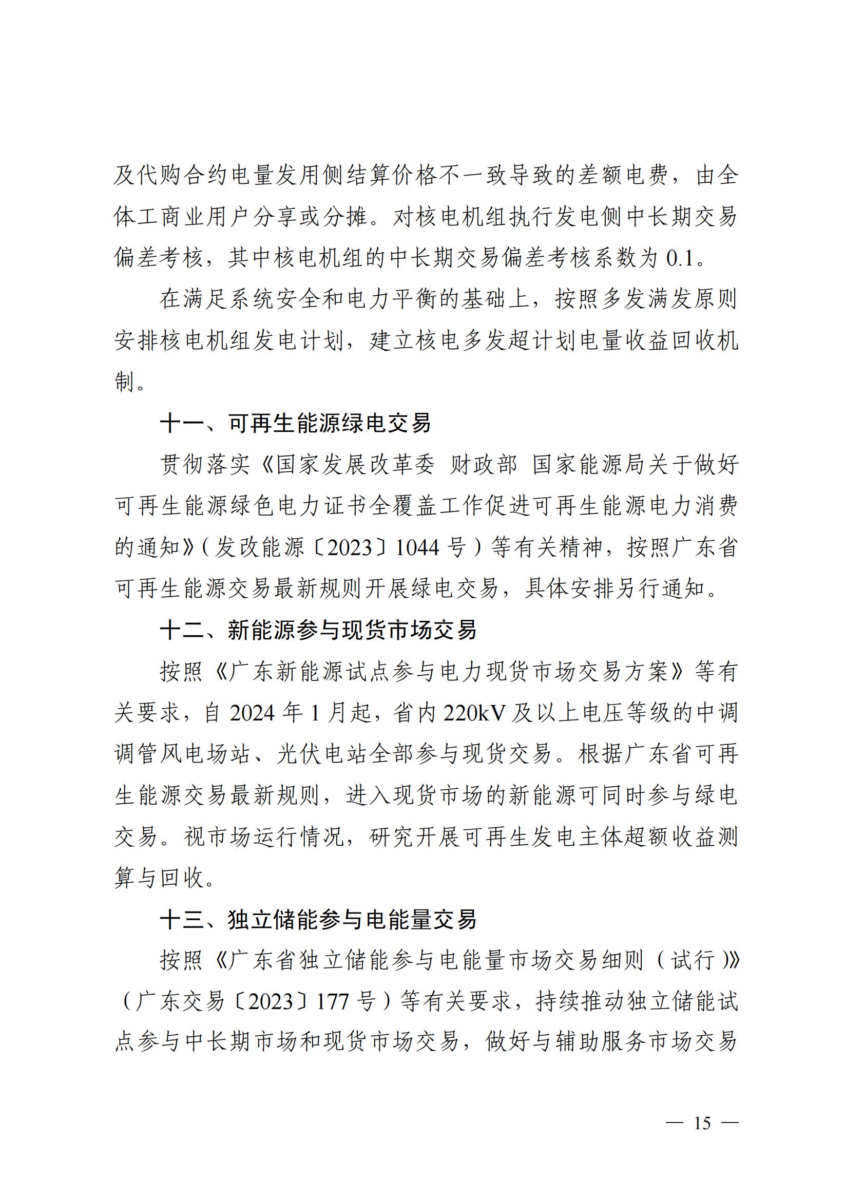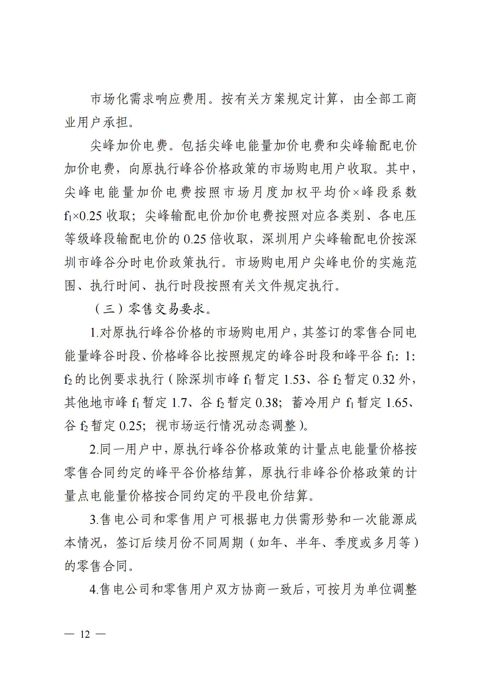 11月21日,廣東省能源局、南方能監(jiān)辦聯(lián)合發(fā)布《關(guān)于2024年電力市場交易有關(guān)事項的通知》。通知中提出,對廣東省2024年電力市場交易有關(guān)事項作出如下安排: 市場規(guī)模:2024年廣東電力市場規(guī)模約為6000億千瓦時,與2023年5500億千瓦時的市場規(guī)模相比,增加了500億千瓦時。市場主體準(zhǔn)入標(biāo)準(zhǔn):鼓勵 10kV 及以上工商業(yè)用戶直接參與市場交易,其中年用電量 500 萬千瓦時及以上的工商業(yè)用戶原則上直接參與市場交易;具備條件的 10kV 以下工商業(yè)用戶可自主選擇直接參與市場交易。 對于2023年已經(jīng)參與市場交易的用戶,以及年用電量滿足500萬千瓦時的 10kV 及以上工商業(yè)用戶,2024年均需直接參與市場交易,未及時與售電公司簽訂2024 年零售合同或未參與批發(fā)市場交易的,將通過保底售電公司購電,執(zhí)行保底零售價格,并承擔(dān)市場分?jǐn)傎M用。 市場購電用戶可申請改為電網(wǎng)企業(yè)代理購電,無正當(dāng)理由的情況下改為電網(wǎng)企業(yè)代理購電的,其價格按電網(wǎng)企業(yè)代理購電價格的1.5倍執(zhí)行。 在發(fā)電側(cè)經(jīng)營主體中提及,220kV及以上電壓等級的中調(diào)調(diào)管風(fēng)電場站、光伏電站全部作為市場交易電源,參與現(xiàn)貨市場交易,適時參與中長期市場交易(含綠電交易);參加綠電交易的發(fā)電企業(yè)準(zhǔn)入條件按廣東可再生能源交易最新規(guī)則執(zhí)行。 年度交易安排:年度交易規(guī)模上限 3200 億千瓦時,成交電量達(dá)到 3200 億千瓦時結(jié)束年度交易。電能量零售交易模式:按照“固定價格+聯(lián)動價格+浮動費用”的模式開展電能量零售合同簽訂,其中: 固定價格:上限為 0.554 元/千瓦時,下限為 0.372 元/千瓦時。 聯(lián)動模式:最低10%實際用電量比例的部分采用市場價格聯(lián)動方式。 浮動費用:上限由2023年的0.02 元/千瓦時調(diào)整為 0.015 元/千瓦時,下限為 0 元/千瓦時。綠電零售交易模式:按照“固定價格+聯(lián)動價格+偏差費用”的模式,開展綠電零售合同簽訂,其中:固定價格:上限為 0.05 元/千瓦時,下限為 0 元/千瓦時。峰平谷比例:原執(zhí)行峰谷價格的市場購電用戶,其簽訂的零售合同電能量峰平谷比例不變(深圳暫定1.53:1:0.32,其他地市暫定1.7:1:0.38,蓄冷用戶暫定1.65:1:0.25)。 詳情如下: