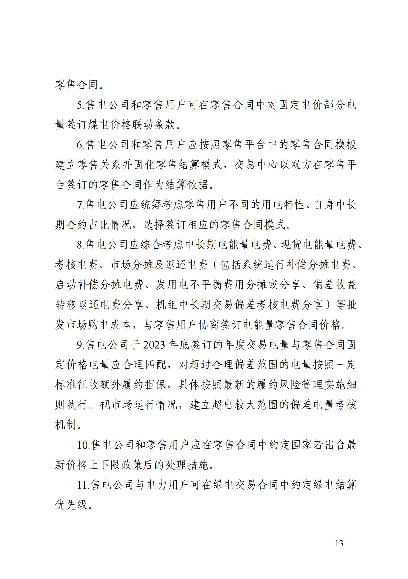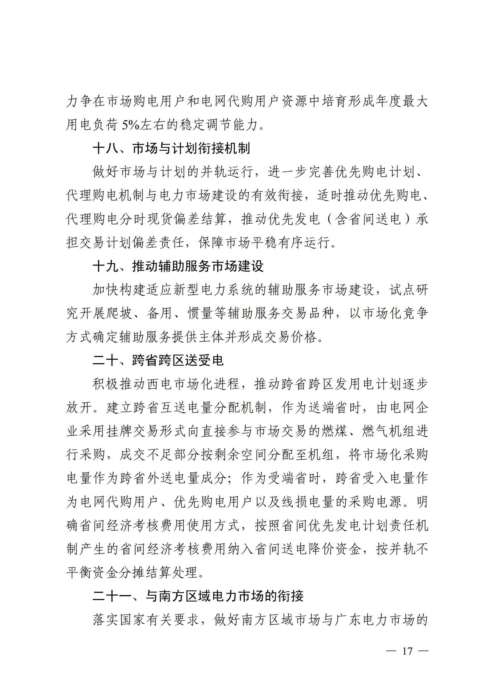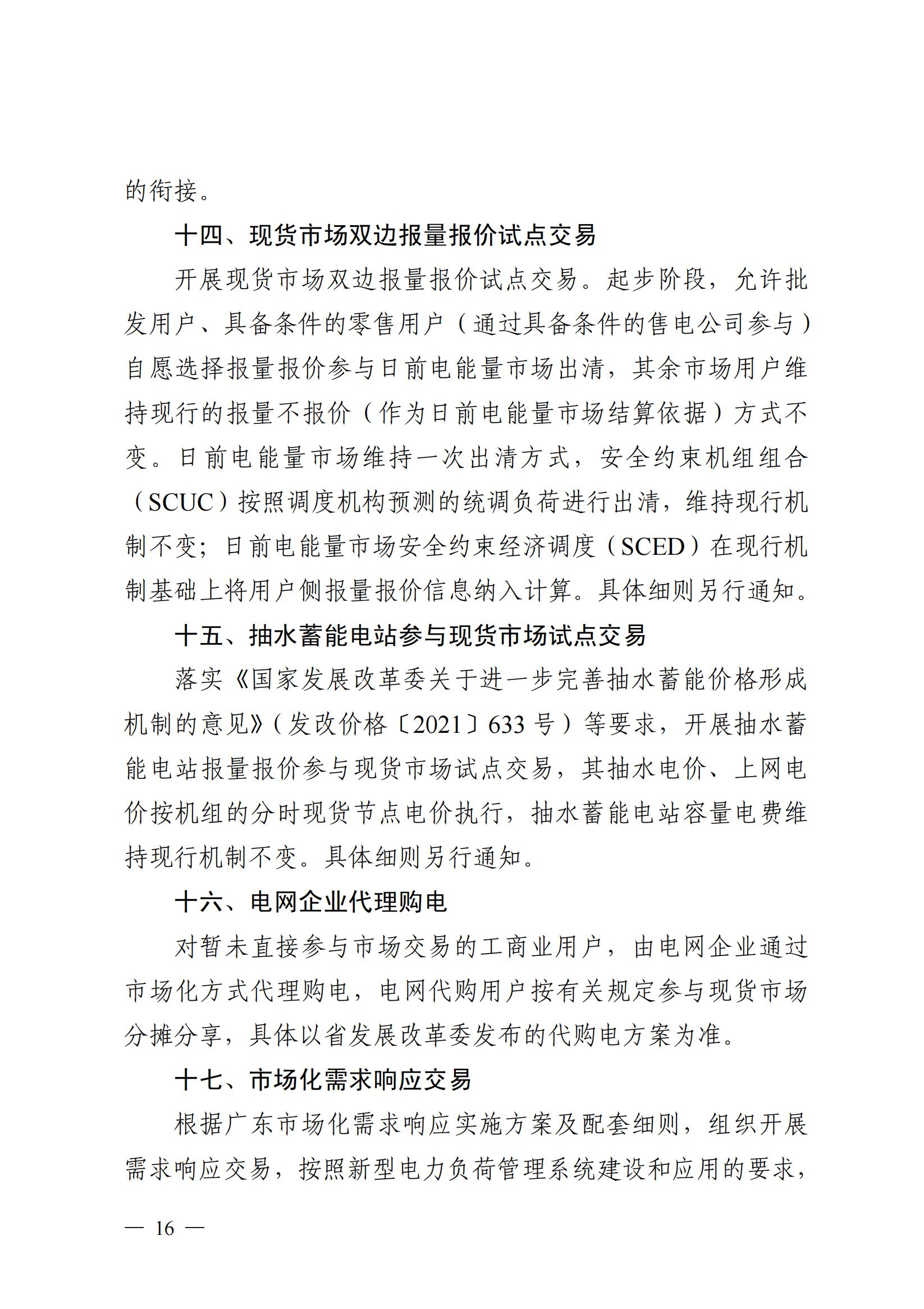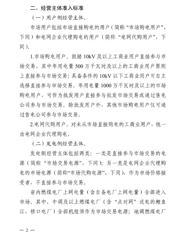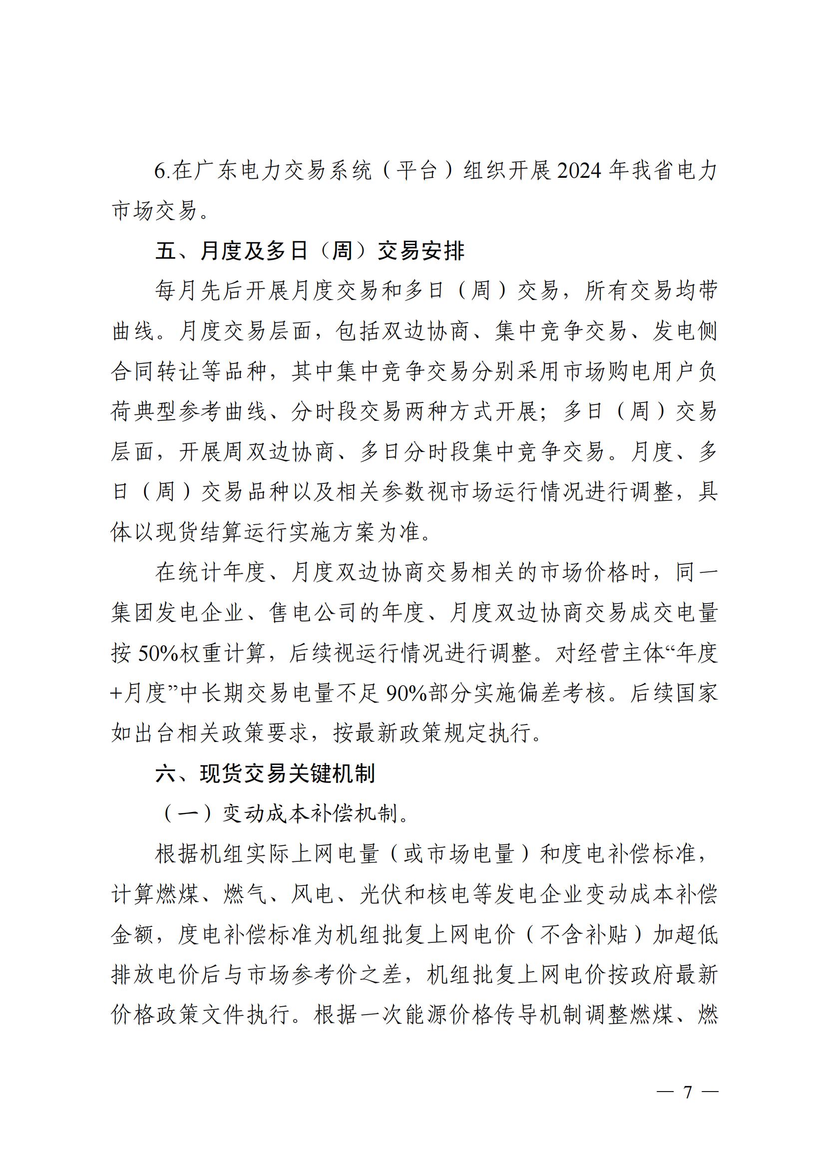 11月21日,廣東省能源局、南方能監(jiān)辦聯(lián)合發(fā)布《關(guān)于2024年電力市場交易有關(guān)事項的通知》。通知中提出,對廣東省2024年電力市場交易有關(guān)事項作出如下安排: 市場規(guī)模:2024年廣東電力市場規(guī)模約為6000億千瓦時,與2023年5500億千瓦時的市場規(guī)模相比,增加了500億千瓦時。市場主體準(zhǔn)入標(biāo)準(zhǔn):鼓勵 10kV 及以上工商業(yè)用戶直接參與市場交易,其中年用電量 500 萬千瓦時及以上的工商業(yè)用戶原則上直接參與市場交易;具備條件的 10kV 以下工商業(yè)用戶可自主選擇直接參與市場交易。 對于2023年已經(jīng)參與市場交易的用戶,以及年用電量滿足500萬千瓦時的 10kV 及以上工商業(yè)用戶,2024年均需直接參與市場交易,未及時與售電公司簽訂2024 年零售合同或未參與批發(fā)市場交易的,將通過保底售電公司購電,執(zhí)行保底零售價格,并承擔(dān)市場分?jǐn)傎M用。 市場購電用戶可申請改為電網(wǎng)企業(yè)代理購電,無正當(dāng)理由的情況下改為電網(wǎng)企業(yè)代理購電的,其價格按電網(wǎng)企業(yè)代理購電價格的1.5倍執(zhí)行。 在發(fā)電側(cè)經(jīng)營主體中提及,220kV及以上電壓等級的中調(diào)調(diào)管風(fēng)電場站、光伏電站全部作為市場交易電源,參與現(xiàn)貨市場交易,適時參與中長期市場交易(含綠電交易);參加綠電交易的發(fā)電企業(yè)準(zhǔn)入條件按廣東可再生能源交易最新規(guī)則執(zhí)行。 年度交易安排:年度交易規(guī)模上限 3200 億千瓦時,成交電量達(dá)到 3200 億千瓦時結(jié)束年度交易。電能量零售交易模式:按照“固定價格+聯(lián)動價格+浮動費用”的模式開展電能量零售合同簽訂,其中: 固定價格:上限為 0.554 元/千瓦時,下限為 0.372 元/千瓦時。 聯(lián)動模式:最低10%實際用電量比例的部分采用市場價格聯(lián)動方式。 浮動費用:上限由2023年的0.02 元/千瓦時調(diào)整為 0.015 元/千瓦時,下限為 0 元/千瓦時。綠電零售交易模式:按照“固定價格+聯(lián)動價格+偏差費用”的模式,開展綠電零售合同簽訂,其中:固定價格:上限為 0.05 元/千瓦時,下限為 0 元/千瓦時。峰平谷比例:原執(zhí)行峰谷價格的市場購電用戶,其簽訂的零售合同電能量峰平谷比例不變(深圳暫定1.53:1:0.32,其他地市暫定1.7:1:0.38,蓄冷用戶暫定1.65:1:0.25)。 詳情如下: