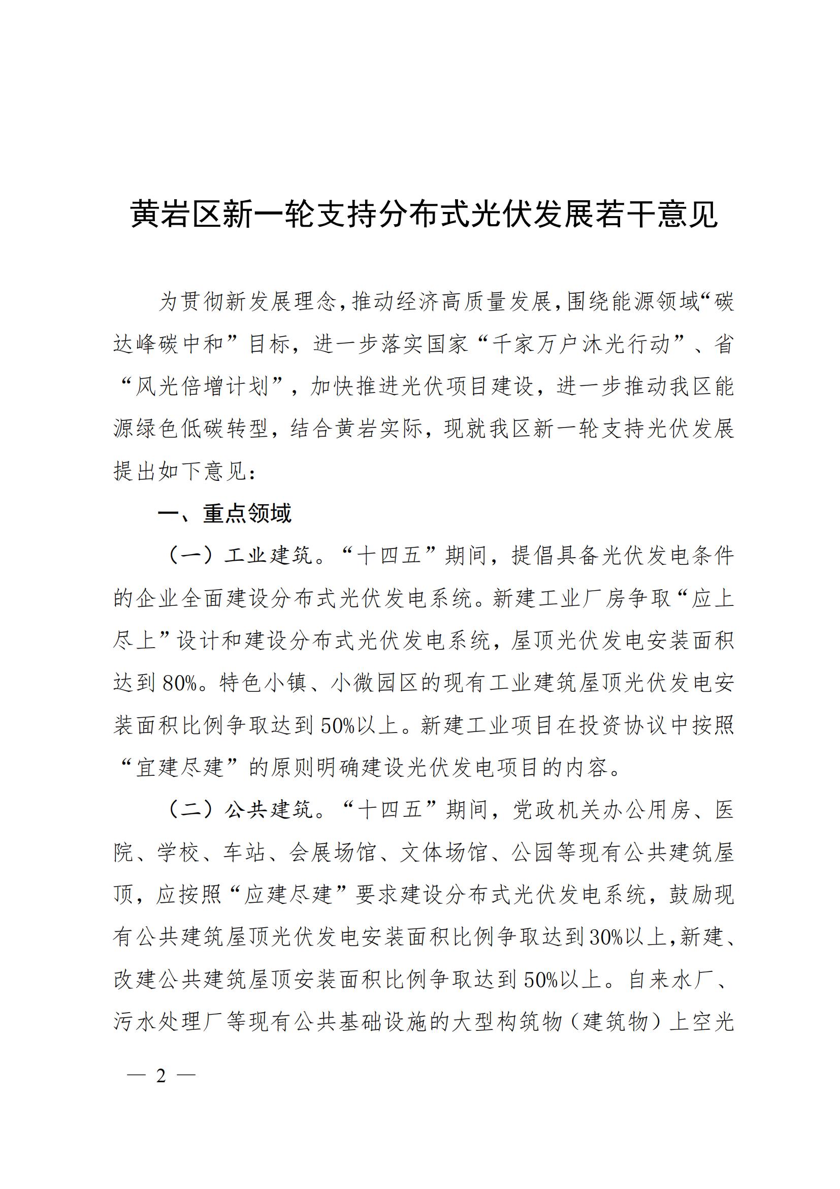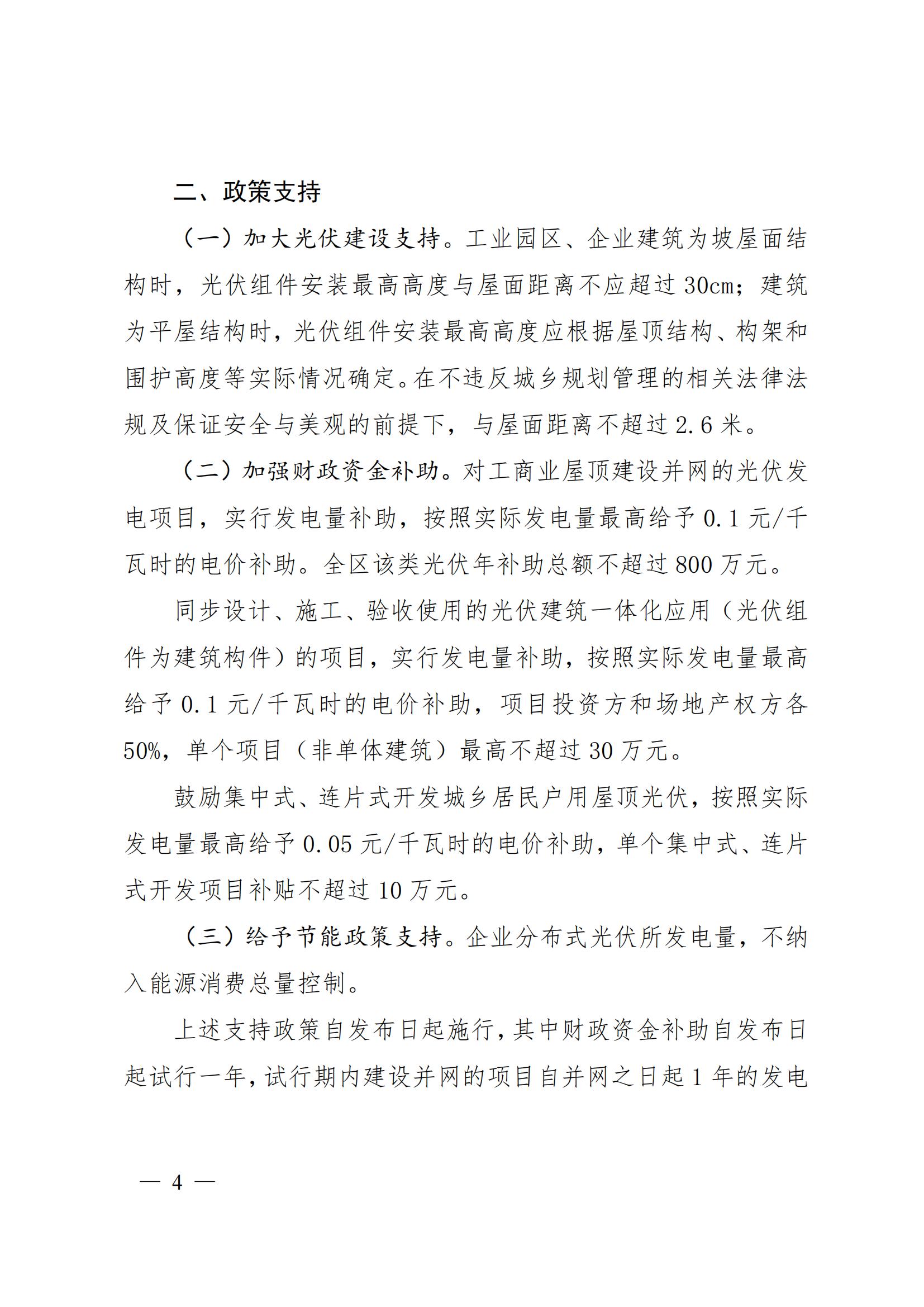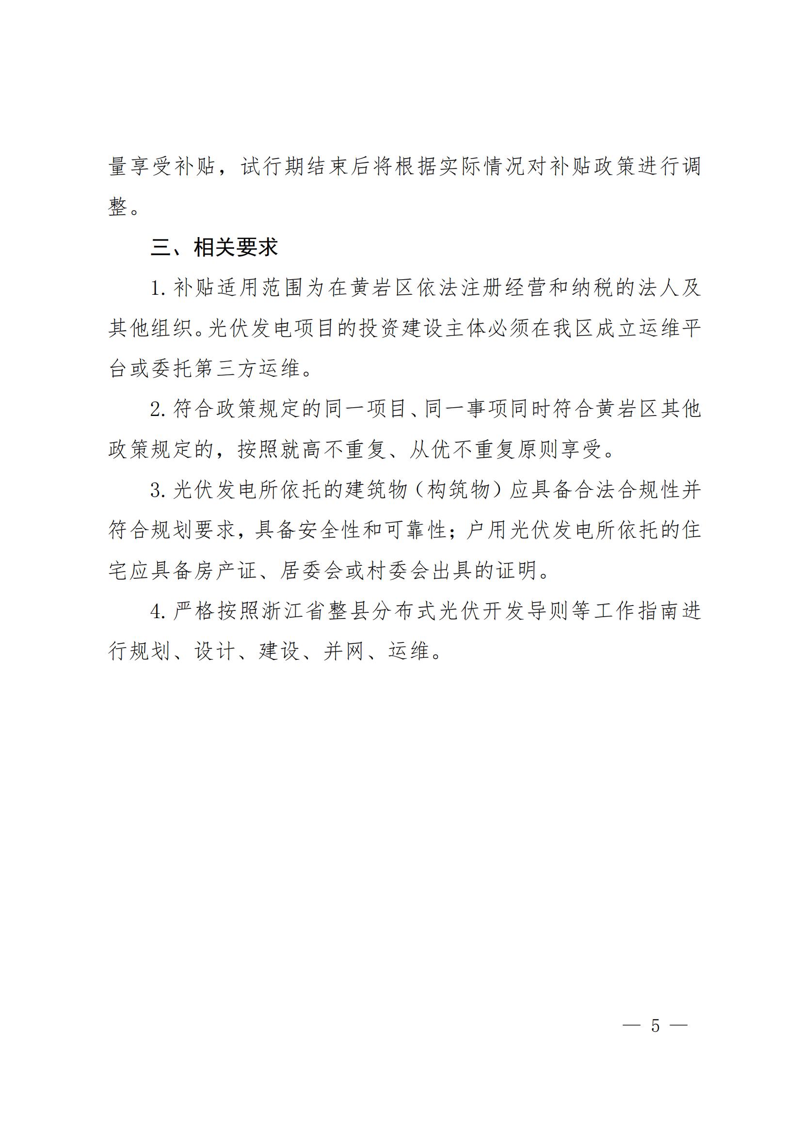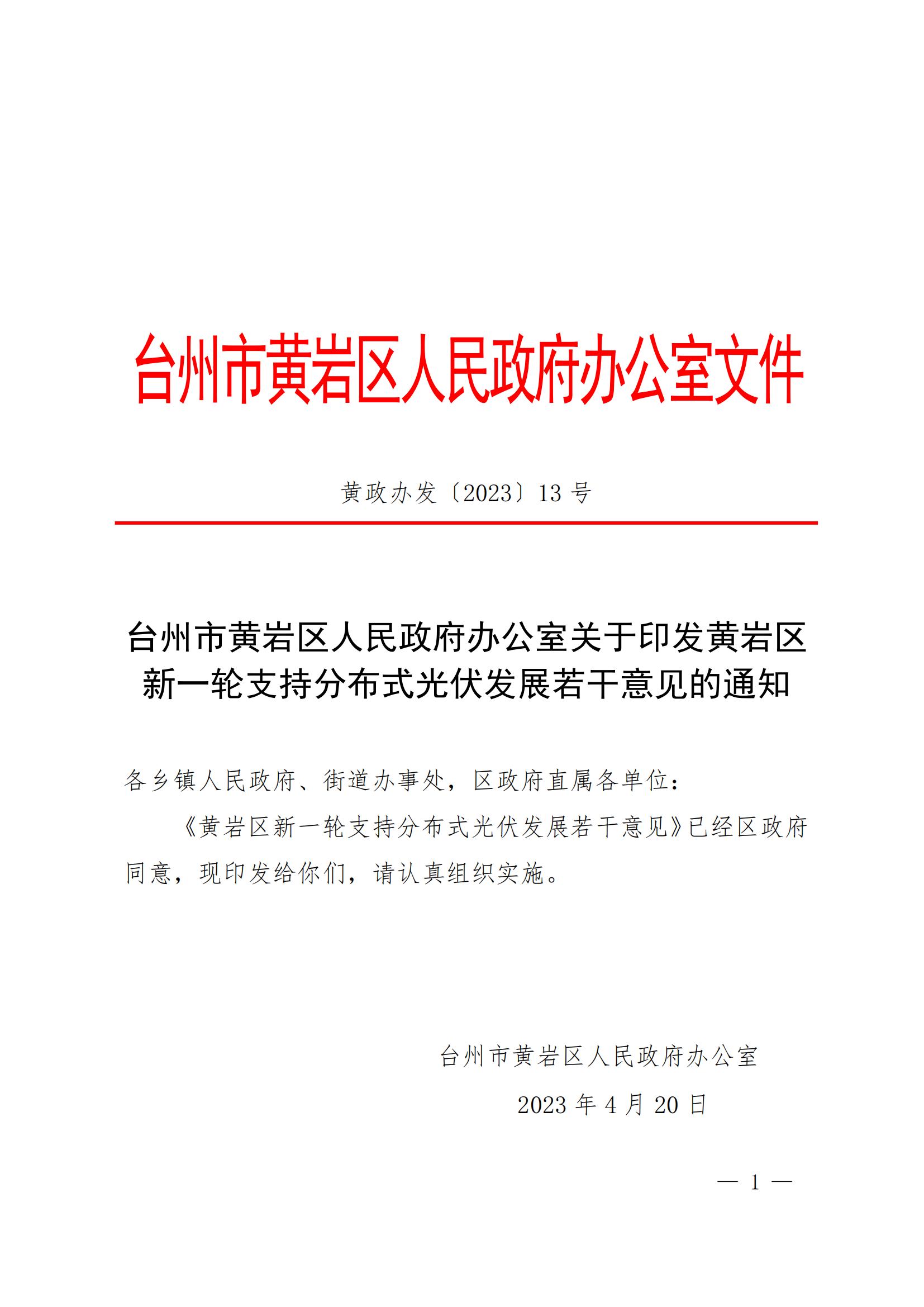 日前,浙江臺(tái)州市黃巖區(qū)人民政府辦公室關(guān)于印發(fā)黃巖區(qū)新一輪支持分布式光伏發(fā)展若干意見的通知。文件指出,對(duì)工商業(yè)屋頂建設(shè)并網(wǎng)的光伏發(fā) 電項(xiàng)目,實(shí)行發(fā)電量補(bǔ)助,按照實(shí)際發(fā)電量最高給予0.1元/千瓦時(shí)的電價(jià)補(bǔ)助。全區(qū)該類光伏年補(bǔ)助總額不超過800萬元。 同步設(shè)計(jì)、施工、驗(yàn)收使用的光伏建筑一體化應(yīng)用(光伏組件為建筑構(gòu)件)的項(xiàng)目,實(shí)行發(fā)電量補(bǔ)助,按照實(shí)際發(fā)電量最高給予0.1元/千瓦時(shí)的電價(jià)補(bǔ)助,項(xiàng)目投資方和場(chǎng)地產(chǎn)權(quán)方各50%,單個(gè)項(xiàng)目(非單體建筑)最高不超過30萬元。 鼓勵(lì)集中式、連片式開發(fā)城鄉(xiāng)居民戶用屋頂光伏,按照實(shí)際發(fā)電量最高給予 0.05元/千瓦時(shí)的電價(jià)補(bǔ)助,單個(gè)集中式、連片 式開發(fā)項(xiàng)目補(bǔ)貼不超過10萬元。 給予節(jié)能政策支持。企業(yè)分布式光伏所發(fā)電量,不納入能源消費(fèi)總量控制。 文件原文如下: