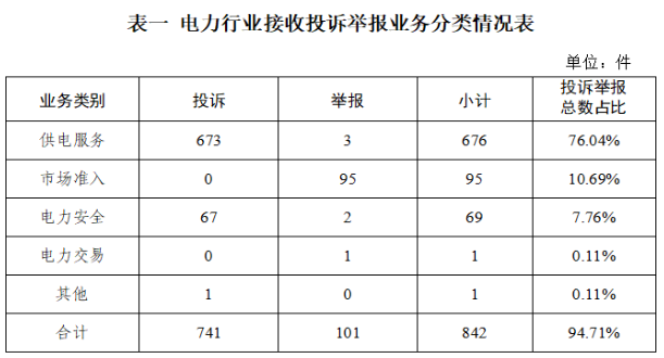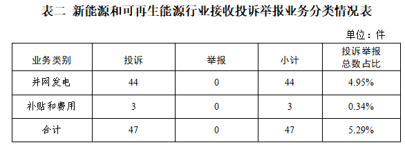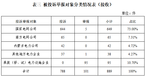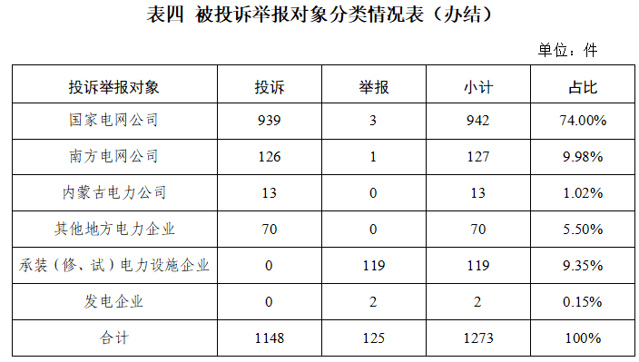 2023年10月,國家能源局12398能源監(jiān)管熱線(以下簡稱12398熱線)共接收投訴舉報889件,辦結(jié)投訴舉報1273件(含往期結(jié)轉(zhuǎn))?,F(xiàn)將有關(guān)情況通報如下: 一、當月接收情況 2023年10月,12398熱線共接收投訴舉報889件,環(huán)比增長3.01%、同比增長28.28%。其中:投訴788件,環(huán)比增長5.07%、同比增長27.30%;舉報101件,環(huán)比下降10.62%、同比增長36.49%。 (一)分類情況 1.按被投訴舉報行業(yè)分類 電力行業(yè)排在首位,數(shù)量為842件、占投訴舉報總數(shù)的94.71%,主要集中在供電服務、市場準入、電力安全等方面。 新能源和可再生能源行業(yè)排在第二位,數(shù)量為47件、占投訴舉報總數(shù)的5.29%,主要集中在并網(wǎng)發(fā)電、補貼和費用等方面。 2.按被投訴舉報對象分類 供電企業(yè)794件、占投訴舉報總數(shù)的89.31%,其中國家電網(wǎng)公司649件、占投訴舉報總數(shù)的73.00%,南方電網(wǎng)公司65件、占投訴舉報總數(shù)的7.31%,內(nèi)蒙古電力公司42件、占投訴舉報總數(shù)的4.72%,其他地方電力企業(yè)38件、占投訴舉報總數(shù)的4.27%;承裝(修、試)電力設(shè)施企業(yè)95件、占投訴舉報總數(shù)的10.70%。 (二)地區(qū)分布情況 各?。ㄗ灾螀^(qū)、直轄市)按照接收投訴舉報數(shù)量排序,黑龍江、遼寧、內(nèi)蒙古、山東、河北排在全國前5位。其中:按投訴數(shù)量排序,黑龍江、遼寧、內(nèi)蒙古、山東、河北排在全國前5位;按舉報數(shù)量排序,廣東、河北、陜西、廣西(湖北、湖南并列)排在全國前5位;按百萬人均投訴舉報數(shù)量排序,黑龍江、內(nèi)蒙古、西藏、吉林、遼寧排在全國前5位。(全國接收投訴舉報地區(qū)分布情況詳見附件1) (三)主要問題 2023年10月,接收的投訴舉報主要反映了4個方面的問題。 1.用電報裝問題。個別供電企業(yè)用電報裝管理不規(guī)范,在用戶提交用電申請后,未按照規(guī)定時限完成用戶裝表接電工作,引發(fā)群眾投訴。 投訴舉報量靠前的2個省份為黑龍江(56件)、內(nèi)蒙古(35件)。 2.停電搶修問題。個別供電企業(yè)在故障停電或用戶繳費后未及時恢復供電,影響群眾正常用電。 投訴舉報量靠前的2個省份為黑龍江(13件)、山東(11件)。 3.電能質(zhì)量問題。受洪澇、低溫冷凍、雪災等自然災害影響,以及部分偏遠農(nóng)村和山區(qū)線路超負荷運行、臺區(qū)供電半徑較長,導致故障停電、低電壓等電能質(zhì)量問題。 投訴舉報量靠前的2個省份為黑龍江(13件)、遼寧(12件)。 4.新能源和可再生能源行業(yè)相關(guān)問題。部分地區(qū)分布式光伏發(fā)電項目因當?shù)嘏_區(qū)容量不足,導致并網(wǎng)困難等問題。 投訴舉報量靠前的2個省份為山東(10件)、江蘇(7件)。 二、當月處理情況 (一)受理情況 2023年10月,根據(jù)國家有關(guān)法規(guī)政策規(guī)定,國家能源局派出機構(gòu)對屬于監(jiān)管職責范圍的843件投訴舉報進行了受理,占接收數(shù)量的94.83%;其他不予受理的,已按照國家有關(guān)法規(guī)政策及時轉(zhuǎn)辦。 (二)辦結(jié)情況 2023年10月,國家能源局派出機構(gòu)辦結(jié)投訴舉報1273件(含往期結(jié)轉(zhuǎn)),環(huán)比增長6.08%、同比增長18.97%,累計辦結(jié)率98.26%。其中:投訴1148件,環(huán)比增長9.02%、同比增長14.57%;舉報125件,環(huán)比下降14.97%、同比增長81.16%。 從被投訴舉報對象看,供電企業(yè)1152件、占投訴舉報總數(shù)的90.49%,其中國家電網(wǎng)公司942件、占比74.00%,南方電網(wǎng)公司127件、占比9.98%,內(nèi)蒙古電力公司13件、占比1.02%,其他地方電力企業(yè)70件、占比5.50%;承裝(修、試)電力設(shè)施企業(yè)119件、占比9.35%;發(fā)電企業(yè)2件,占比0.15%。 (三)問題處置情況 針對群眾反映的投訴舉報,國家能源局派出機構(gòu)嚴格根據(jù)國家有關(guān)法規(guī)政策進行處理。一是督促供電企業(yè)進一步規(guī)范用電報裝管理,強化業(yè)擴報裝全流程管控,嚴格按照規(guī)定時限完成裝表接電;二是要求供電企業(yè)加強設(shè)備隱患排查整治和停電搶修管理,加強線路巡視頻次,及時消除隱患缺陷,增加搶修資源投入,提升設(shè)備管控和停電搶修能力,切實提高供電質(zhì)量;三是通過行政處罰、監(jiān)管約談、責令整改等方式,糾正有關(guān)企業(yè)違法違規(guī)行為,維護公平公正的市場秩序和群眾合法權(quán)益;四是通過解釋說明、澄清事實,使群眾消除誤解。(2023年10月12398熱線典型投訴舉報事項具體處理情況見附件2)