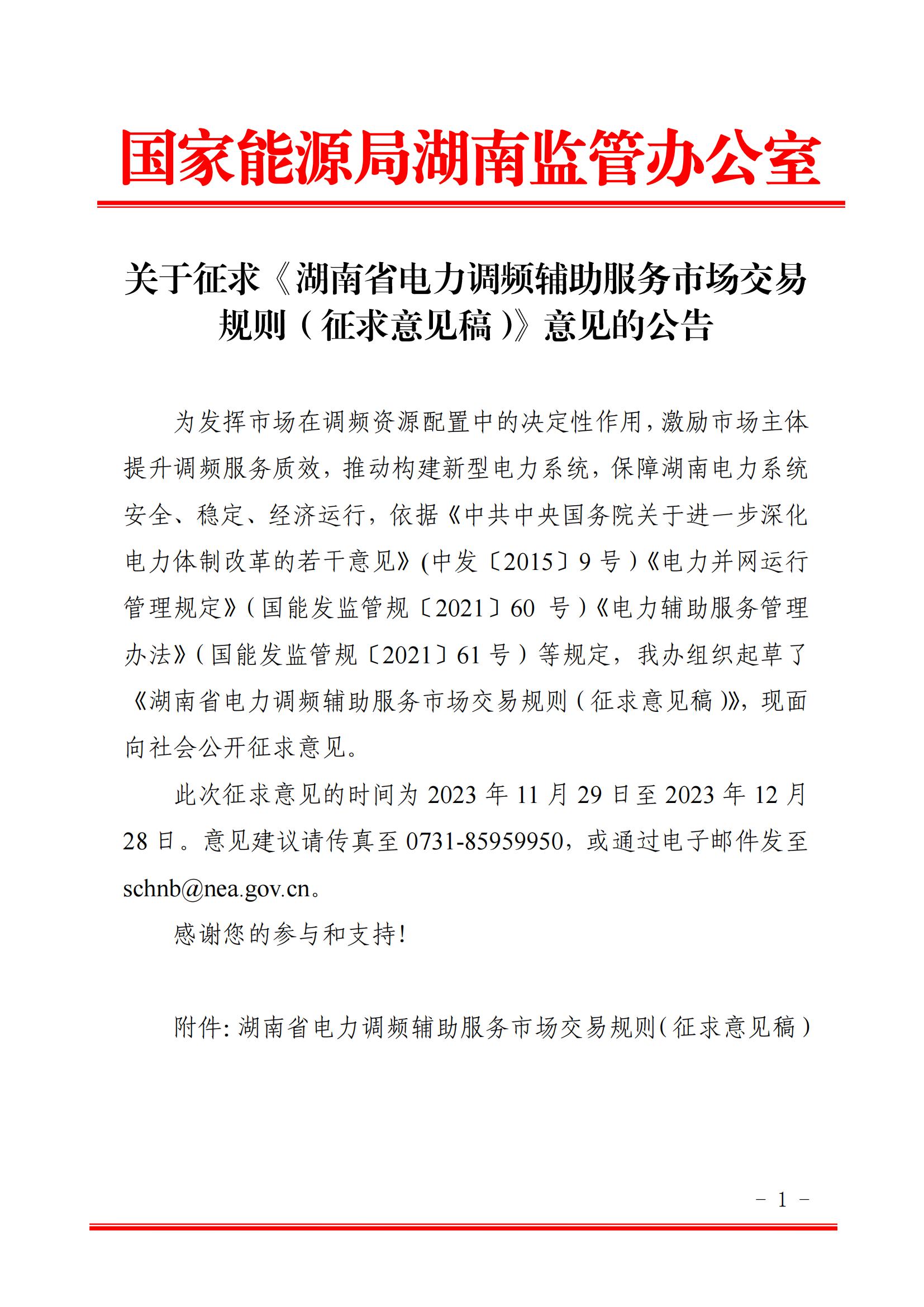 11月29日,國家能源局湖南監(jiān)管辦公室發(fā)布關(guān)于征求《湖南省電力調(diào)頻輔助服務(wù)市場交易規(guī)則(征求意見稿)》意見的公告。公告顯示,此次征求意見的時(shí)間為2023年11月29日至2023年12月28日。意見建議請傳真至0731-85959950,或通過電子郵件發(fā)至schnbanea.gov.cn. 政策原文如下:
