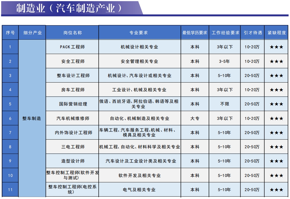 2023年安徽省重點(diǎn)領(lǐng)域急需緊缺人才需求目錄 為深入學(xué)習(xí)貫徹黨的二十大精神,認(rèn)真貫徹習(xí)近平總書記關(guān)于做好新時(shí)代人才工作的重要思想,全面貫徹落實(shí)安徽省委省政府實(shí)施人才興皖工程決策部署,充分發(fā)揮市場(chǎng)和政府在人力資源開發(fā)配置中的作用,加快打造人才發(fā)展和創(chuàng)新高地,服務(wù)“三地一區(qū)”和“七個(gè)強(qiáng)省”建設(shè),現(xiàn)編制《2023年安徽省重點(diǎn)領(lǐng)域急需緊缺人才需求目錄》(以下簡(jiǎn)稱《目錄》)。 一、編制背景 近年來,安徽大力實(shí)施人才強(qiáng)省戰(zhàn)略,人才集聚力更加強(qiáng)勁,創(chuàng)新策源力顯著提升,發(fā)展驅(qū)動(dòng)力不斷增強(qiáng)。當(dāng)前,安徽正處于厚積薄發(fā)、動(dòng)能強(qiáng)勁、大有可為的上升期、關(guān)鍵期,實(shí)現(xiàn)高質(zhì)量發(fā)展關(guān)鍵靠創(chuàng)新、根本在人才。省委省政府將大力實(shí)施人才興皖工程,加快打造具有重要影響力的人才發(fā)展和創(chuàng)新高地,作為當(dāng)前和今后一個(gè)時(shí)期全省人才發(fā)展的總定位、總牽引、總抓手,持續(xù)提升人才工作水平,積極開創(chuàng)“近悅遠(yuǎn)來”的人才工作新局面。 實(shí)現(xiàn)教育鏈、人才鏈、創(chuàng)新鏈、產(chǎn)業(yè)鏈深度融合并走在前列,成為我省人才工作的重要目標(biāo)之一。為深入掌握現(xiàn)階段我省經(jīng)濟(jì)社會(huì)發(fā)展對(duì)人才的需求狀況,切實(shí)增強(qiáng)全省人才“引育用留”的指導(dǎo)性和針對(duì)性,2023年9月至11月,省委組織部、省人力資源社會(huì)保障廳共同對(duì)全省重點(diǎn)領(lǐng)域和產(chǎn)業(yè)急需緊缺人才需求情況開展了調(diào)查研究,通過《目錄》編制發(fā)布,為全省各地精準(zhǔn)“引育用留”人才提供有益參考,為高校畢業(yè)生就業(yè)創(chuàng)業(yè)提供明晰指引,助推我省人力資源配置進(jìn)一步優(yōu)化。 二、編制原則 一是堅(jiān)持服務(wù)發(fā)展。《目錄》聚焦農(nóng)業(yè)、制造業(yè)、金融業(yè)等11個(gè)重點(diǎn)領(lǐng)域人才需求,覆蓋經(jīng)濟(jì)社會(huì)多個(gè)方面,符合安徽作為全國農(nóng)產(chǎn)品生產(chǎn)、能源、原材料和加工制造業(yè)基地的基本省情。制造業(yè)急需緊缺人才需求按新一代信息技術(shù)、高端裝備制造、汽車制造等12個(gè)產(chǎn)業(yè)進(jìn)一步細(xì)分,分別進(jìn)行編制,突出服務(wù)我省新能源汽車等萬億產(chǎn)業(yè)和人工智能等千億新興產(chǎn)業(yè)。 二是堅(jiān)持市場(chǎng)導(dǎo)向。《目錄》統(tǒng)一按照“細(xì)分產(chǎn)業(yè)-崗位名稱-專業(yè)要求-學(xué)歷要求-工作經(jīng)驗(yàn)-引才待遇-緊缺程度”體例編制,細(xì)化崗位、專業(yè)和學(xué)歷需求,量化工作經(jīng)驗(yàn)要求、引才待遇和緊缺程度,根據(jù)崗位需求匹配人才,符合人才招用和求職規(guī)律,便于供需雙方精準(zhǔn)對(duì)接, 三是堅(jiān)持科學(xué)編制。《目錄》采用定量研究和定性研究相結(jié)合的方法編制。前期深入研究我省國民經(jīng)濟(jì)“十四五”規(guī)劃、重點(diǎn)產(chǎn)業(yè)規(guī)劃以及各市產(chǎn)業(yè)政策,構(gòu)建全省急需緊缺崗位需求指數(shù),確定11個(gè)重點(diǎn)領(lǐng)域開展急需緊缺人才需求調(diào)查研究,采用政策研究、企業(yè)座談、問卷調(diào)查、數(shù)據(jù)分析等方式收集信息和資料,按照抽樣配比的原則,共調(diào)查企業(yè)單位16078家,收集有效急需緊缺崗位信息159510條?;谡{(diào)查結(jié)果和大數(shù)據(jù)基礎(chǔ),結(jié)合經(jīng)濟(jì)社會(huì)和產(chǎn)業(yè)發(fā)展現(xiàn)狀,構(gòu)建全省急需緊缺崗位需求指數(shù)體系,將945類急需緊缺崗位信息列入《目錄》, 四是堅(jiān)持務(wù)實(shí)管用?!赌夸洝肥秦瀼芈鋵?shí)安徽省委省政府大力實(shí)施人才興皖工程的具體舉措,以高效運(yùn)用為目標(biāo),致力于為人才供需雙方及有關(guān)方面提供切實(shí)有益的參考指導(dǎo)。《目錄》將于安徽先鋒網(wǎng)、安徽省人力資源社會(huì)保障廳官網(wǎng)、安徽公共招聘網(wǎng)、安徽人社公眾號(hào)發(fā)布,歡迎社會(huì)各屆關(guān)注查閱。 三、服務(wù)對(duì)象 (一)用人單位。企事業(yè)單位可參考《目錄》提供的緊缺崗位信息,優(yōu)化設(shè)置本單位類似崗位的具體需求,更好地引、育、用、留符合單位發(fā)展需要的人才,人力資源服務(wù)機(jī)構(gòu)可參考《目錄》提供的緊缺崗位信息,精準(zhǔn)匹配供需雙方,推動(dòng)人才有序流動(dòng)。 (二)求職人員。各類人才可參考《目錄》提供的緊缺崗位信息,有效開展求職工作,并根據(jù)相關(guān)崗位要求提升個(gè)人能力與專業(yè)水平。在校學(xué)生可參考崗位信息,開展未來相關(guān)職業(yè)規(guī)劃。 (三)教研機(jī)構(gòu)。普通高校、職業(yè)(技工)院??蓞⒖肌赌夸洝诽峁┑木o缺崗位信息,健全學(xué)科專業(yè)預(yù)測(cè)預(yù)警機(jī)制,動(dòng)態(tài)優(yōu)化調(diào)整專業(yè)設(shè)置,培育更多符合市場(chǎng)需求和產(chǎn)業(yè)發(fā)展需要的人才。 (四)政府部門。各級(jí)政府部門可參考《目錄》提供的緊缺崗位信息,結(jié)合本地產(chǎn)業(yè