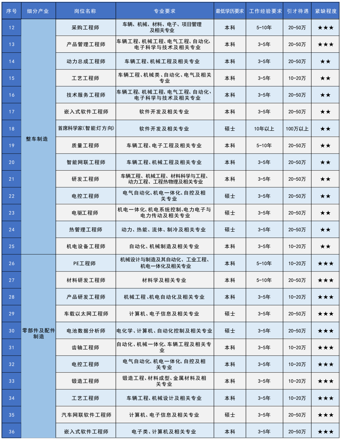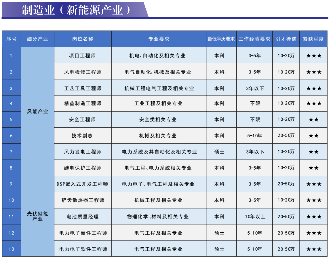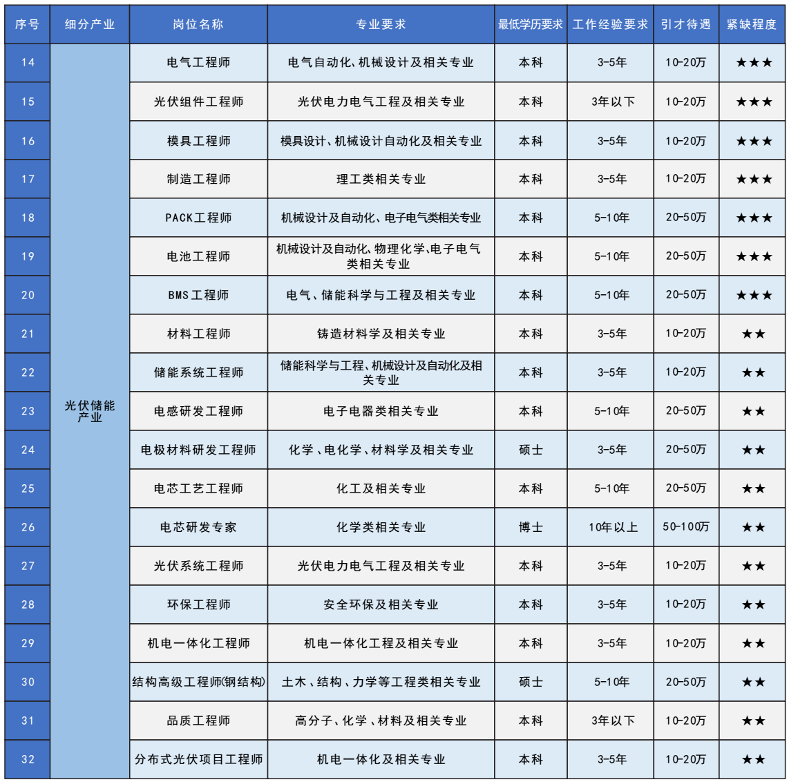 11月23日,安徽人社廳印發(fā)《2023年安徽省重點(diǎn)領(lǐng)域急需緊缺人才需求目錄》,其中新能源產(chǎn)業(yè)中,光伏儲(chǔ)能產(chǎn)業(yè)人才需求量,排名前五的地區(qū):合肥、滁州、六安、馬鞍山、淮北。從崗位緊缺程度來看,排名前五的依次是:鏟齒散熱器工程師、電池質(zhì)量經(jīng)理、電力電子硬件工程師、光伏組件工程師、儲(chǔ)能系統(tǒng)工程師。其中電芯研發(fā)專家崗位,最低學(xué)歷要求博士,工作經(jīng)驗(yàn)要求10年,待遇高達(dá)50-100萬。 新能源產(chǎn)業(yè)及汽車相關(guān)領(lǐng)域人才需求摘錄如下: