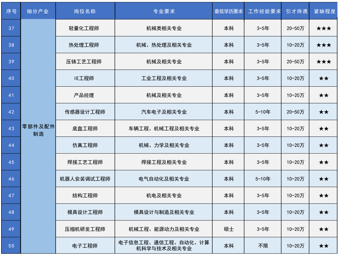 《目錄》以表格形式對(duì)每個(gè)行業(yè)中的細(xì)分產(chǎn)業(yè)、崗位名稱、專業(yè)要求、學(xué)歷要求、工作經(jīng)驗(yàn)、引才待遇和緊缺程度七個(gè)要素進(jìn)行描述。各要素說明如下: (一)細(xì)分產(chǎn)業(yè)。根據(jù)《國民經(jīng)濟(jì)行業(yè)分類》(GB/T4754-2017)、《安徽省國民經(jīng)濟(jì)和社會(huì)發(fā)展第十四個(gè)五年規(guī)劃和2035年遠(yuǎn)景目標(biāo)綱要》等文件,結(jié)合安徽產(chǎn)業(yè)發(fā)展現(xiàn)狀劃分,共66類。 (二)崗位名稱。根據(jù)《中華人民共和國職業(yè)分類大典》,結(jié)合用人單位實(shí)際情況確定。 (三)專業(yè)要求。所需人才的專業(yè)背景等方面相關(guān)要求,按照國家規(guī)定的專業(yè)名稱規(guī)范或職業(yè)院校專業(yè)名稱確定。 (四)學(xué)歷要求。所需人才的最低學(xué)歷要求,共有四個(gè)學(xué)歷層級(jí),分別為:大專、本科、碩士、博士。 (五)工作經(jīng)驗(yàn)。所需人才需要具備的工作時(shí)間,分別為:3年以下、3-5年、5-10年、10年以上、不限。 (六)引才待遇。為所需人才提供的薪資待遇共有五個(gè)層級(jí),分別為:10萬以下、10-20萬、20-50萬、50-100萬、100萬以上。 (七)緊缺程度,將崗位緊缺情況由高到低分為非常緊缺、比較緊缺、一般緊缺三類,分別以“★★★”、“★★”、“★”標(biāo)記。