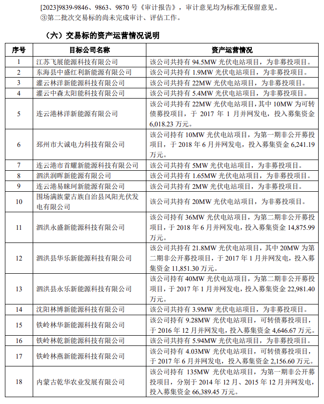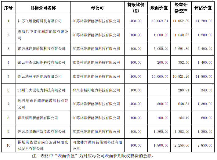 11月28日,林洋能源公告,林洋能源及下屬子公司擬與上海羲融新能源有限公司簽訂項目并購框架協(xié)議,將持有的18個全資下屬公司100%股權轉讓給羲融新能源,股權轉讓對價合計為118282.05萬元。 林洋能源表示,基于業(yè)務發(fā)展和戰(zhàn)略規(guī)劃,為進一步優(yōu)化電站資產結構,降低應收賬款中的可再生能源補貼,提高資金使用效率,加強與合作伙伴的合作關系,公司擬將18個下屬子公司100%股權進行轉讓,交易涉及部分公司第一次非公開發(fā)行股票、第二次非公開發(fā)行股票和公開發(fā)行可轉債募投項目。林洋能源認為,本次出售電站有利于盤活資產、回籠資金,減少應收賬款,降低資產負債率,持續(xù)優(yōu)化資產。同時公司將回籠資金繼續(xù)投資開發(fā)建設儲備項目及培育新的利潤增長點,提升公司整體的盈利能力,促進公司健康可持續(xù)發(fā)展。 公告顯示,除了林洋能源之外,同時簽署協(xié)議的還包括其下屬子公司江蘇林洋新能源科技有限公司、邳州市城陽電力科技有限公司、河北林洋微網新能源科技有限公司、遼寧林洋新能源科技有限公司和沈陽林洋新能源科技有限公司。 上海羲融新能源有限公司,成立日期2023年9月5日,為國家電投控股公司,其中電投融和新能源發(fā)展有限公司持股65%,上海電力股份有限公司持股35%。截至2022年12月31日,電投融和新能源發(fā)展有限公司總資產1176.26億元,凈資產200.21億元,2022年度營業(yè)收入48.26億元,凈利潤15.87億元;截至2023年9月30日,總資產1400.54億元,凈資產231.46億元,2023年 1-9月營業(yè)收入59.89億元,凈利潤18.21億元。 本框架協(xié)議中第一批次10個目標公司包括:江蘇飛展能源科技有限公司、東海縣中盛紅利新能源有限公司、灌云林洋新能源科技有限公司、灌云中森太陽能科技有限公司、連云港林洋新能源有限公司、邳州市大誠電力科技有限公司、連云港市首耀新能源科技有限公司、泗洪潤暉新能源有限公司、連云港易睞珂新能源有限公司、圍場滿族蒙古族自治縣風陽光伏發(fā)電有限公司共10個全資下屬公司100%股權。轉讓對價合計為35584.33萬元。 第二批次:泗洪永盛新能源科技有限公司、泗洪縣華樂新能源科技有限公司、泗洪縣永樂新能源科技有限公司、沈陽林博新能源科技有限公司、鐵嶺林華新能源科技有限公司、鐵嶺林乾新能源科技有限公司、鐵嶺林燕新能源科技有限公司、內蒙古乾華農業(yè)發(fā)展有限公司共8個全資下屬公司100%股權。 標的資產的凈資產賬面值合計為33622.29萬元,評估價值合計為39390萬元,評估增值合計為5,767.71萬元,增值率約17.15%。經雙方友好協(xié)商,結合目標公司和標的股權的實際情況,最終確定目標公司的轉讓價格合計為35584.33萬元。 第一批次評估情況如下(單位:萬元):