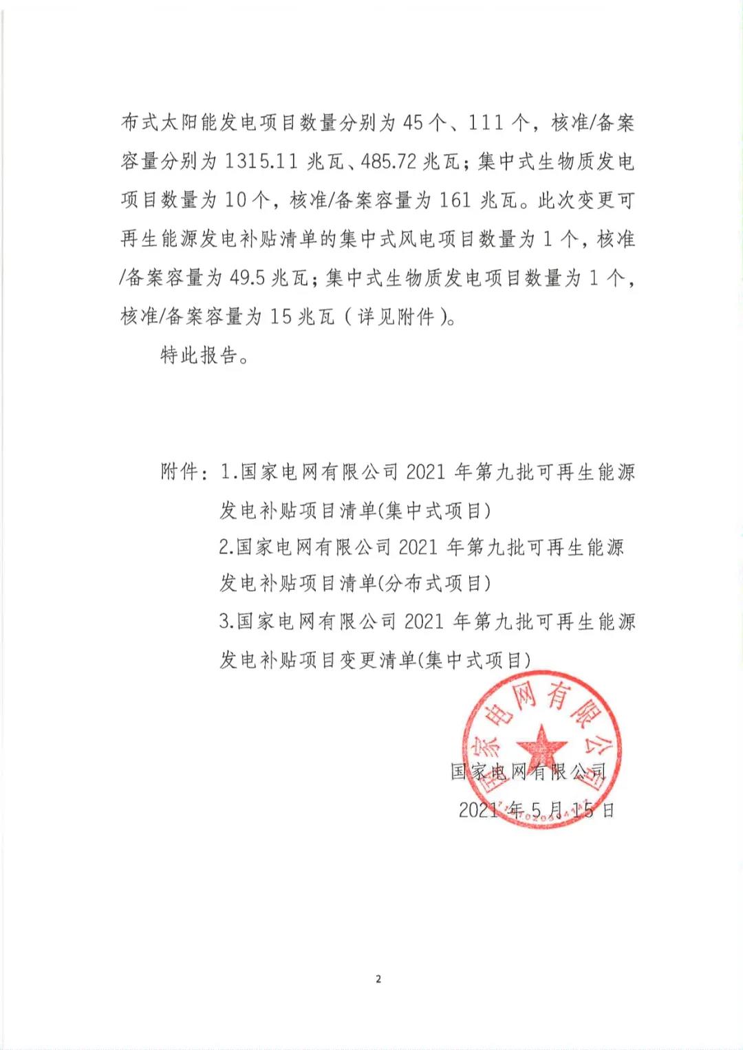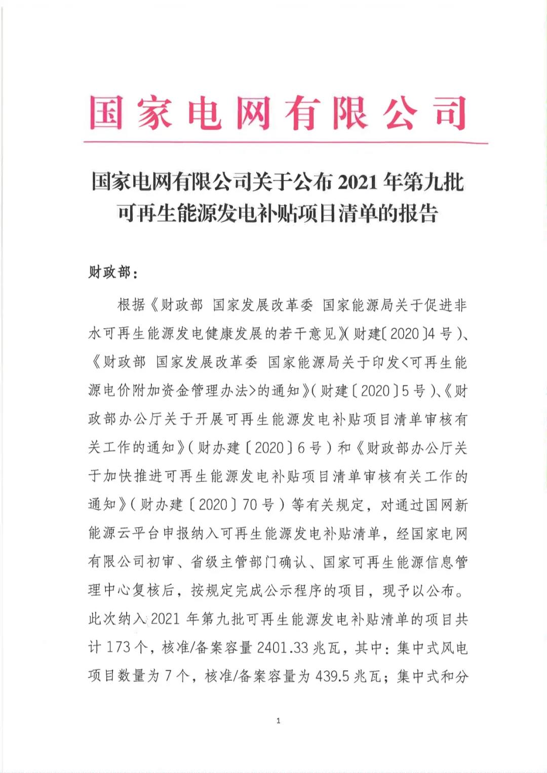 日前,國家電網(wǎng)公布了2021年第九批可再生能源發(fā)電補(bǔ)貼項(xiàng)目清單,其中集中式和分布式光伏項(xiàng)目共156個(gè),總裝機(jī)容量為1800.83MW。 關(guān)于公布2021年第九批可再生能源發(fā)電補(bǔ)貼項(xiàng)目清單的公告 根據(jù)《財(cái)政部國家發(fā)展改革委國家能源局關(guān)于促進(jìn)非水可再生能源發(fā)電健康發(fā)展的若干意見》(財(cái)建〔2020〕4號(hào))、《財(cái)政部國家發(fā)展改革委國家能源局關(guān)于印發(fā)<可再生能源電價(jià)附加資金管理辦法>的通知》(財(cái)建〔2020〕5號(hào))、《財(cái)政部辦公廳關(guān)于開展可再生能源發(fā)電補(bǔ)貼項(xiàng)目清單審核有關(guān)工作的通知》(財(cái)辦建〔2020〕6號(hào))和《財(cái)政部辦公廳關(guān)于加快推進(jìn)可再生能源發(fā)電補(bǔ)貼項(xiàng)目清單審核有關(guān)工作的通知》(財(cái)辦建〔2020〕70號(hào))等有關(guān)規(guī)定,國家電網(wǎng)有限公司積極配合各省級(jí)能源主管部門和國家可再生能源信息管理中心,為符合中央財(cái)政補(bǔ)助條件的可再生能源發(fā)電項(xiàng)目提供補(bǔ)貼清單申報(bào)服務(wù)。 2021年5月15日,我公司已將完成公示的2021年第九批可再生能源發(fā)電項(xiàng)目補(bǔ)貼項(xiàng)目清單上報(bào)國家主管部門,第九批項(xiàng)目清單及后續(xù)項(xiàng)目審核進(jìn)展情況,請(qǐng)登錄新能源云平臺(tái)查詢。 國家電網(wǎng)有限公司 2021年5月15日